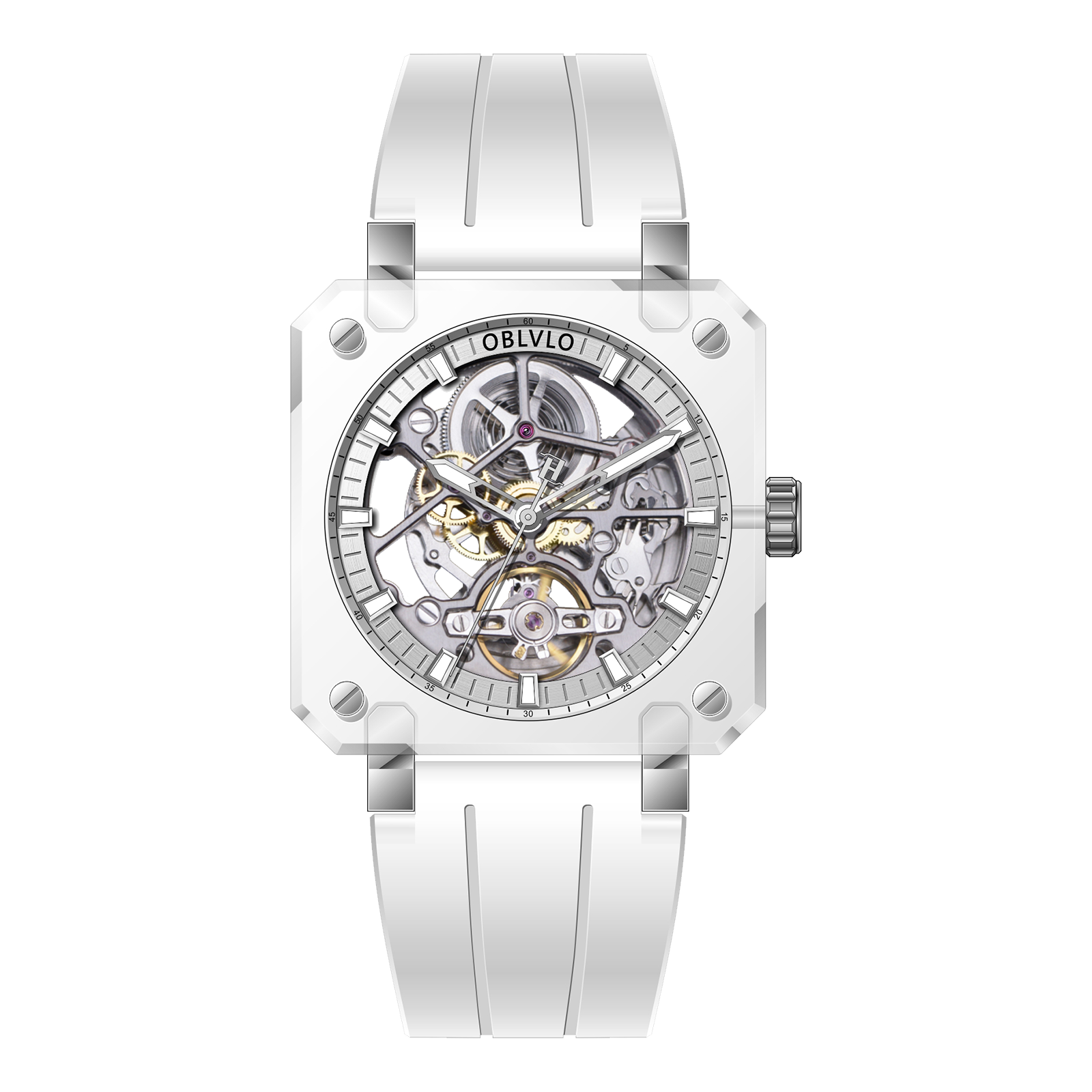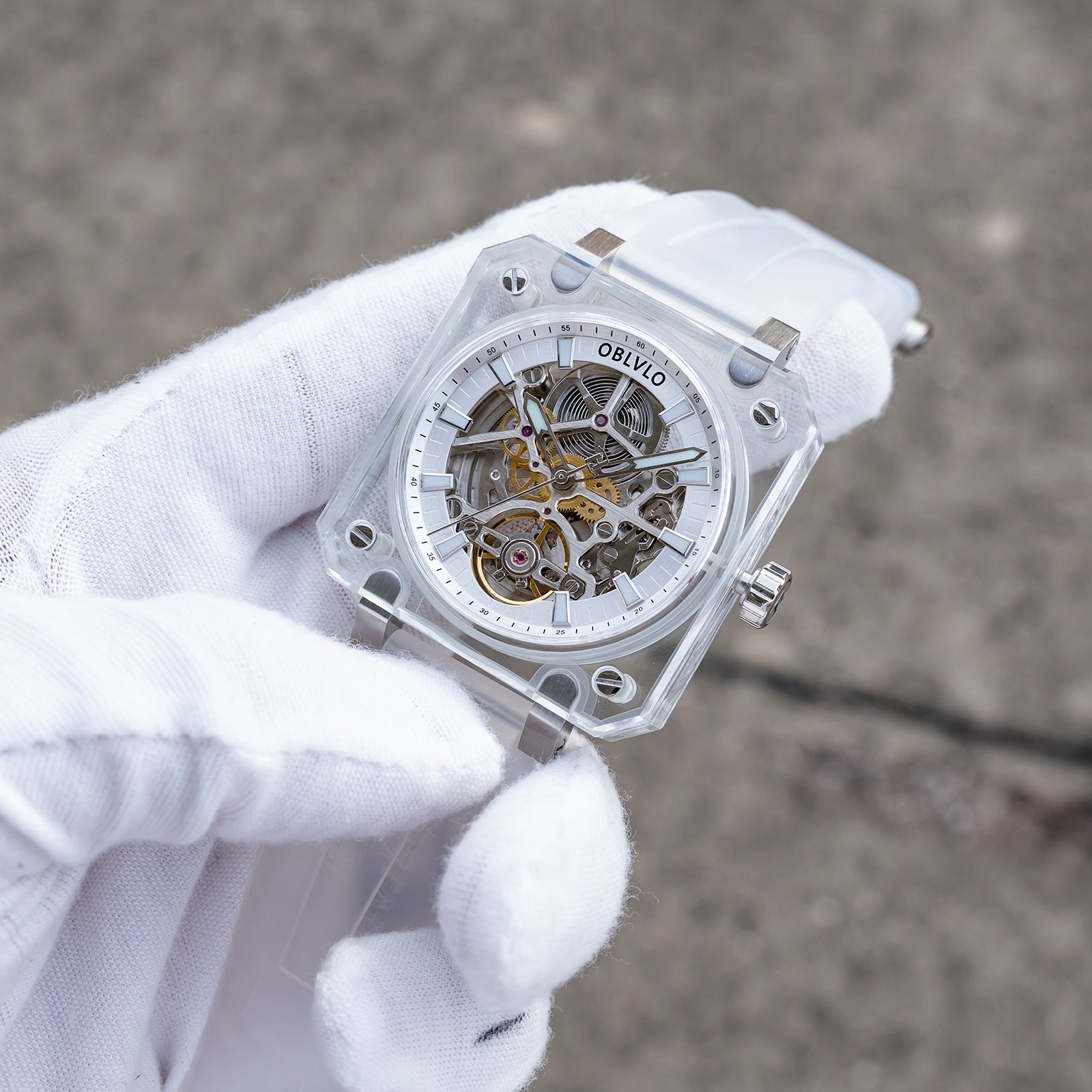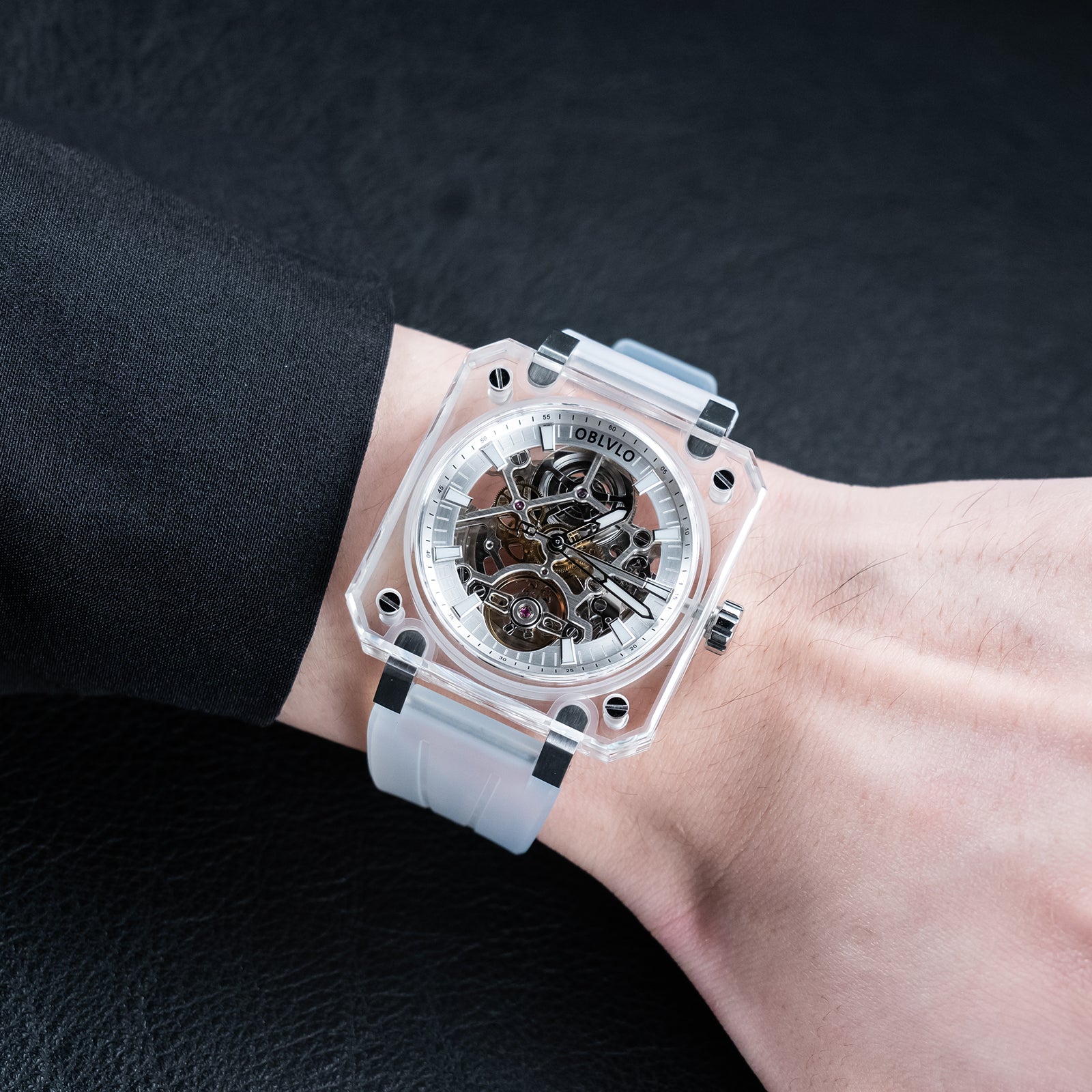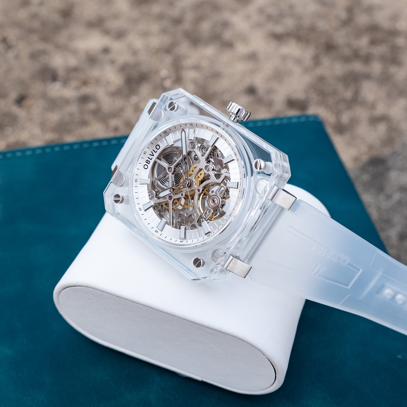 Dial Design: Silver Dial & The square crystal case is paired with a hollow dial design, Fully transparent sapphire case offers a 360-degree view of the escapement, revealing the movement's breathtaking skeletonization.