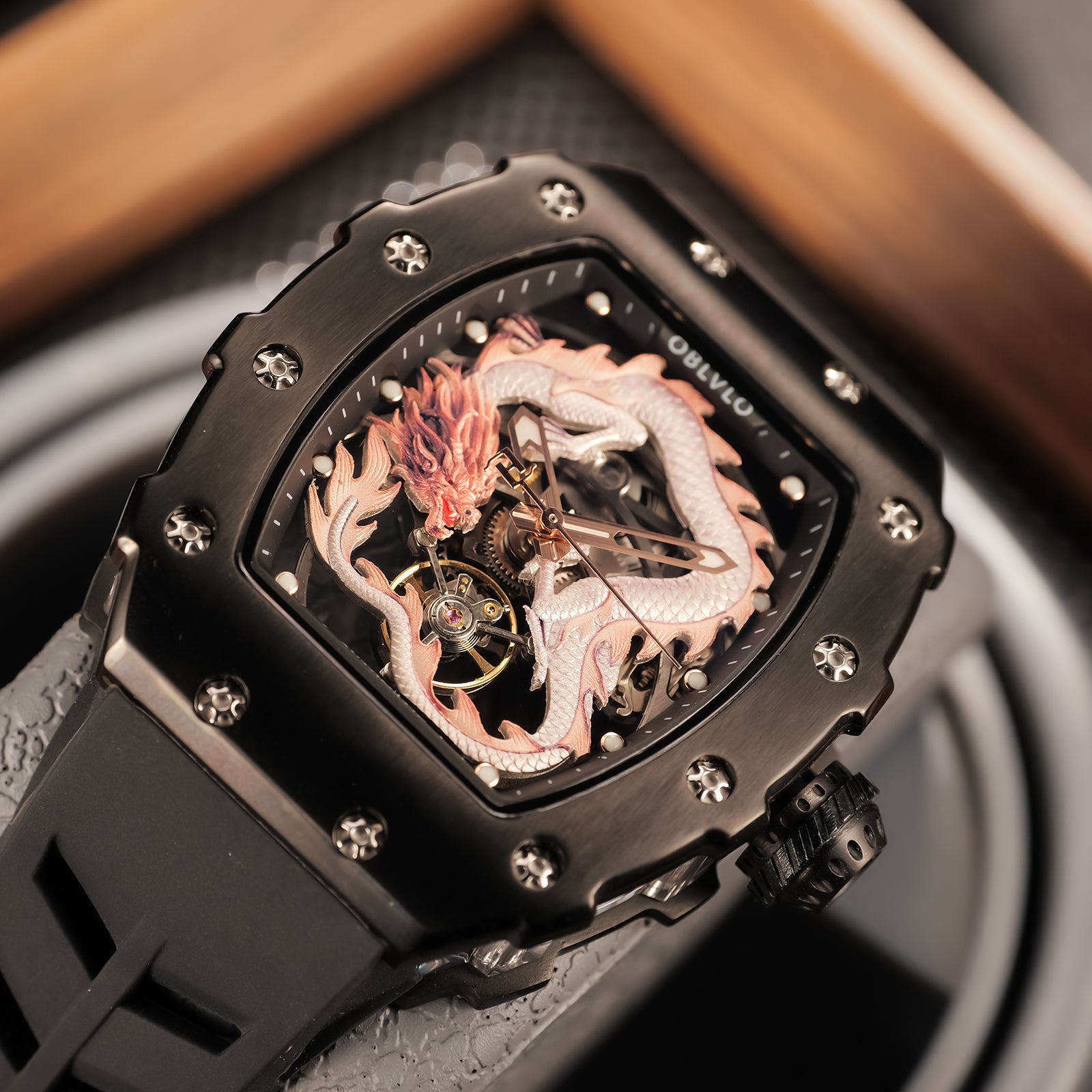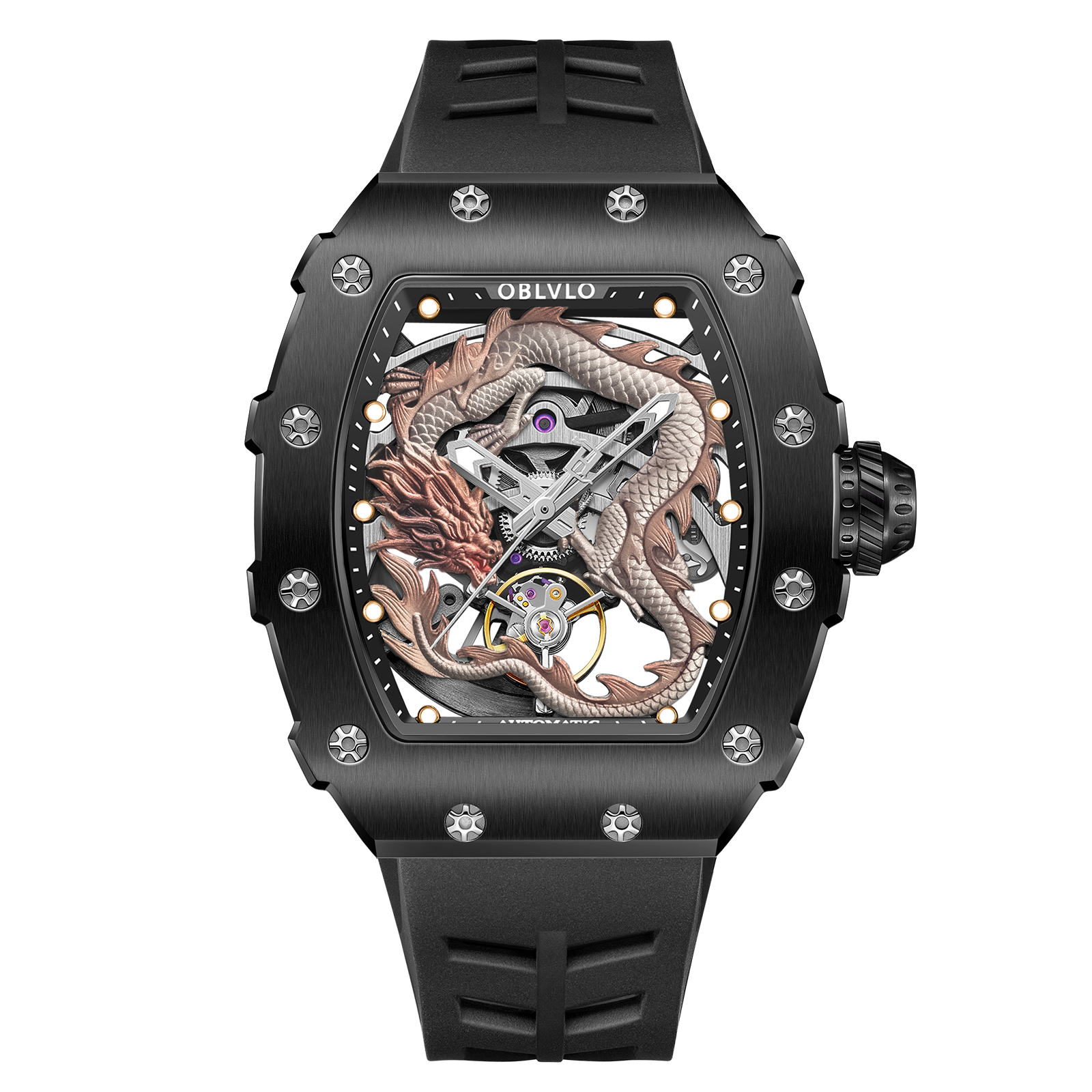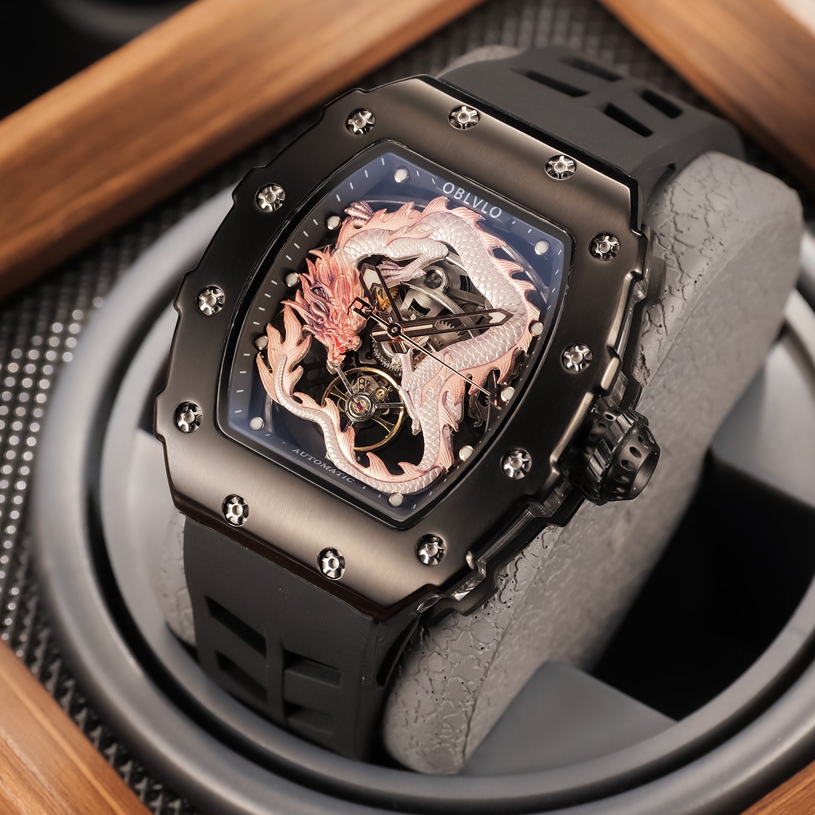 In the realm of men's fashion and luxury watches, the OBLVLO XM DRAGON Series stands out as a unique and affordable option for those seeking something extraordinary. Featuring a distinctive tonneau case shape crafted from 316 stainless steel plated with Black PVD, these watches exude a sense of sophistication and style. The Skeleton Dial, adorned with a delicate Light Pink Chinese Dragon motif, adds a touch of mystique and intrigue to the timepiece.