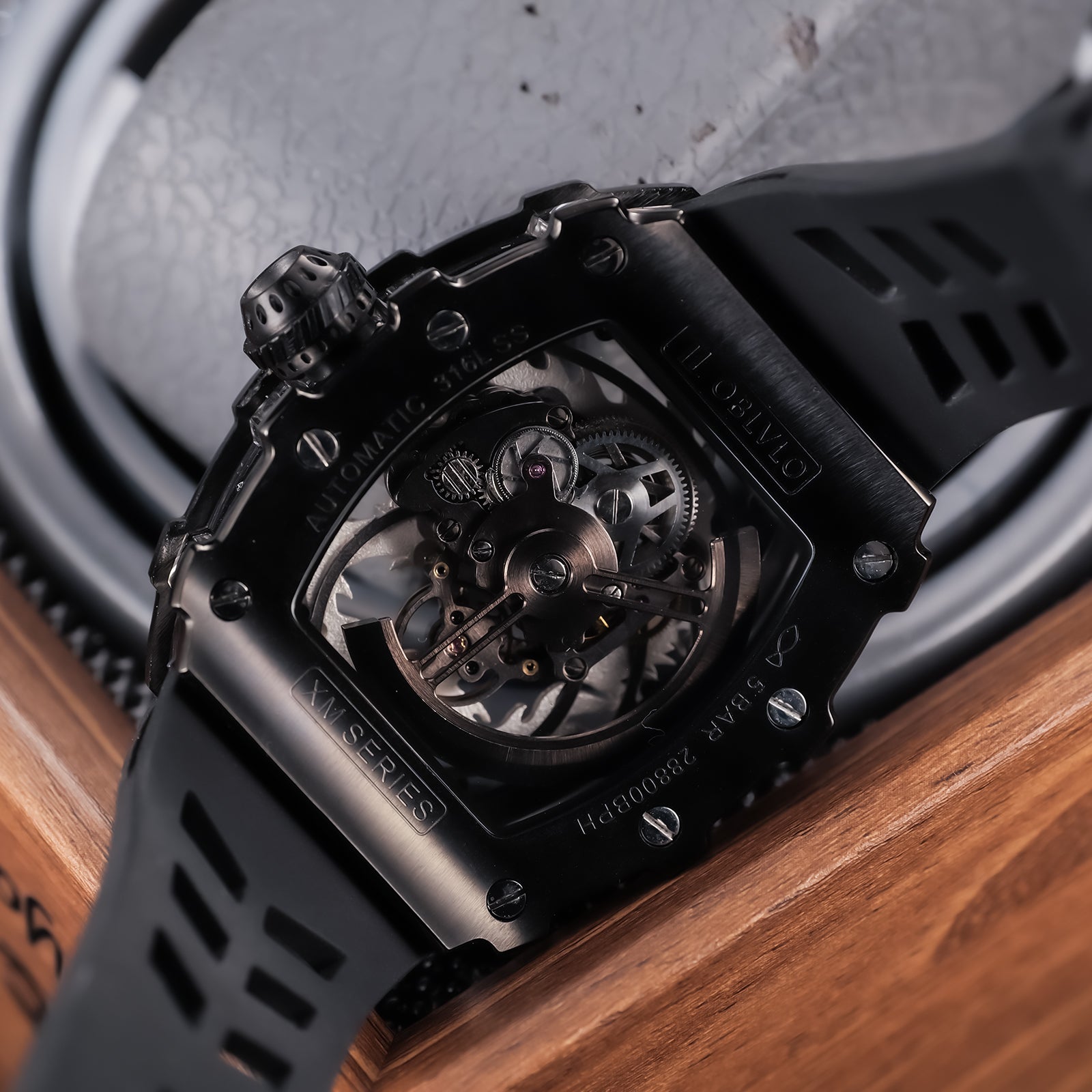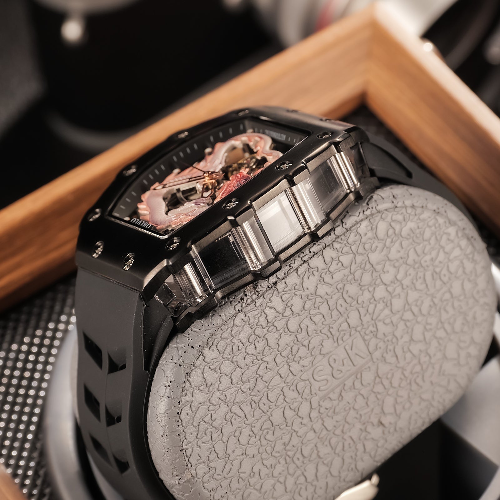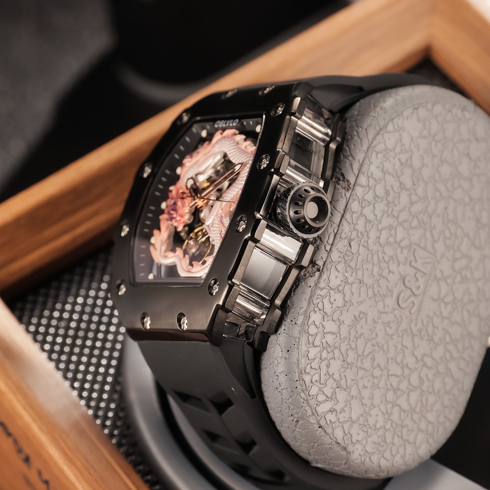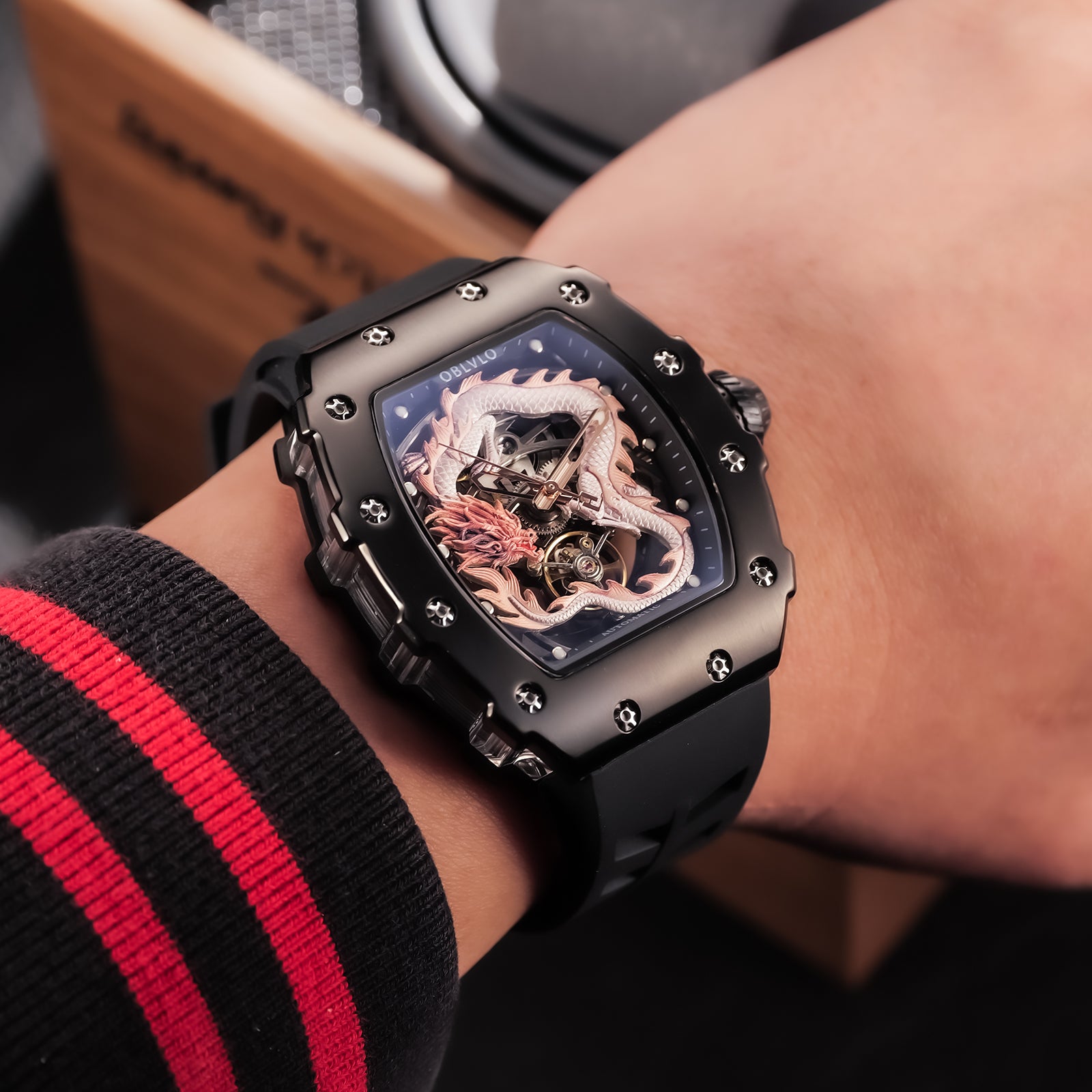 In the realm of men's fashion and luxury watches, the OBLVLO XM DRAGON Series stands out as a unique and affordable option for those seeking something extraordinary. Featuring a distinctive tonneau case shape crafted from 316 stainless steel plated with Black PVD, these watches exude a sense of sophistication and style. The Skeleton Dial, adorned with a delicate Light Pink Chinese Dragon motif, adds a touch of mystique and intrigue to the timepiece.