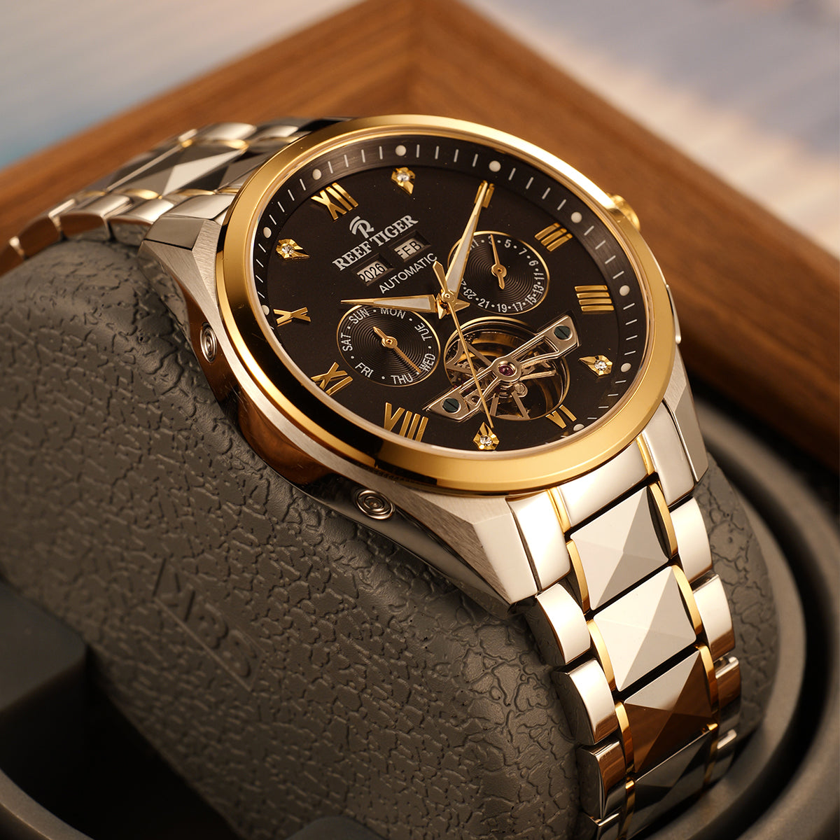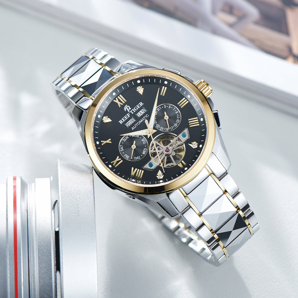 Dial Design: Black Dial, Watch face is designed with year, month, date, day, luminous hands display & tourbillon style dial.