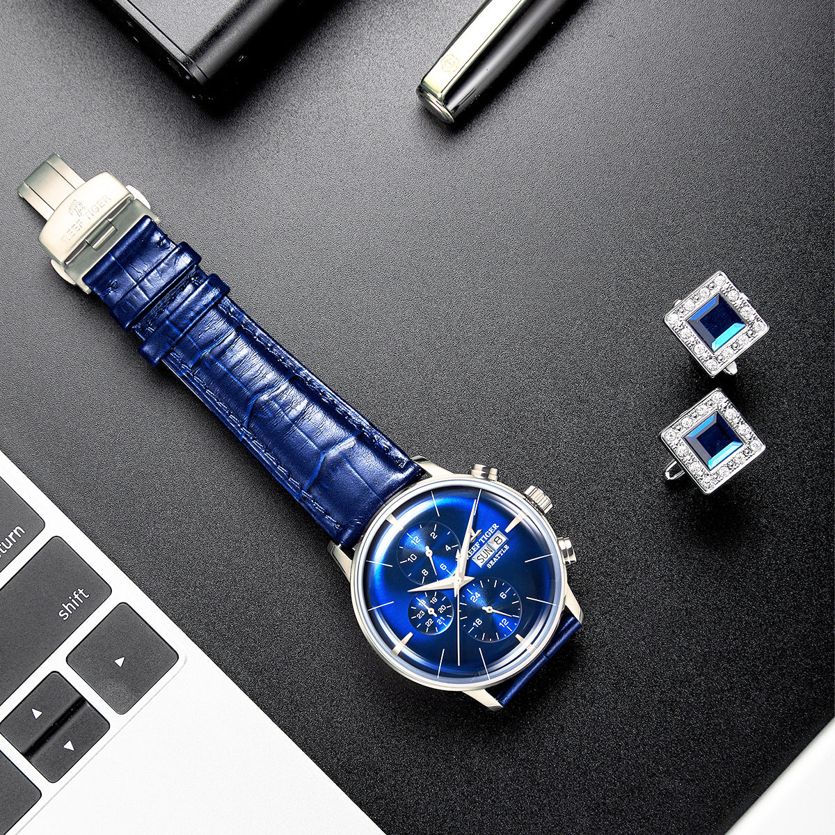 Enhancing the elegance of the watch is the glass face made of scratch-resistant sapphire crystal, providing a clear view of the intricate dial and ensuring long-lasting durability. The strap of the watch is crafted from luxurious Blue Italian Calfskin, adding a touch of refinement and comfort to the overall design.