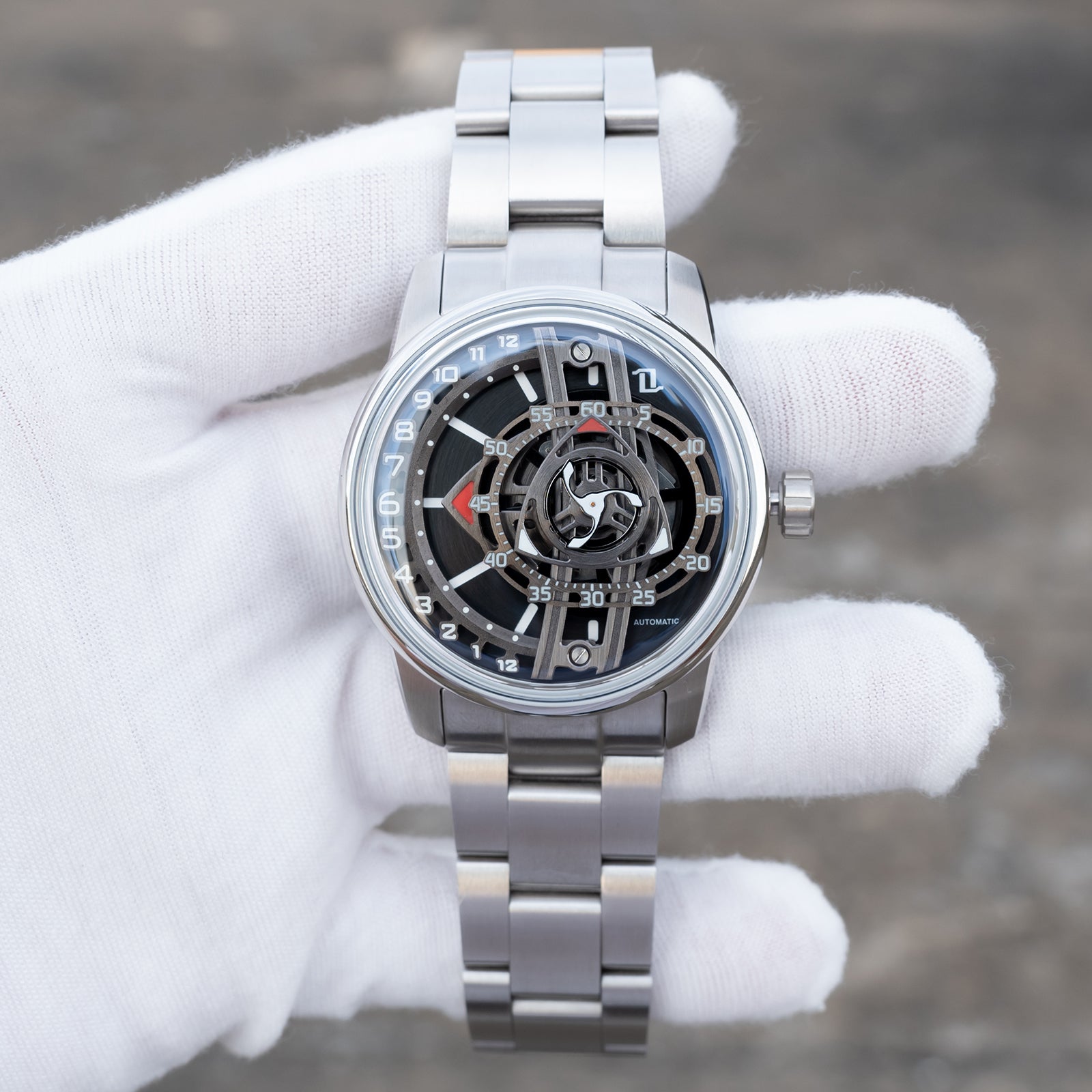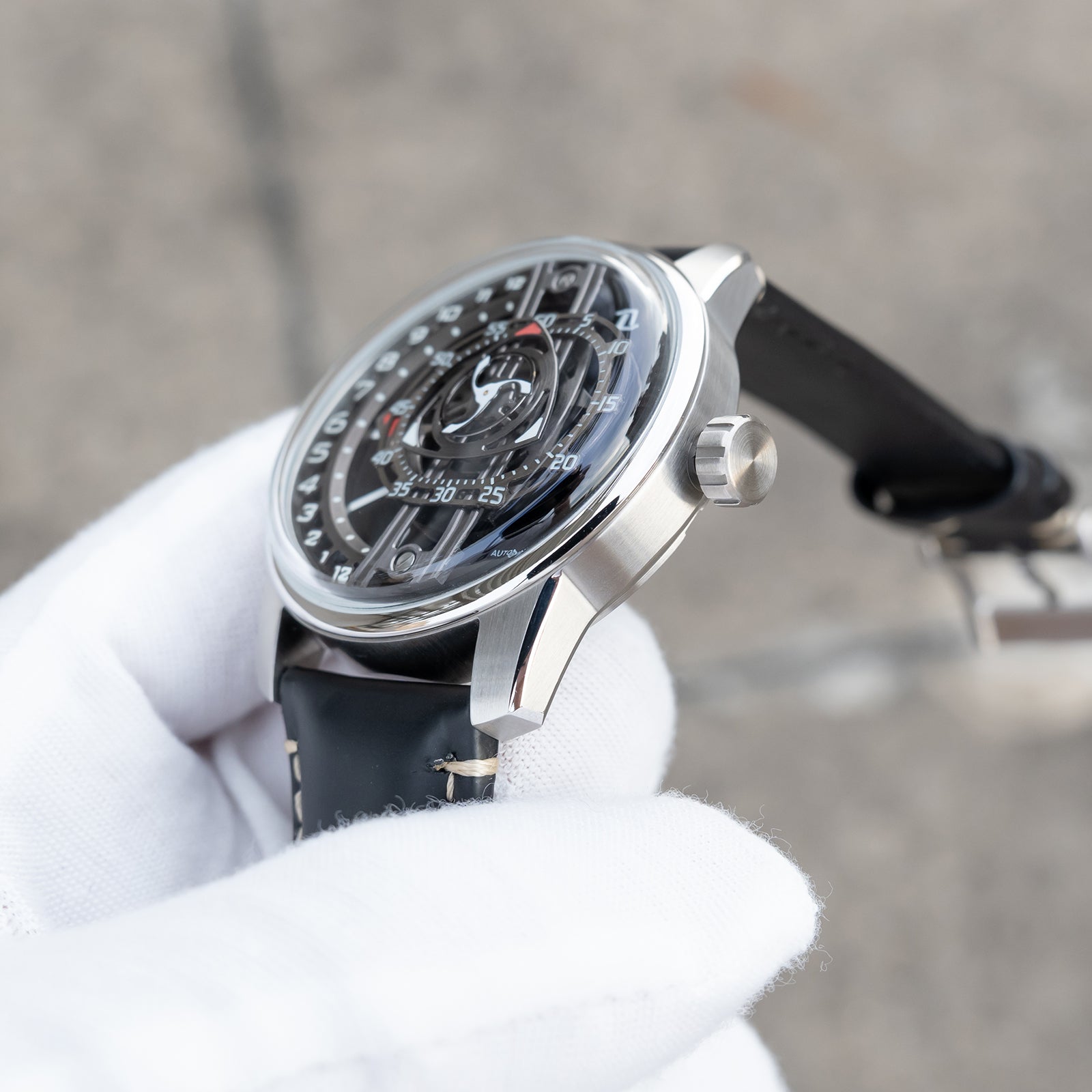 Zifferblatt: Schwarzes, einzigartiges Skelett-Zifferblatt und Sport-Zifferblatt mit Rotationsmotor