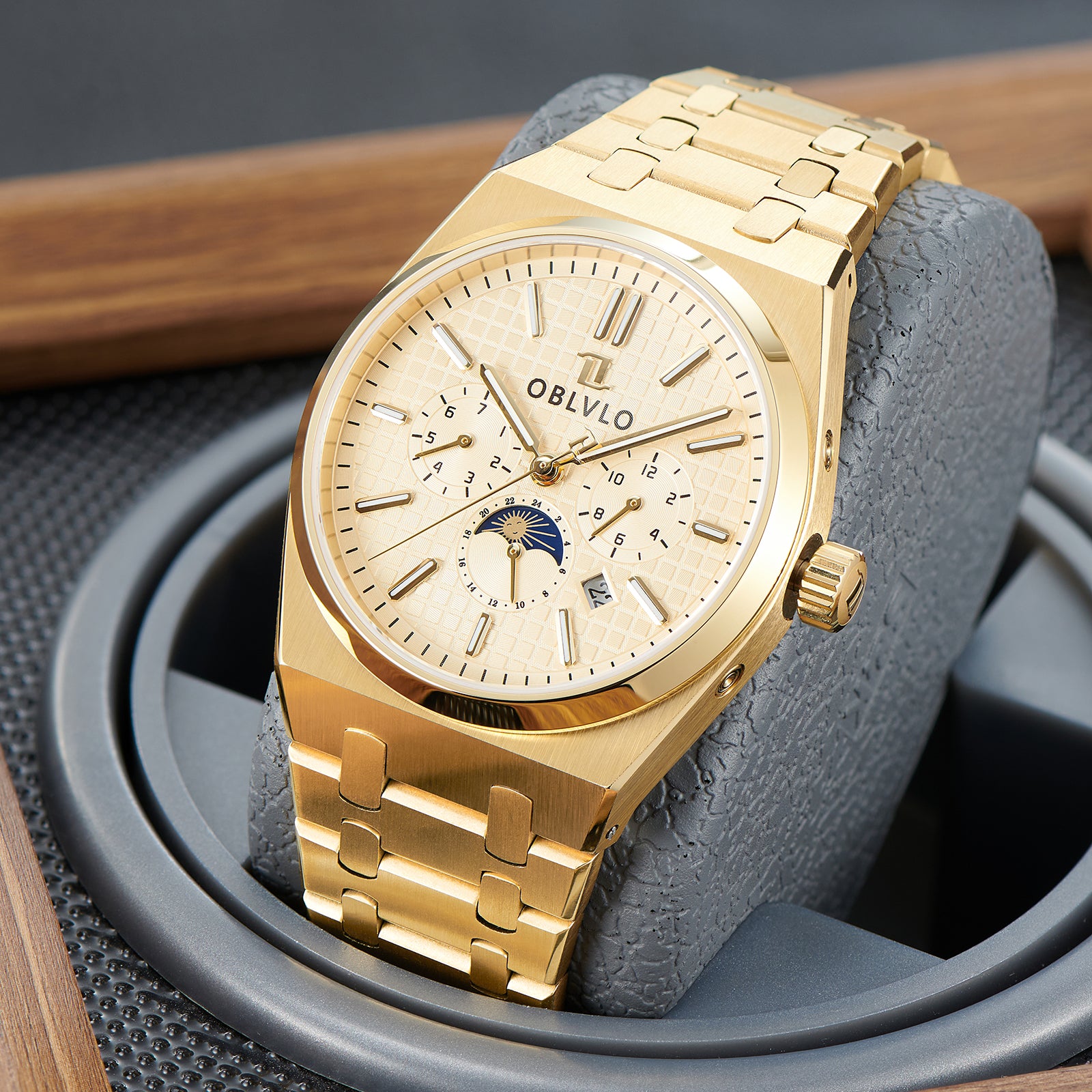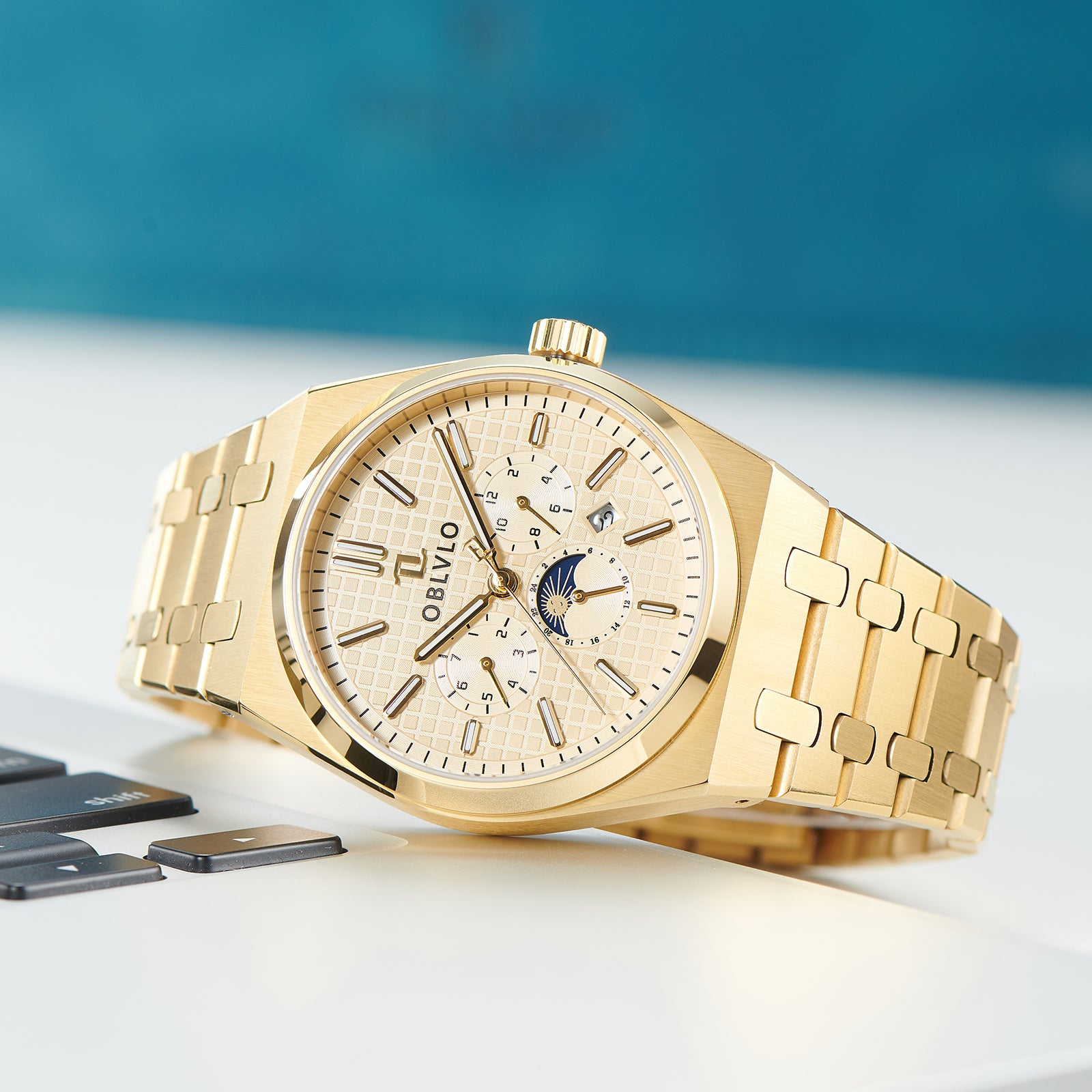 Erleben Sie Luxus und Funktionalität mit der gelbgoldenen OBLVLO TM-MUT 3-Eye Herrenuhr – ein perfektes Beispiel für eine moderne Automatikuhr, die ein Statement setzt. Ob Sie sich für ein wichtiges Meeting schick machen oder einen entspannten Tag genießen, diese Uhr ergänzt jedes Outfit perfekt.