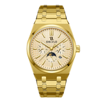 Gehäusedesign: Die Uhr verfügt über ein einzigartiges, rundes und sechseckiges Gehäuse aus robustem, gelbvergoldetem 316er Edelstahl, das Eleganz und Strapazierfähigkeit vereint. Der Gehäusedurchmesser von 41 mm und die Gehäusehöhe von 11 mm sorgen für einen angenehmen Tragekomfort an jedem Handgelenk.