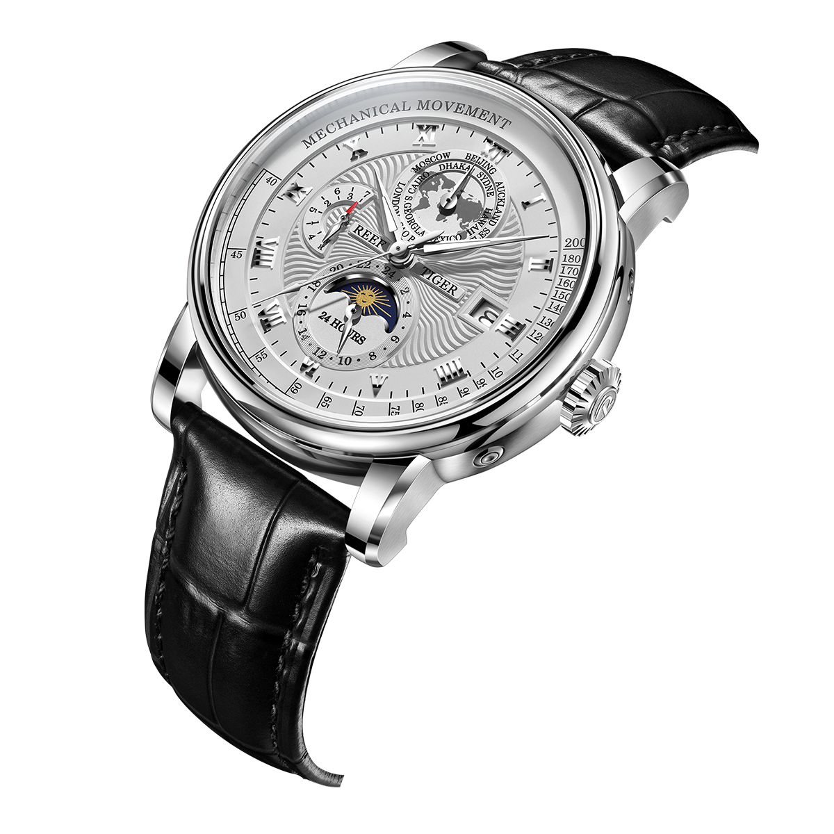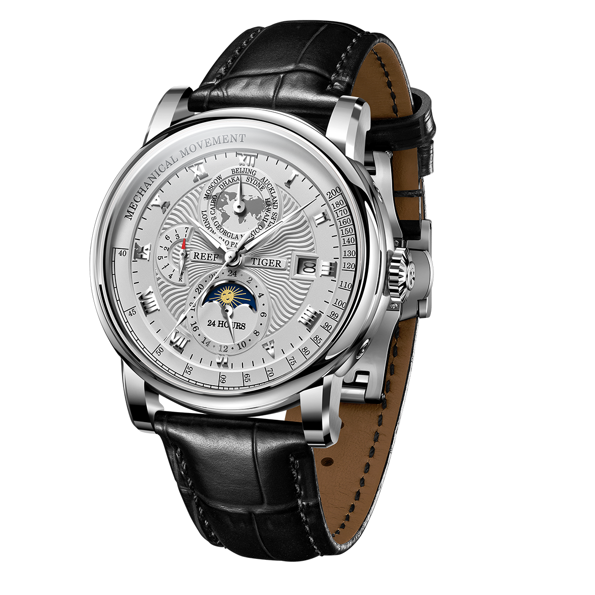 Zifferblattdesign: Weißes Zifferblatt und Uhrenglas mit vereinfachter Weltzeit auf 12-Uhr-Position, 3 Stunden mit Kalenderfenster, 6 Stunden Tag-/Nacht-/24-Stunden-Anzeige und Zifferblatt im Mondphasenstil.