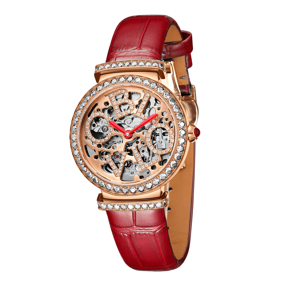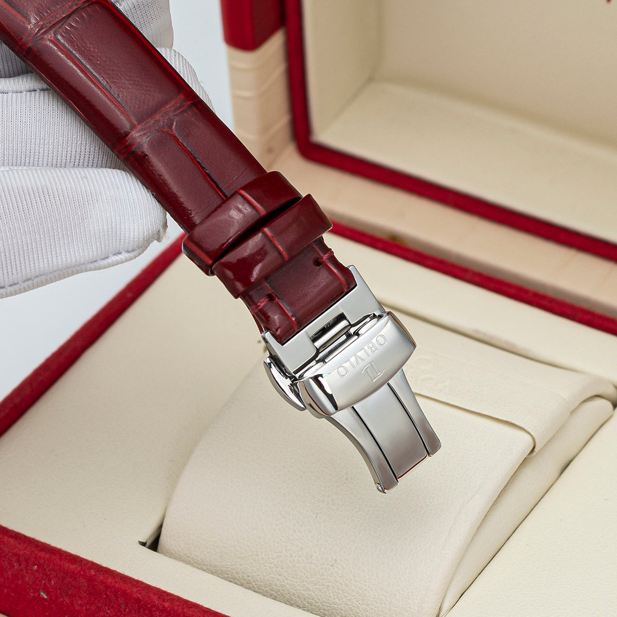 Als Damenuhr der OBLVLO BW-Serie verfügt diese Damenuhr mit weißen Diamanten in Roségold (BW-RRWE) über ein 34-mm-Gehäuse aus Roségold und Swarovski-Strasssteinen. Ein Echtlederarmband sichert die Uhr am Handgelenk.