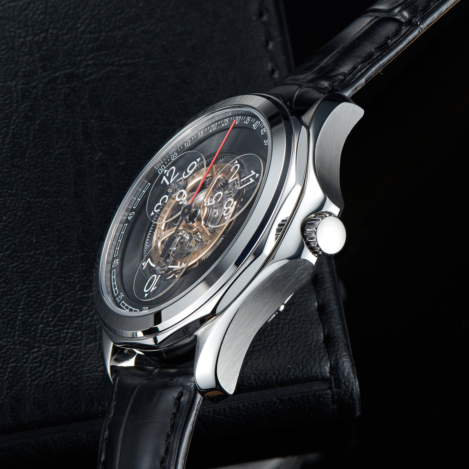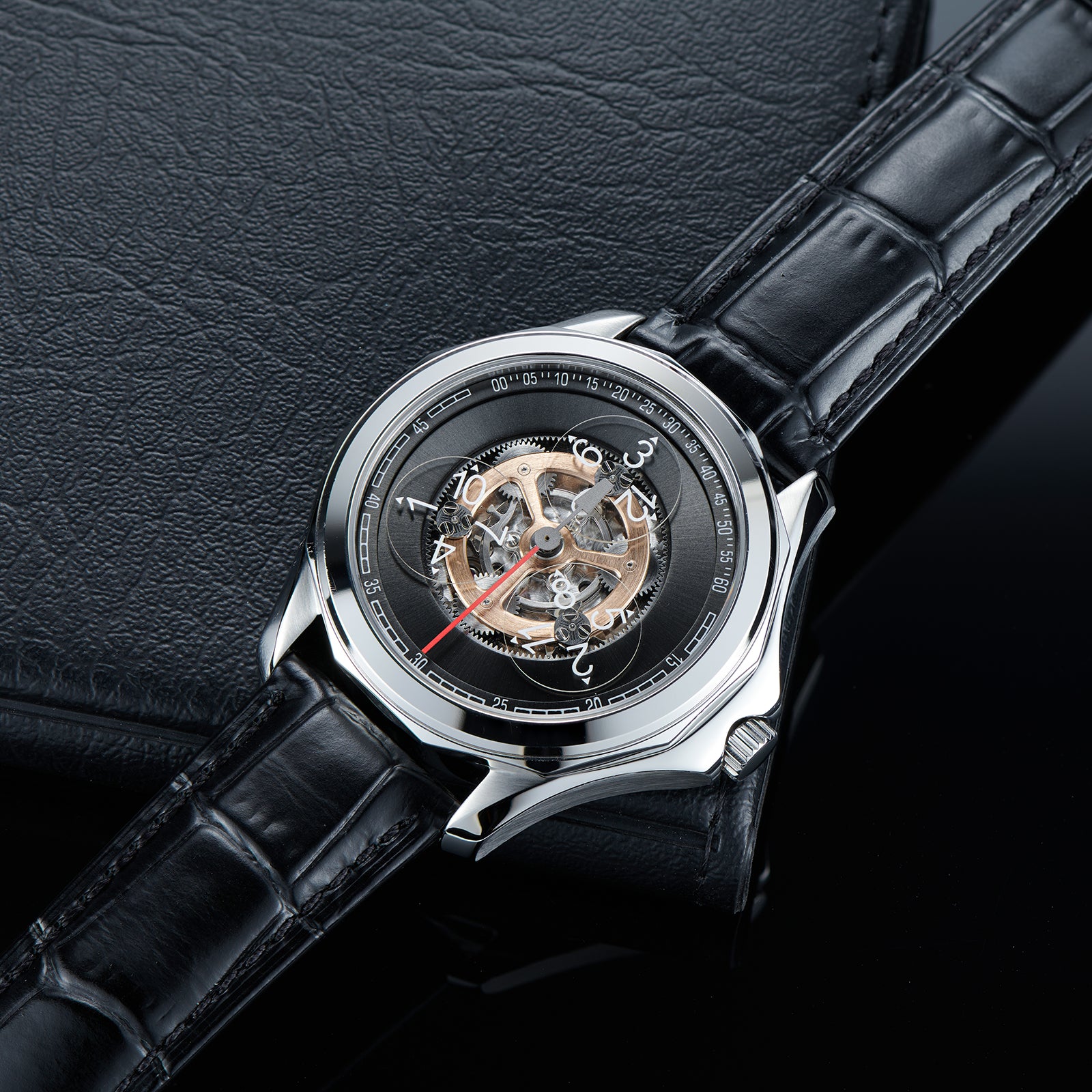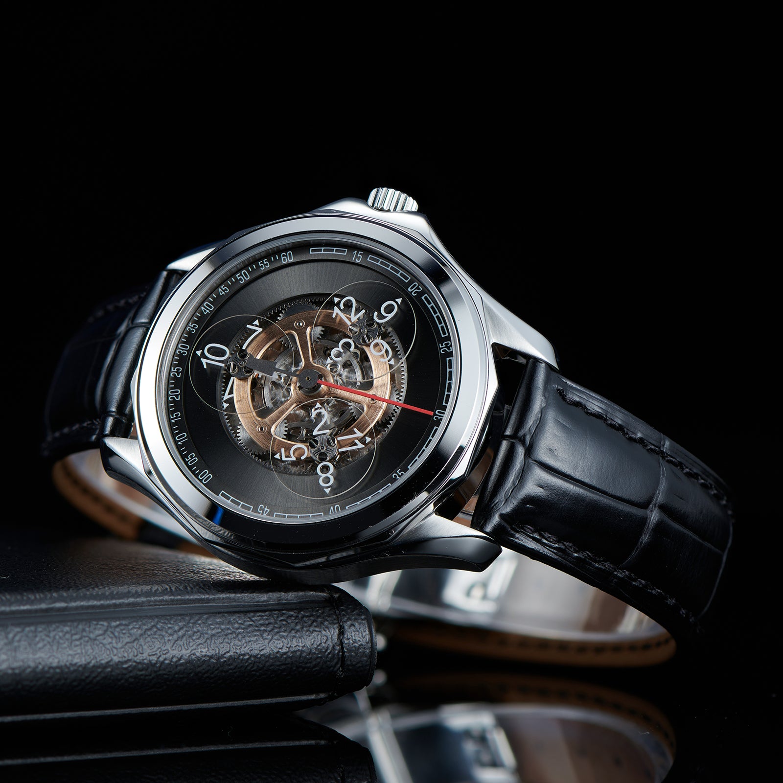 Zifferblatt: Schwarzer Farbverlauf und schwarze Lünette, automatische mechanische Skelettindizes und Zeiger mit Leuchtbeschichtung