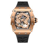 Diese präzise gefertigten Skelettuhren bestechen durch ihr markantes Tonneau-Gehäuse aus 316er Edelstahl mit luxuriöser Roségold-Beschichtung. Das Skelett-Zifferblatt offenbart die komplexe Mechanik, während das markante Element eines chinesischen Drachens aus Roségold der Uhr einen Hauch von Tradition und Mystik verleiht.