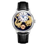 The dial is carefully carved in gold color to depict a majestic dragon soaring through the starry sky and The Moon Phase was replaced by a giant dragon orbiting the Earth From Chinese Dragon Playing with Pearl.