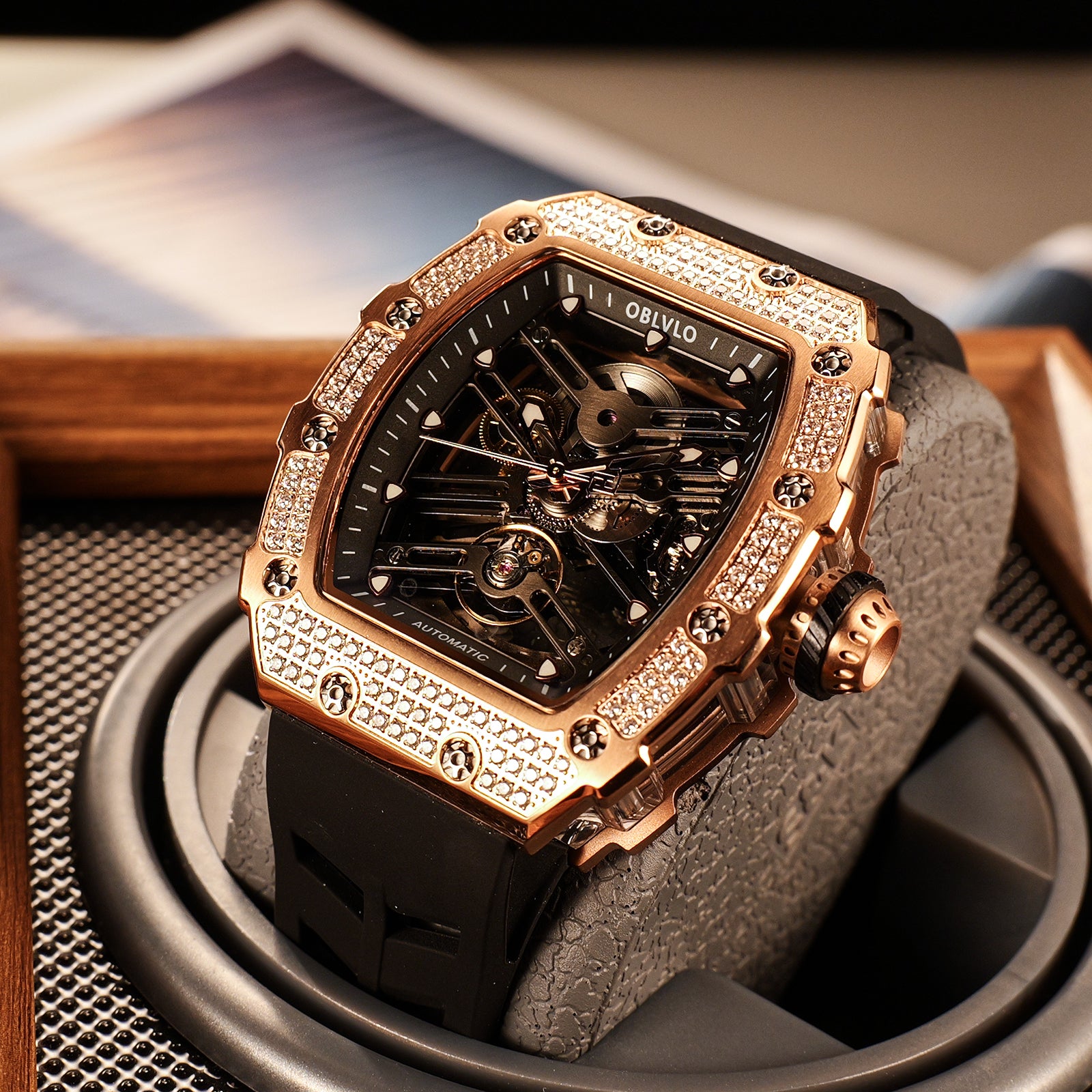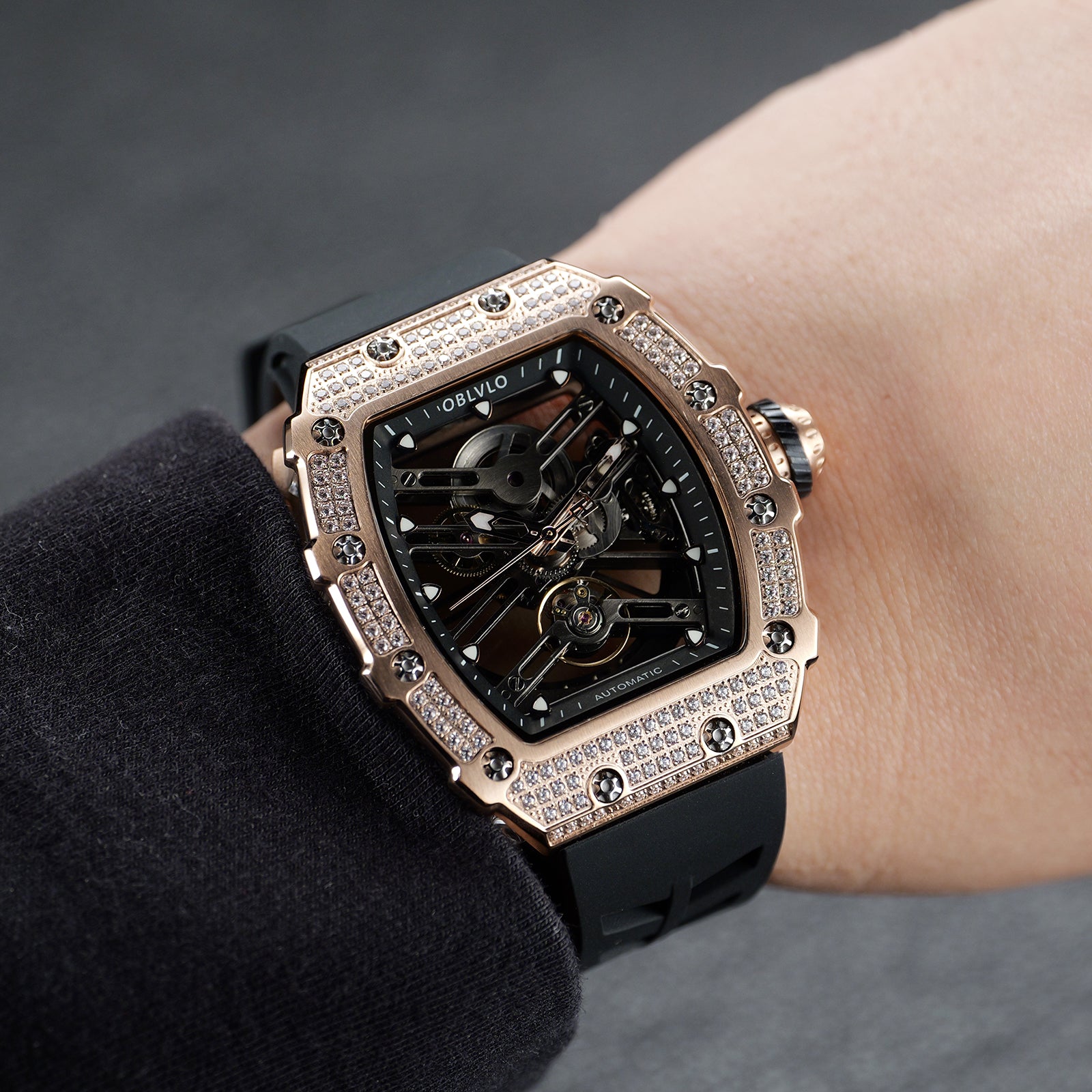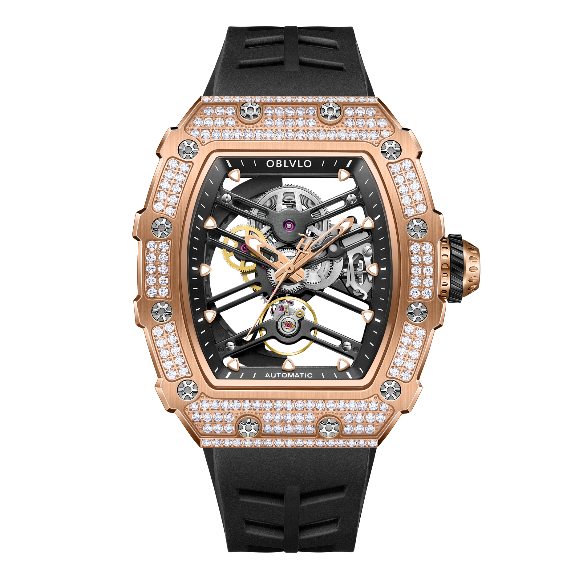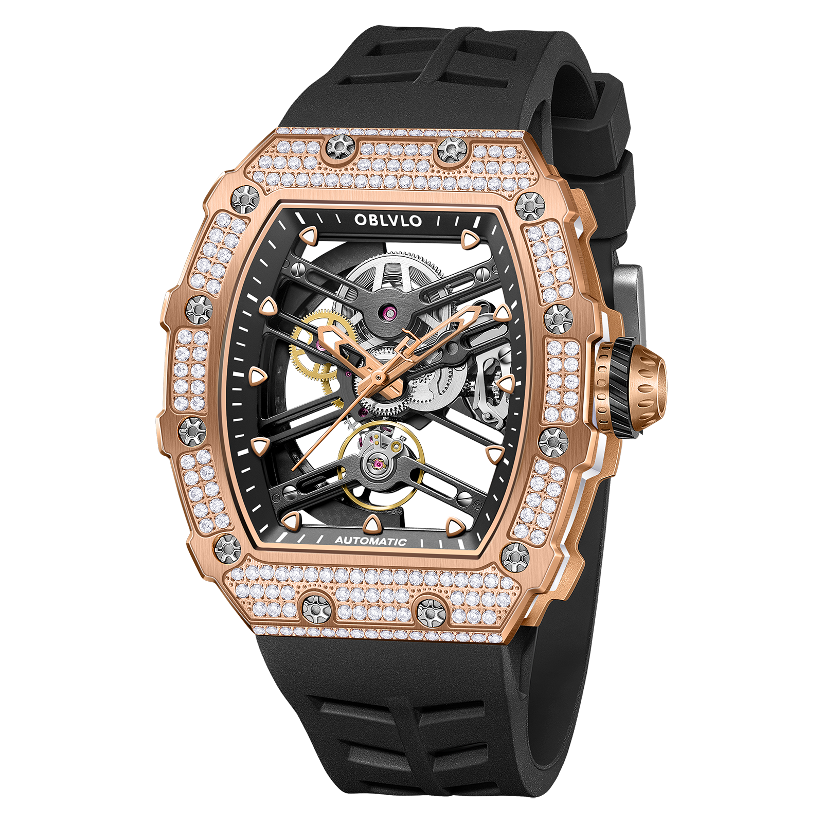 Luxury affordability with the OBLVLO XM XSK series of men's watches. Crafted with precision and style, these rose gold mechanical skeleton diamond timepieces are the epitome of elegance and sophistication. The tonneau-shaped case, made of 316 stainless steel plated with rose gold and adorned with Swarovski crystal white diamonds on the bezel, exudes a sense of opulence and luxury.