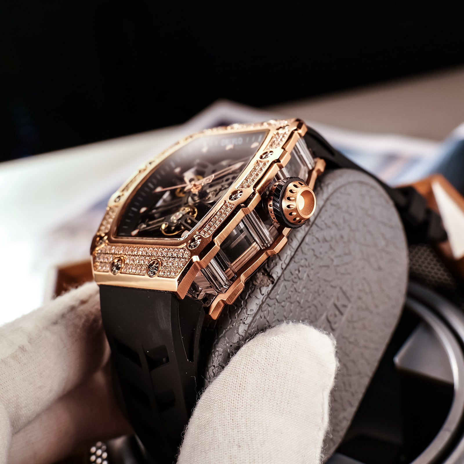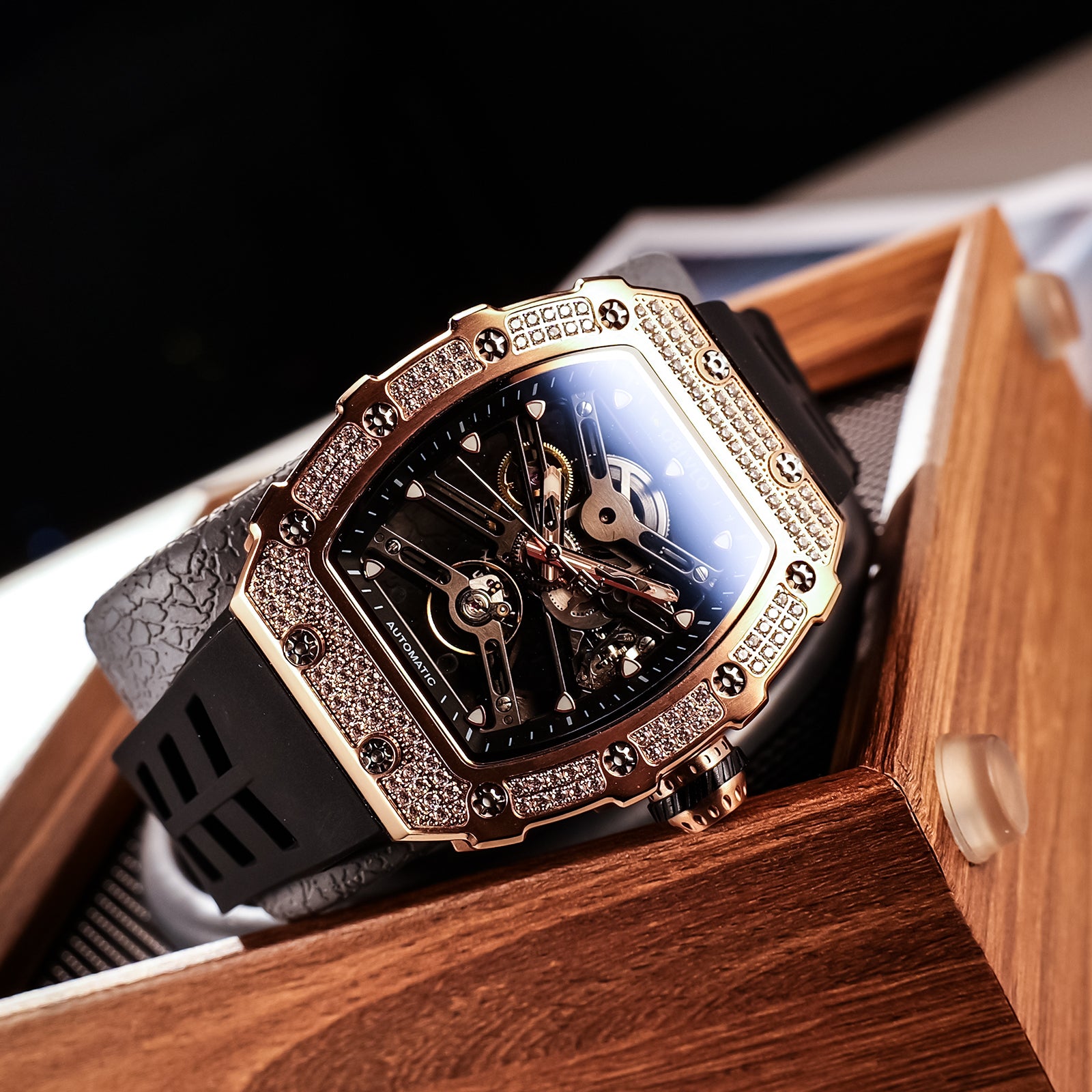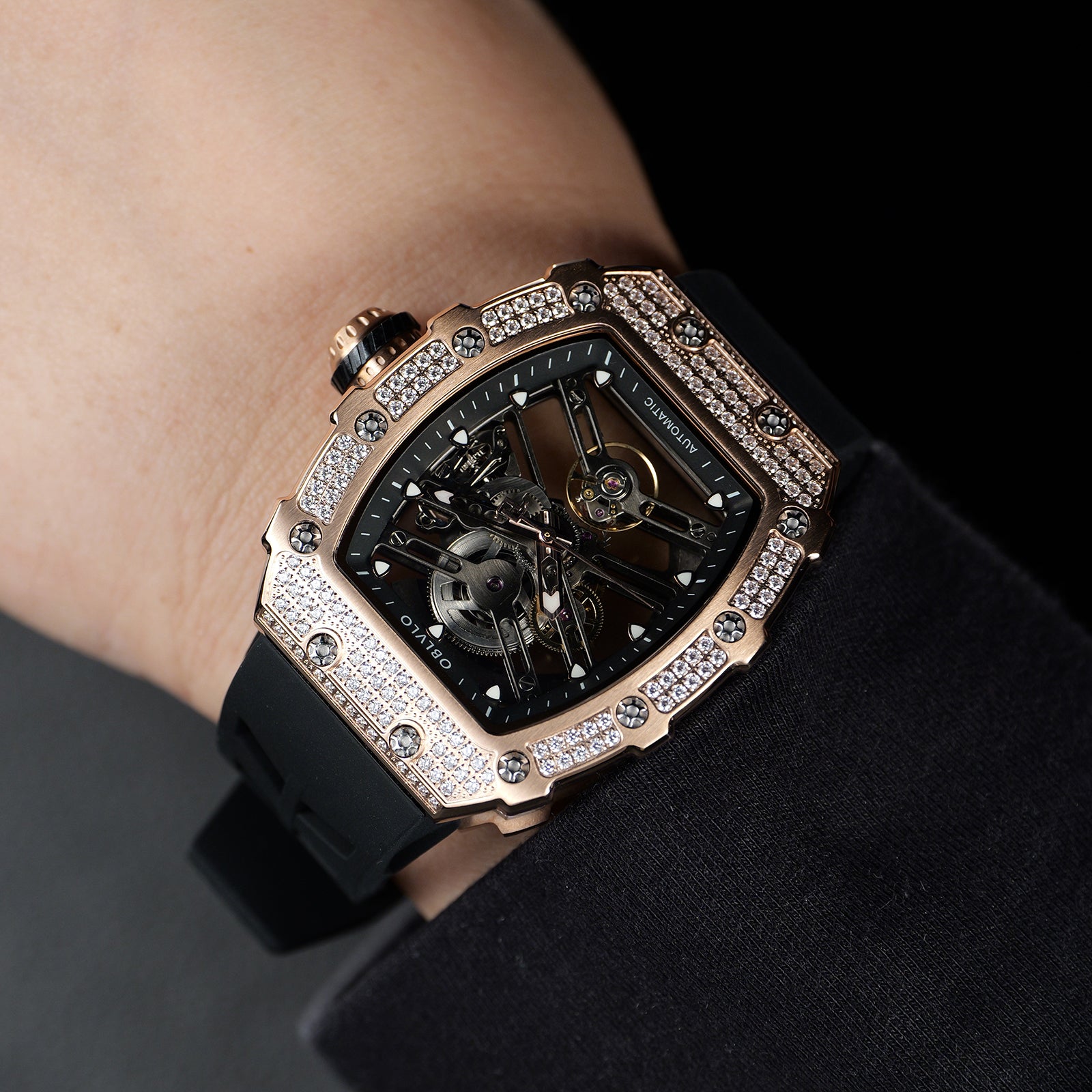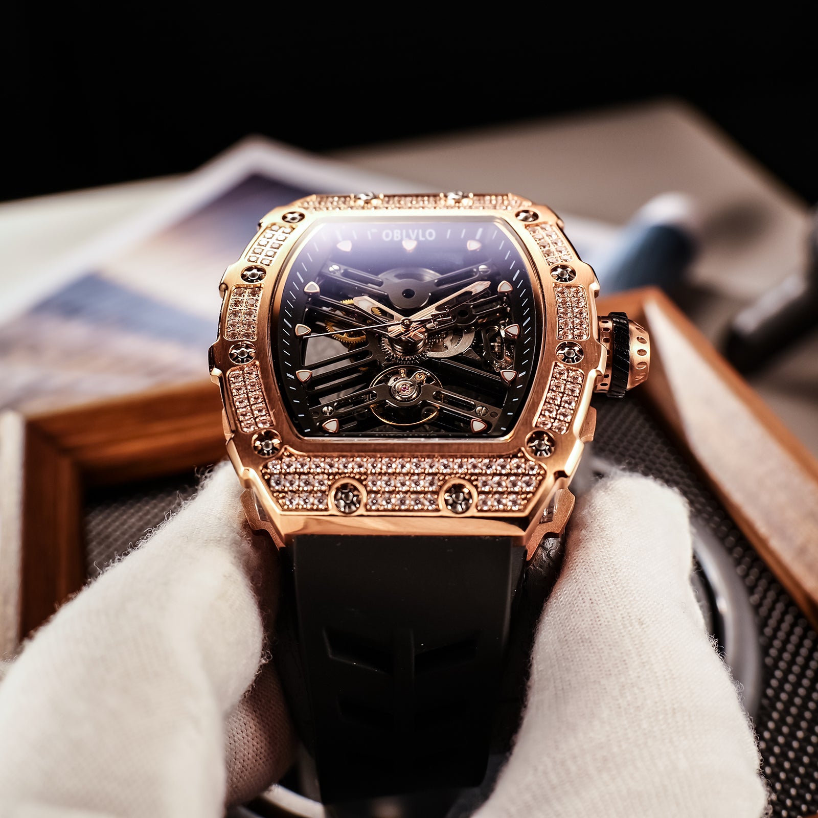 Luxury affordability with the OBLVLO XM XSK series of men's watches. Crafted with precision and style, these rose gold mechanical skeleton diamond timepieces are the epitome of elegance and sophistication. The tonneau-shaped case, made of 316 stainless steel plated with rose gold and adorned with Swarovski crystal white diamonds on the bezel, exudes a sense of opulence and luxury.