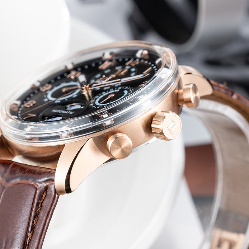 Powered by the reliable 8215 automatic self-winding movement, this watch blends traditional horology with contemporary functionality. The sapphire crystal glass face not only protects the dial but also adds a touch of sophistication. The butterfly double button buckle ensures a secure and comfortable fit, while the brown Italian calfskin strap exudes a sense of refinement.