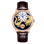 The dial is carefully carved in gold color to depict a majestic dragon soaring through the starry sky and The Moon Phase was replaced by a giant dragon orbiting the Earth From Chinese Dragon Playing with Pearl.