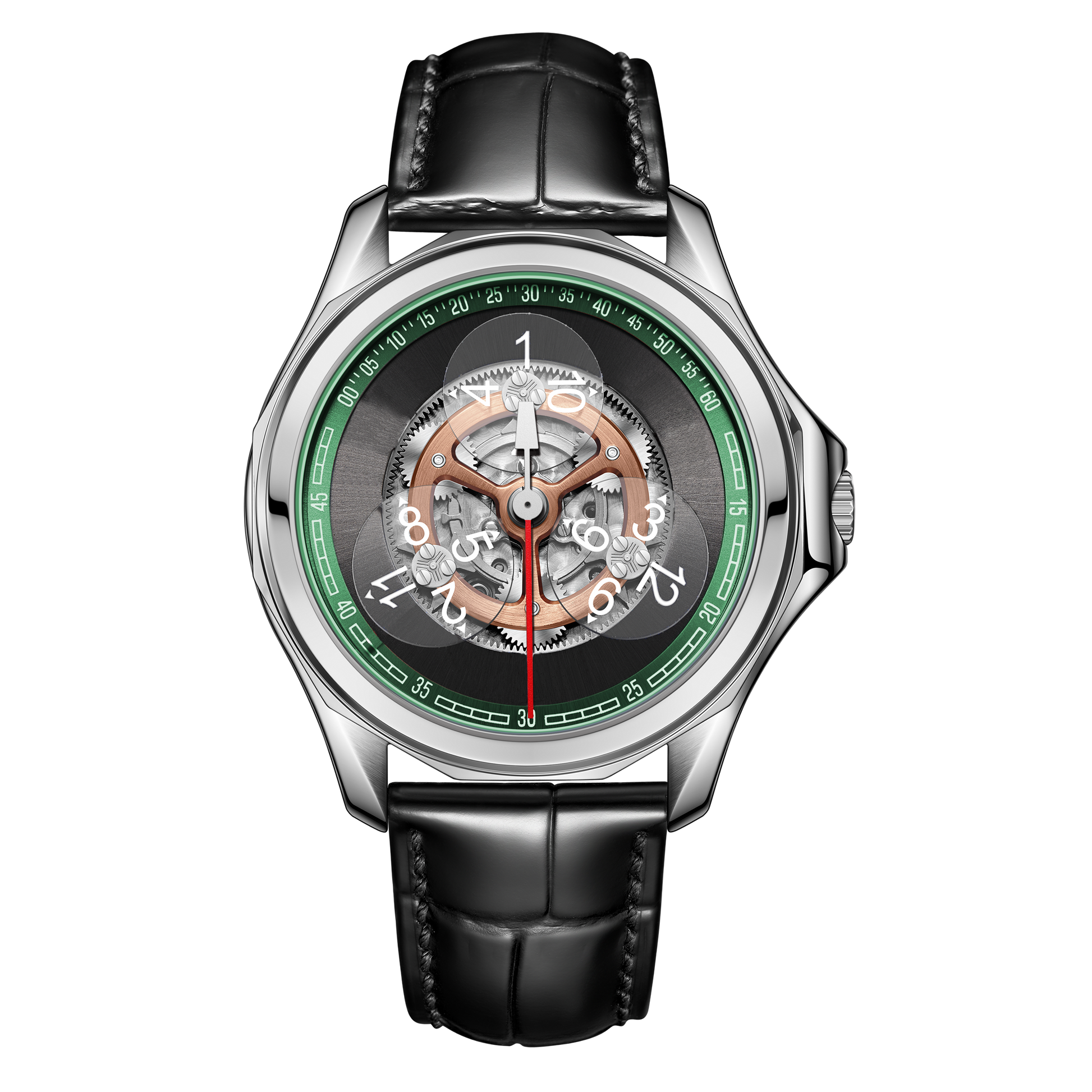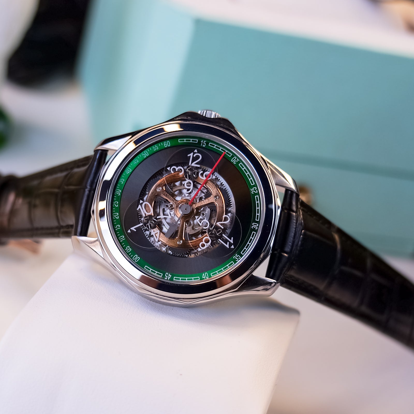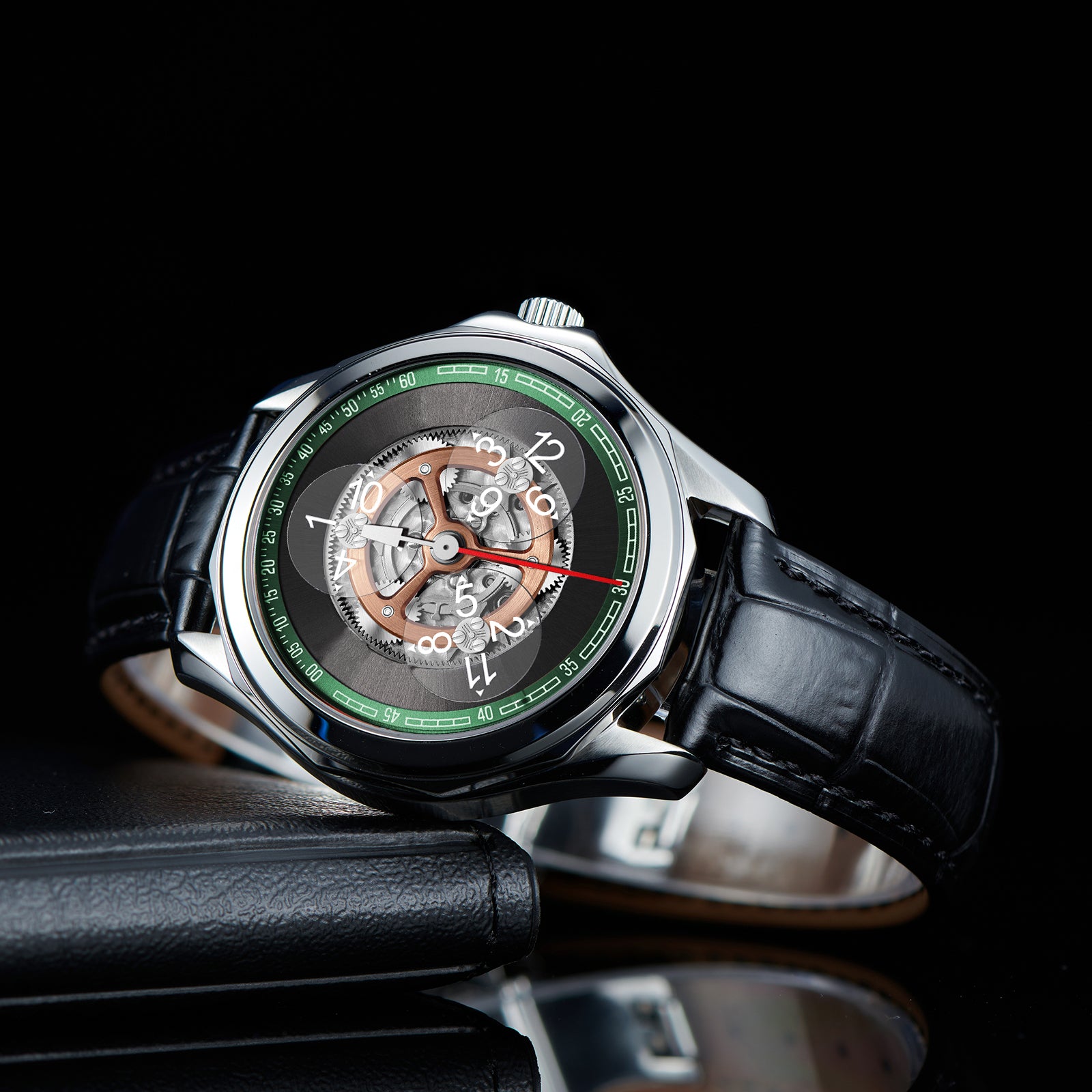 Dial:Black Gradient & Green Bezel, Automatic Mechanical Skeleton Indices And Hands With Luminescent Coating