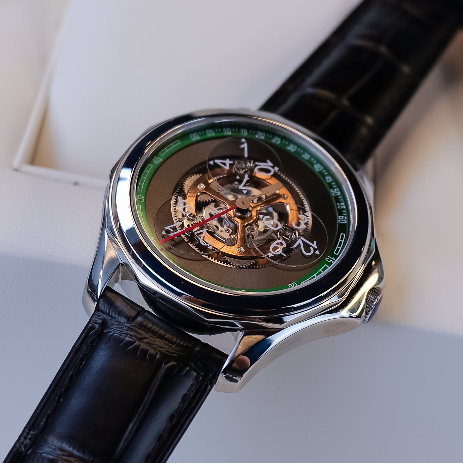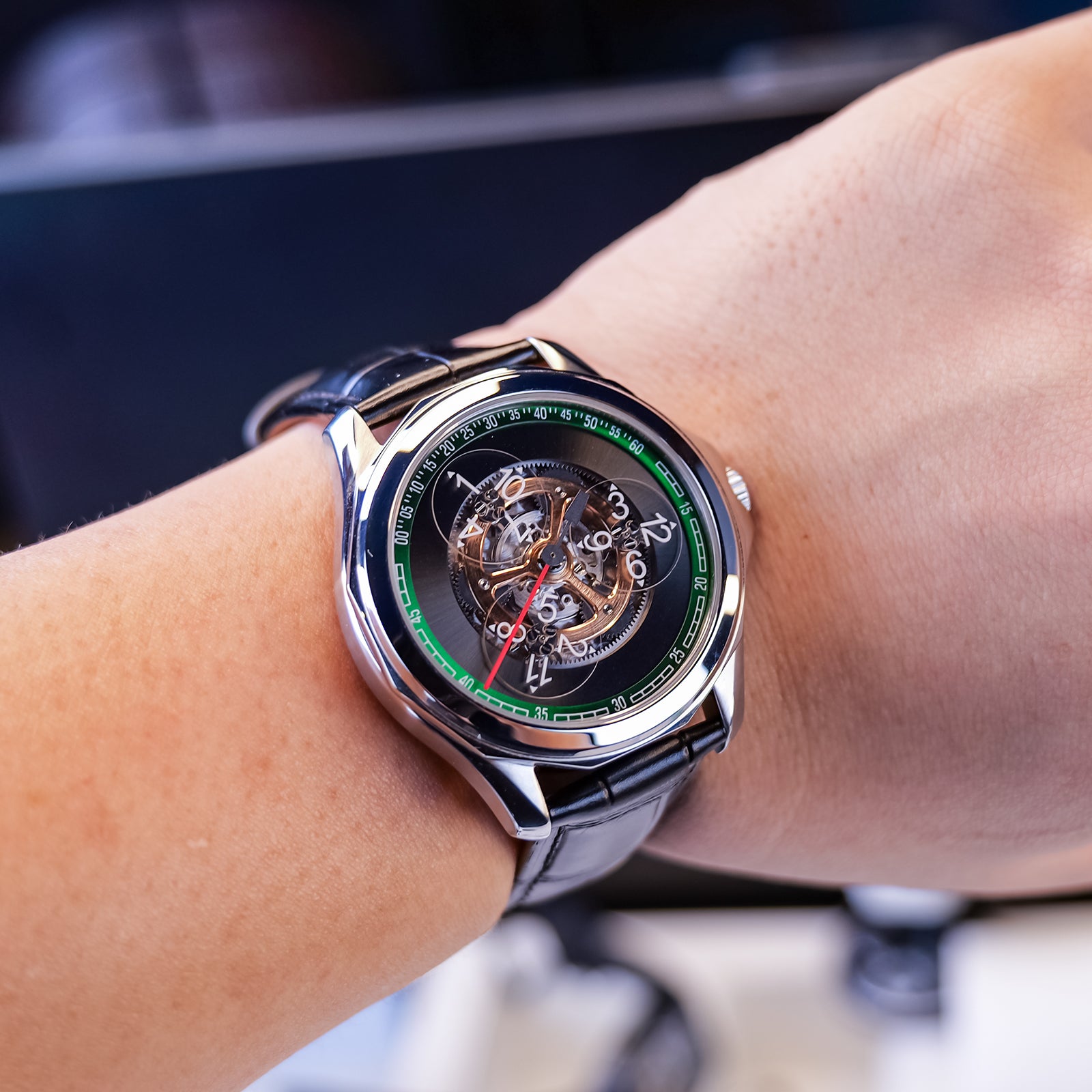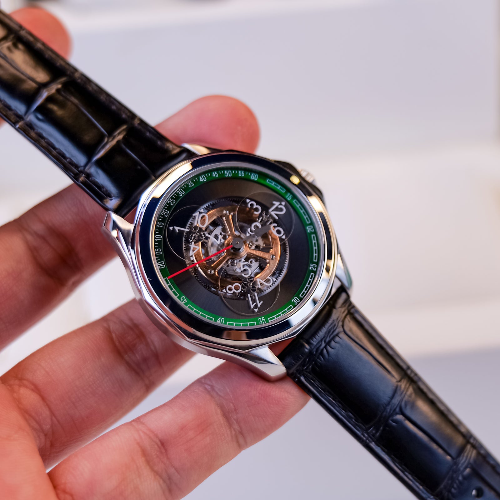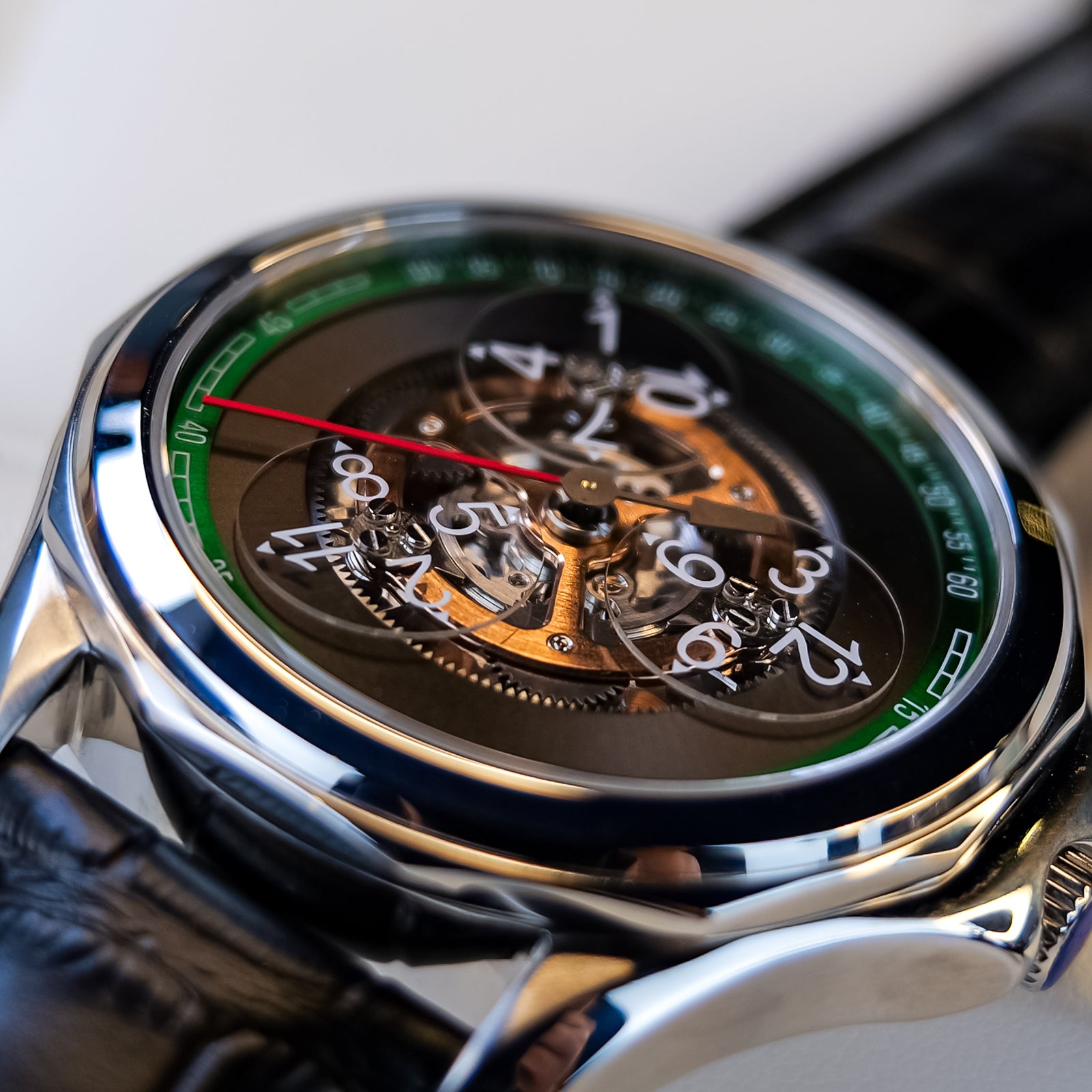 Dial:Black Gradient & Green Bezel, Automatic Mechanical Skeleton Indices And Hands With Luminescent Coating
