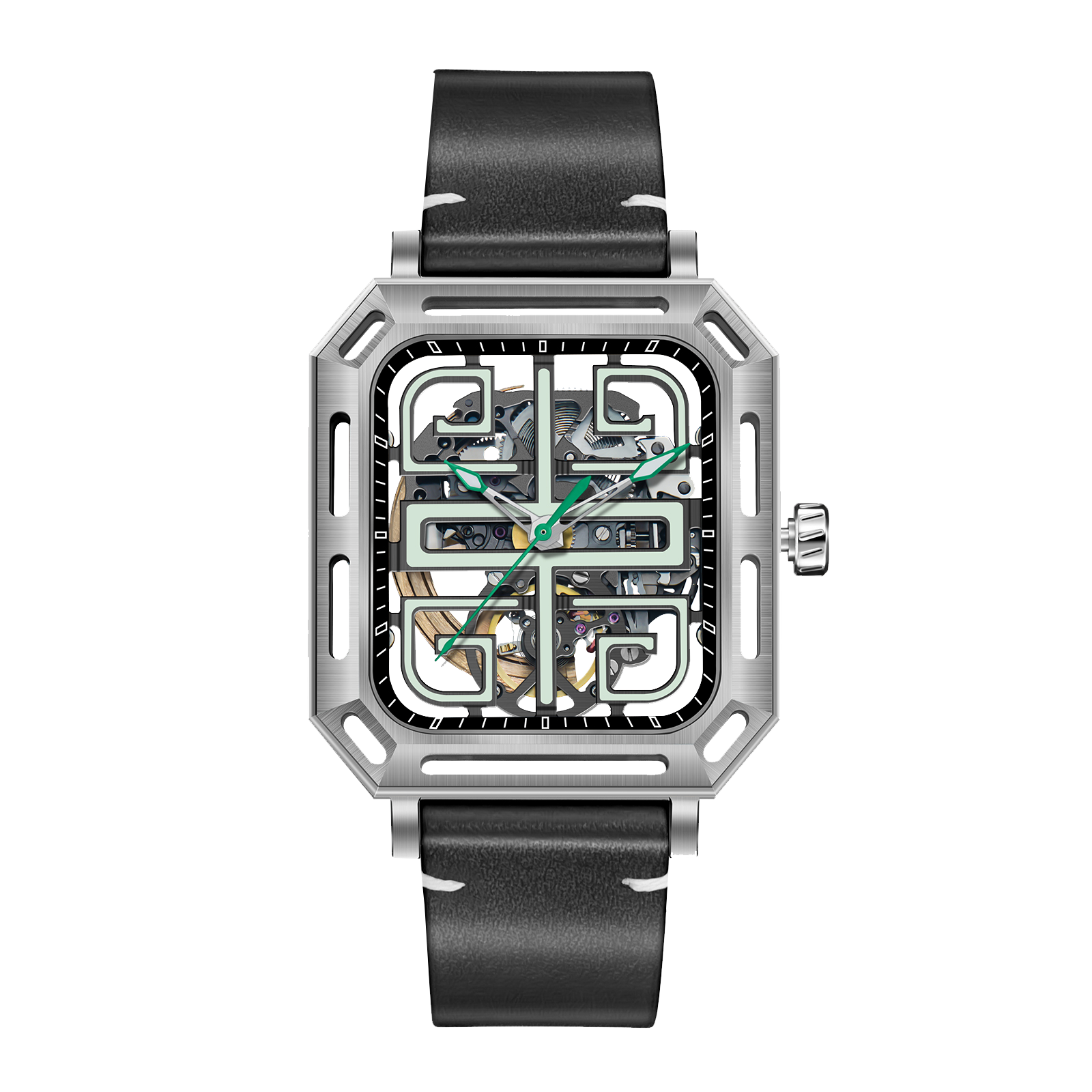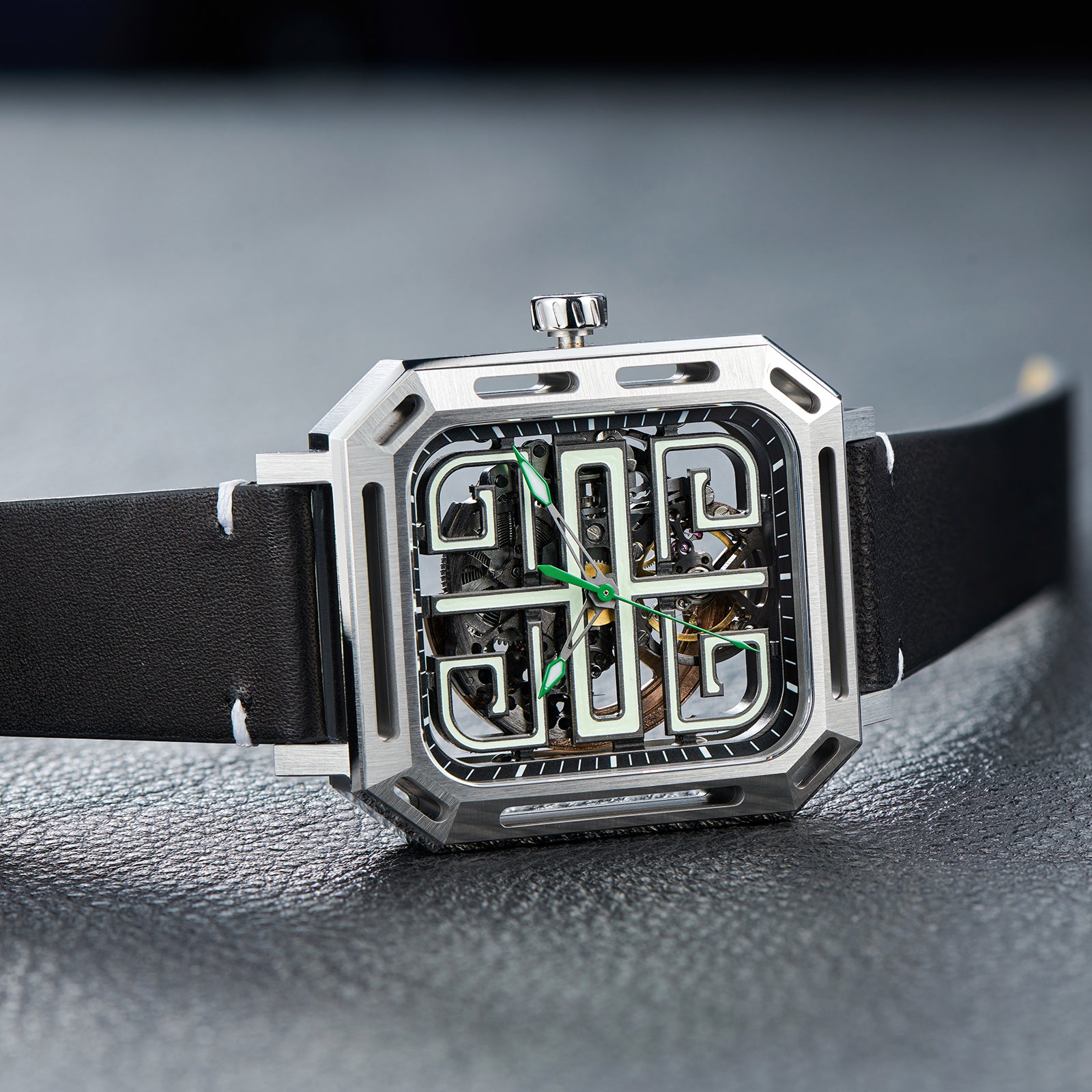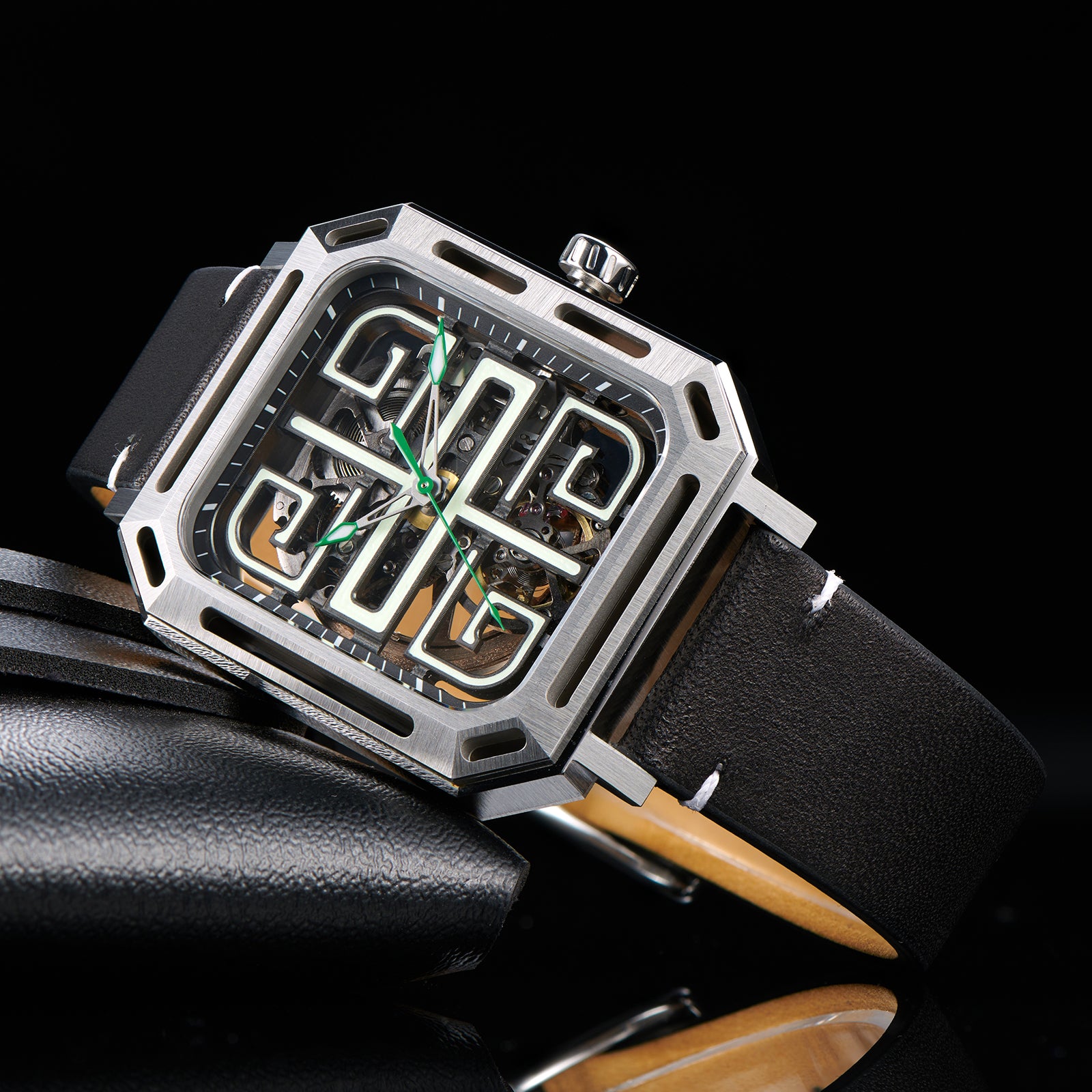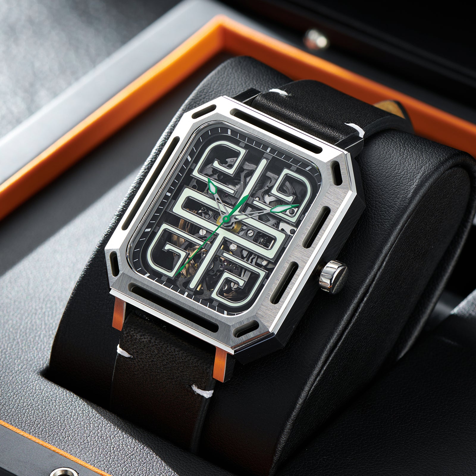 Dial: Green skeleton & Indices And Hands With Luminescent Coating