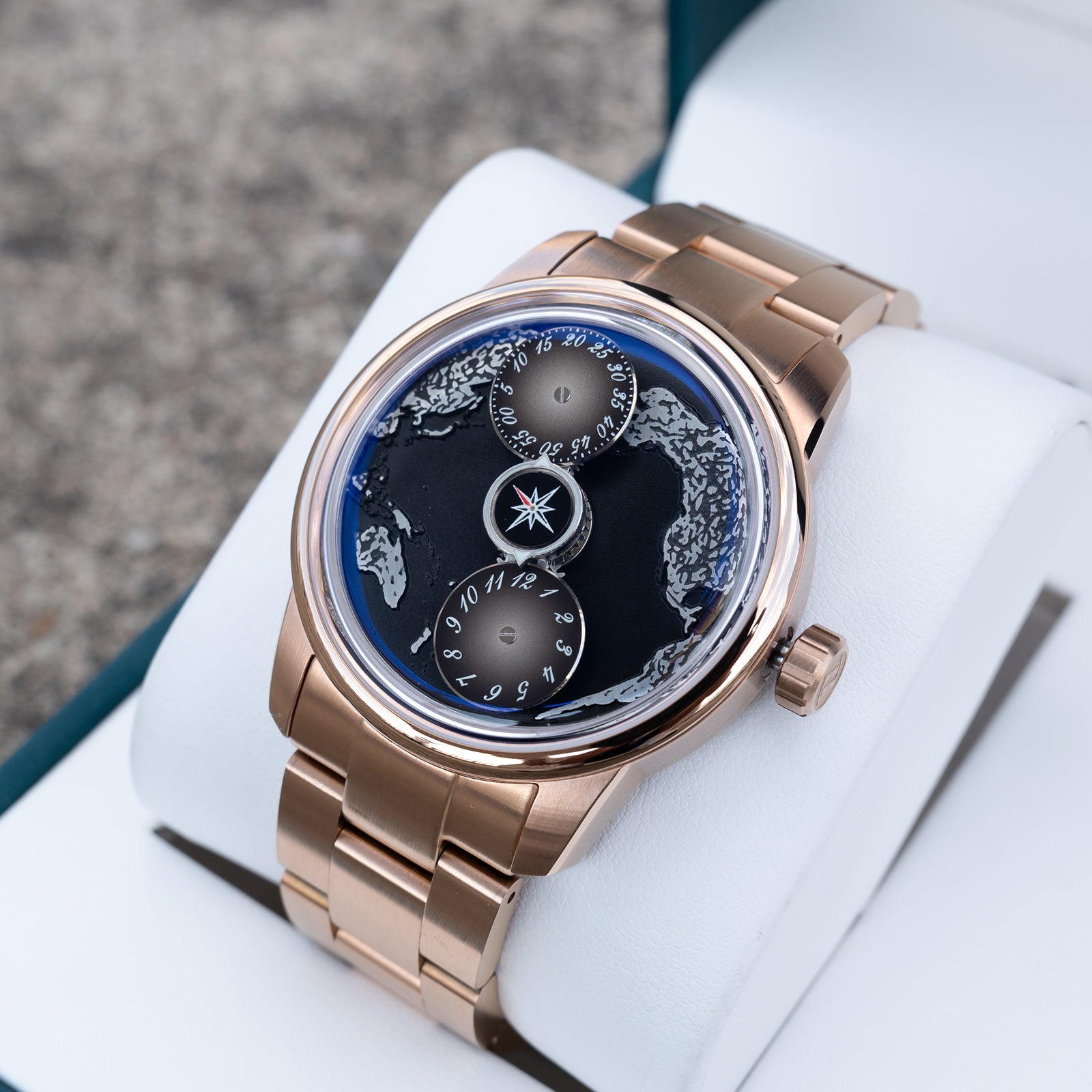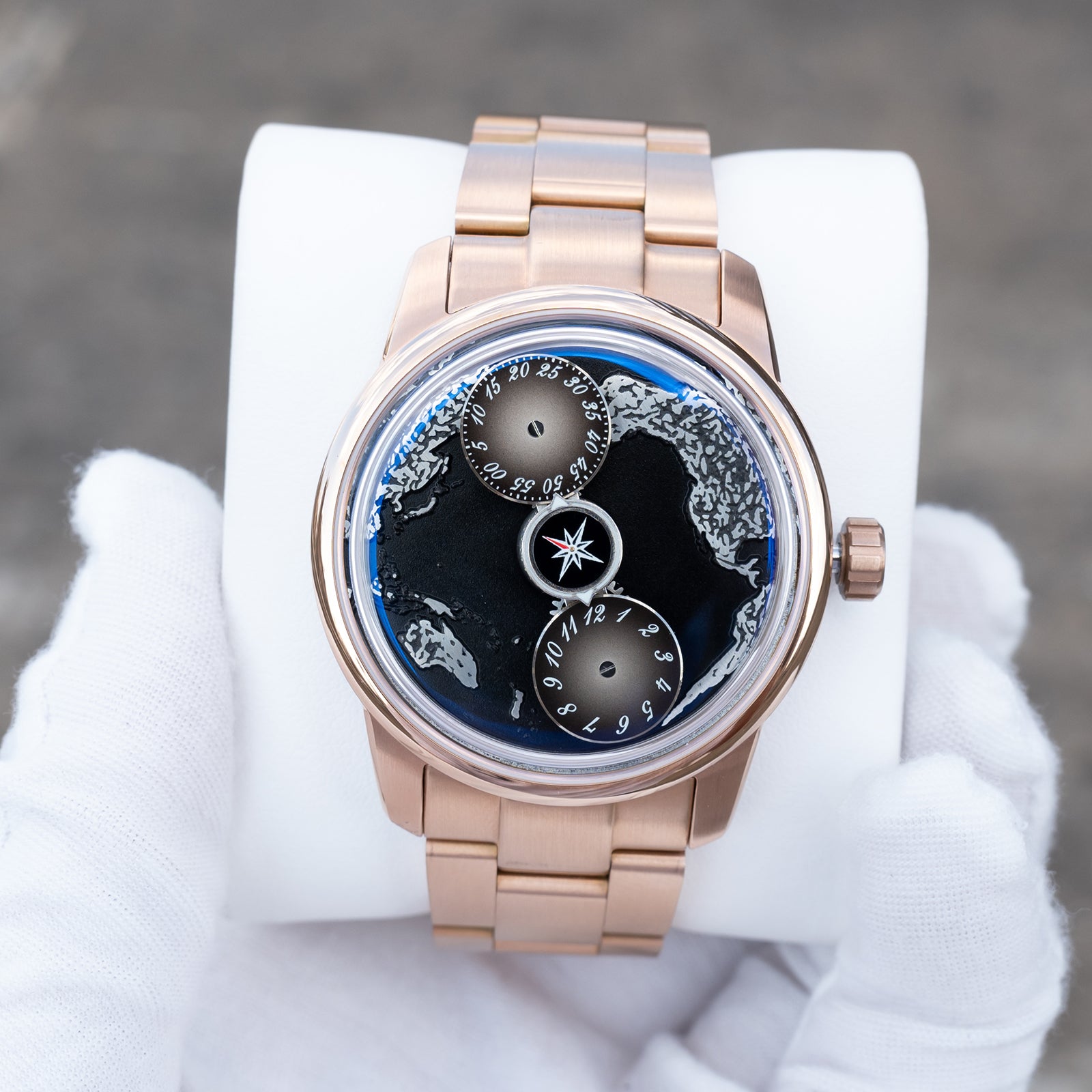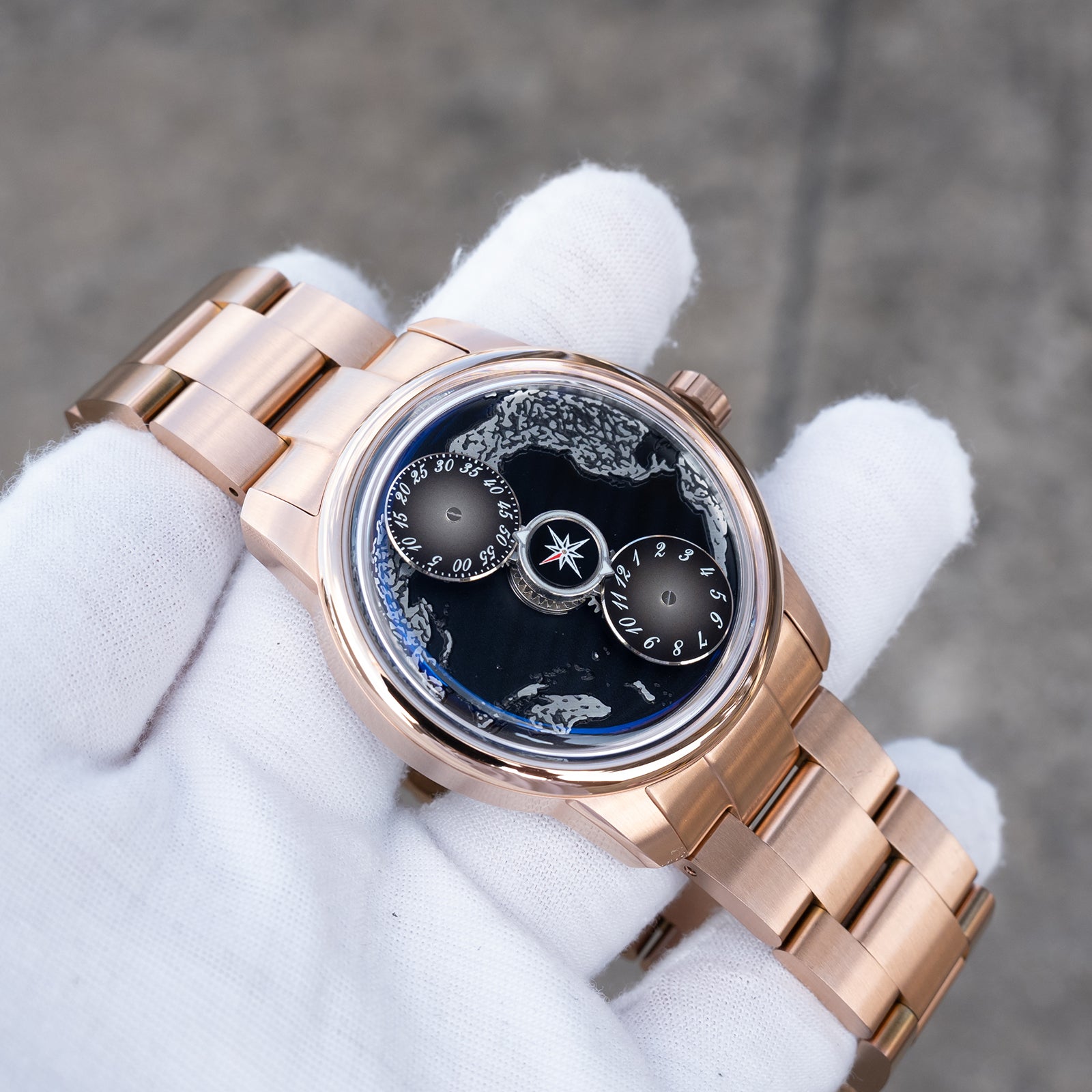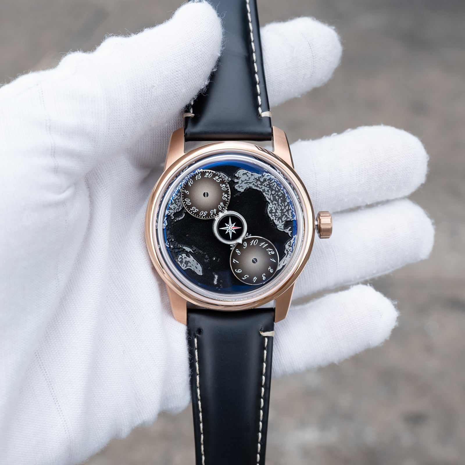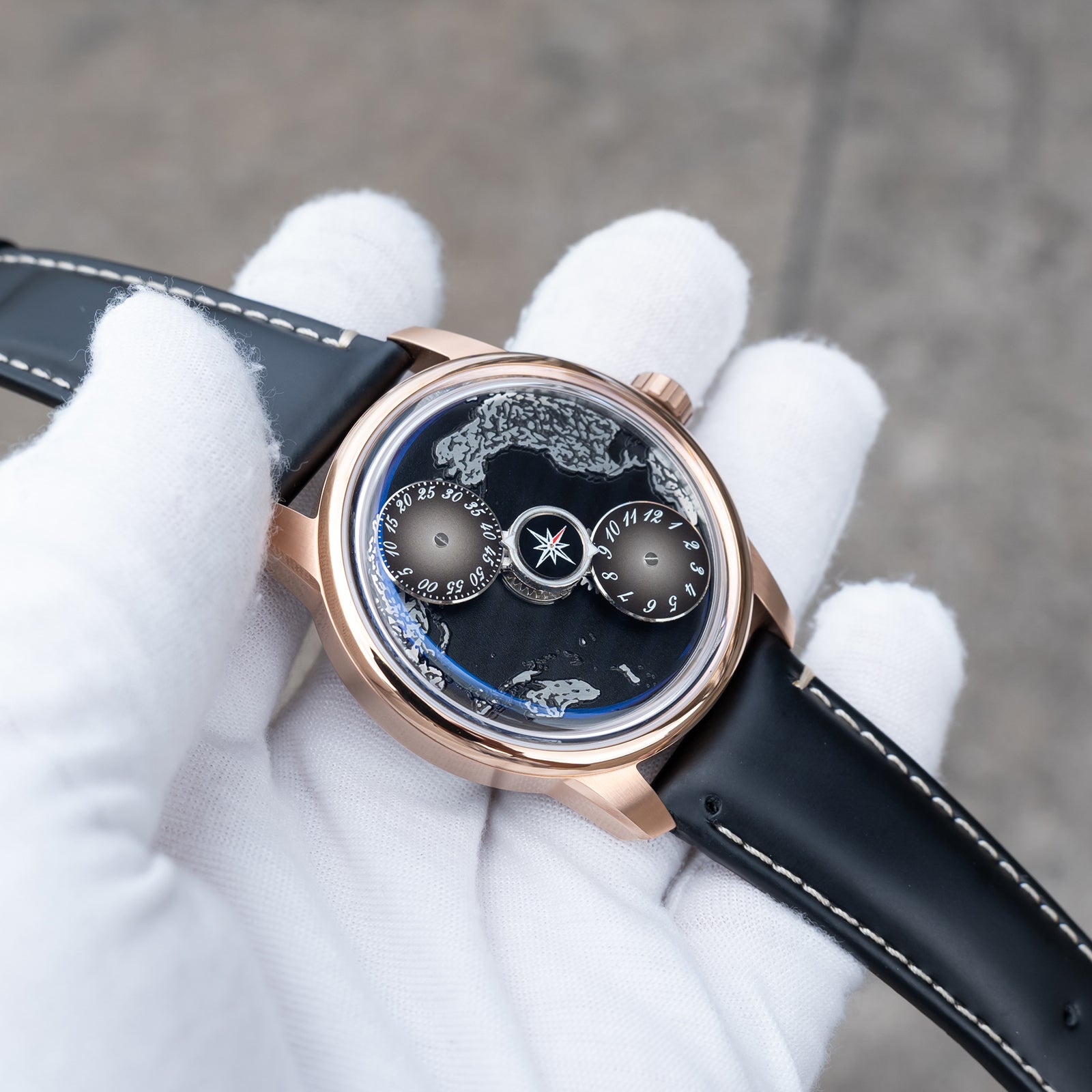 The watch face is protected by a Sapphire Crystal, renowned for its scratch resistance and clarity. This ensures that the intricate details of the black Pacific Ocean maps dial are always visible, maintaining the watch's stunning appearance. The strap options are both elegant and functional, with choices including Black Italian Calfskin and a 316L Stainless Steel option, both plated with rose gold to maintain a cohesive aesthetic.