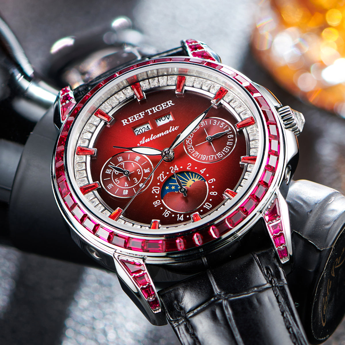 Dial Design: Burgundy Red Dial & Watch face is designed with year, month, date, day, 6 hours day/night/24 hours instruction & moonphase style, luminous hands display. White/Burgundy Red Color Zirconia and Diamond inlay collocation multifunctional dial, highlight charm, shine extraordinary brilliance.
