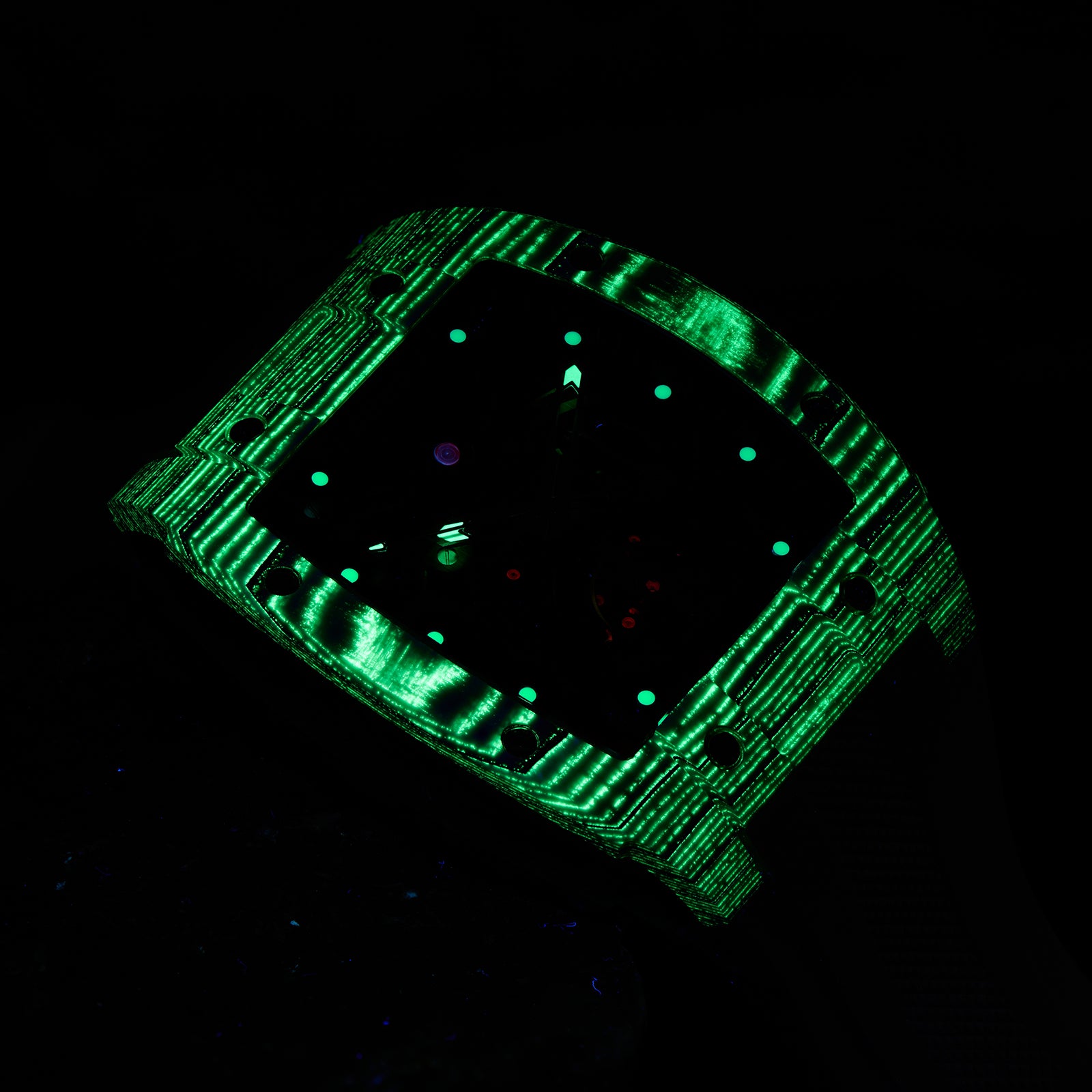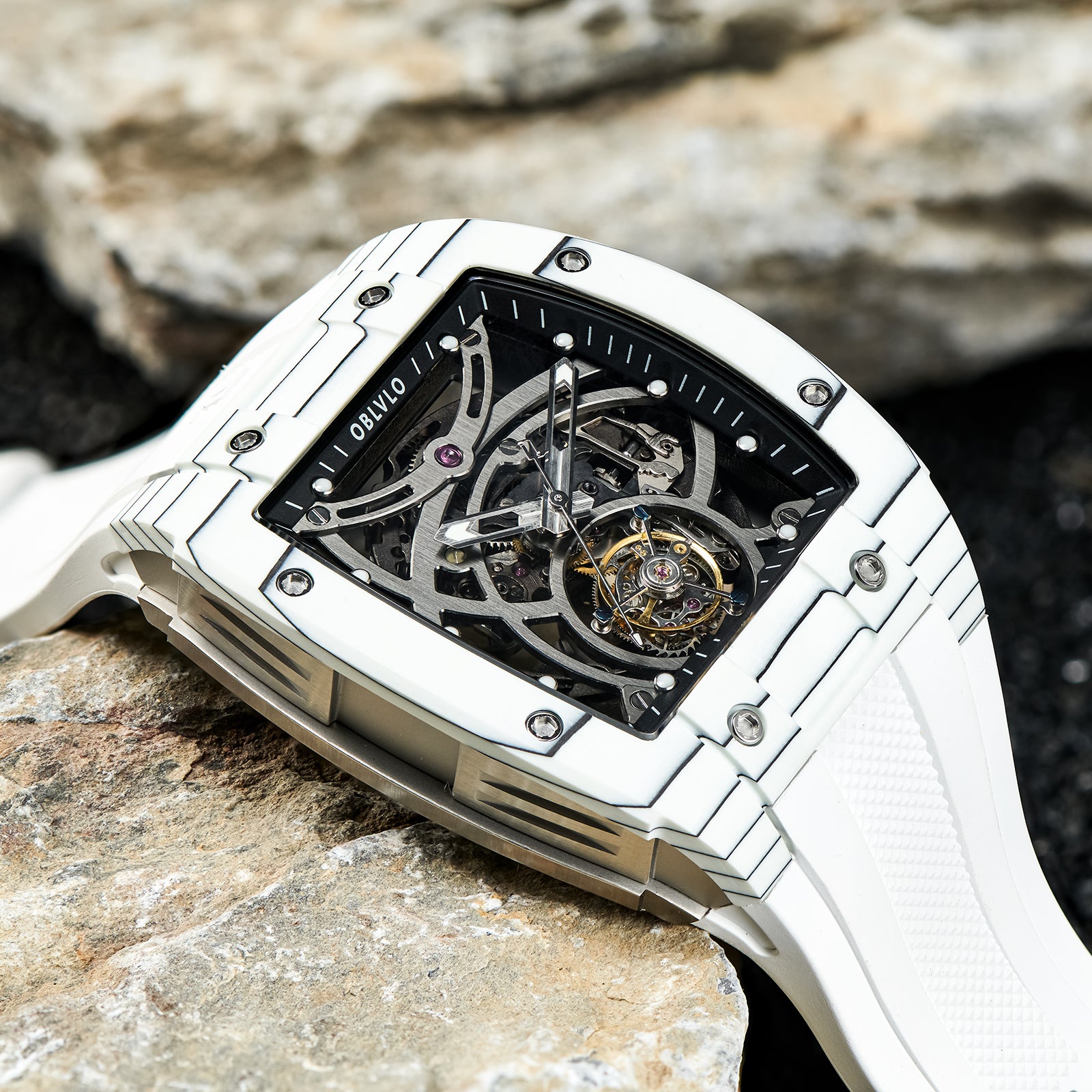Skeletonization is an art form that involves removing excess material from various parts of a watch movement without compromising its structural integrity. The OBLVLO EM-RT Series exceptional skill and precision to create a visually appealing yet functional skeletonized White Luminescent Carbon Fiber watch. The craftsmen meticulously carve out bridges and plates, leaving behind only what is necessary for optimal performance.