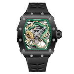 Crafted with precision, the case of these timepieces boasts a Tonneau shape made from 316 Stainless Steel plated with Black PVD, giving them a sleek and sophisticated appeal. The dial of the watch showcases a mesmerizing Skeleton design adorned with a captivating Green Chinese Dragon motif, adding a touch of mystique and allure to the overall look.