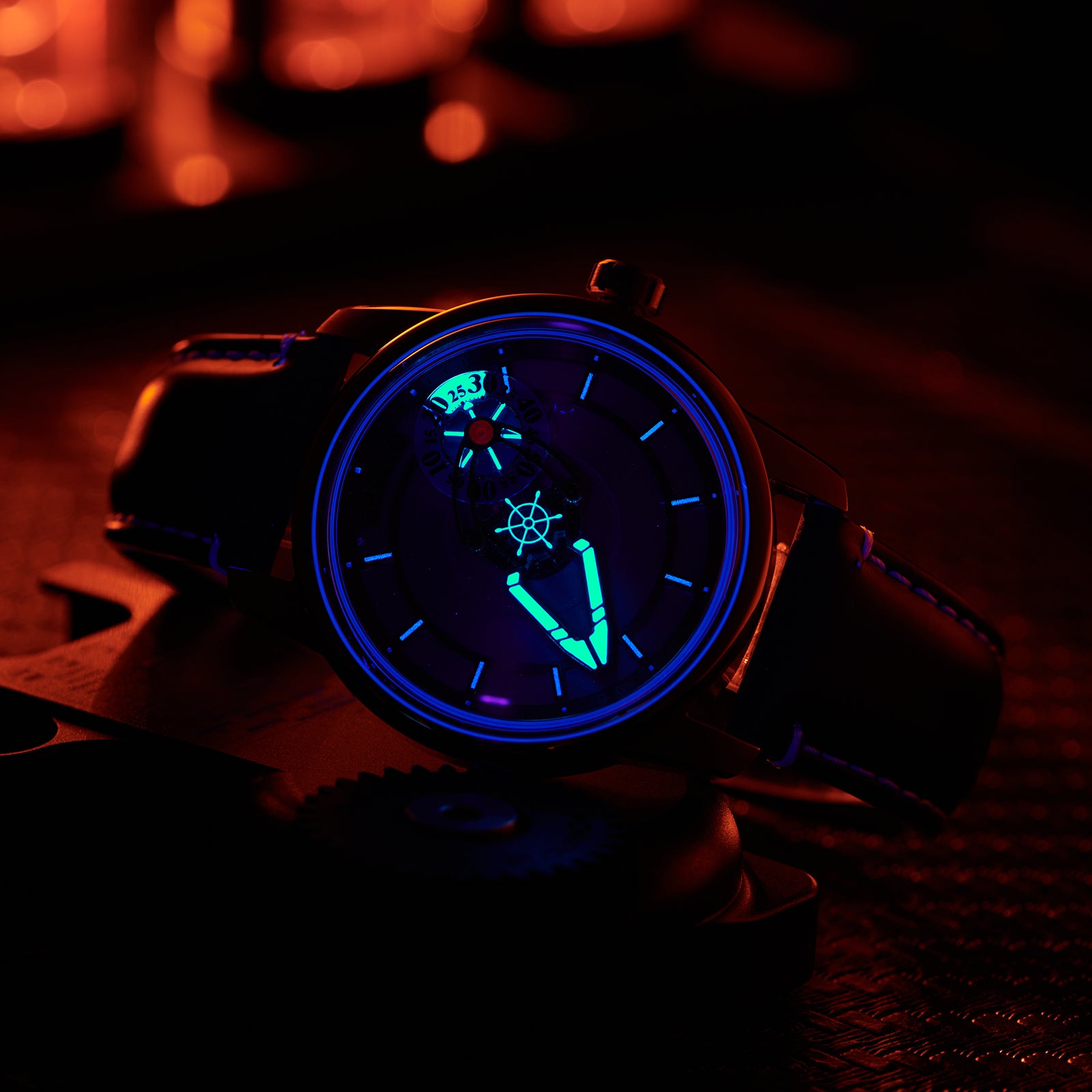 Dial Design: Black Dial, Unique Spaceship steering wheel and watch hands and super luminous.
