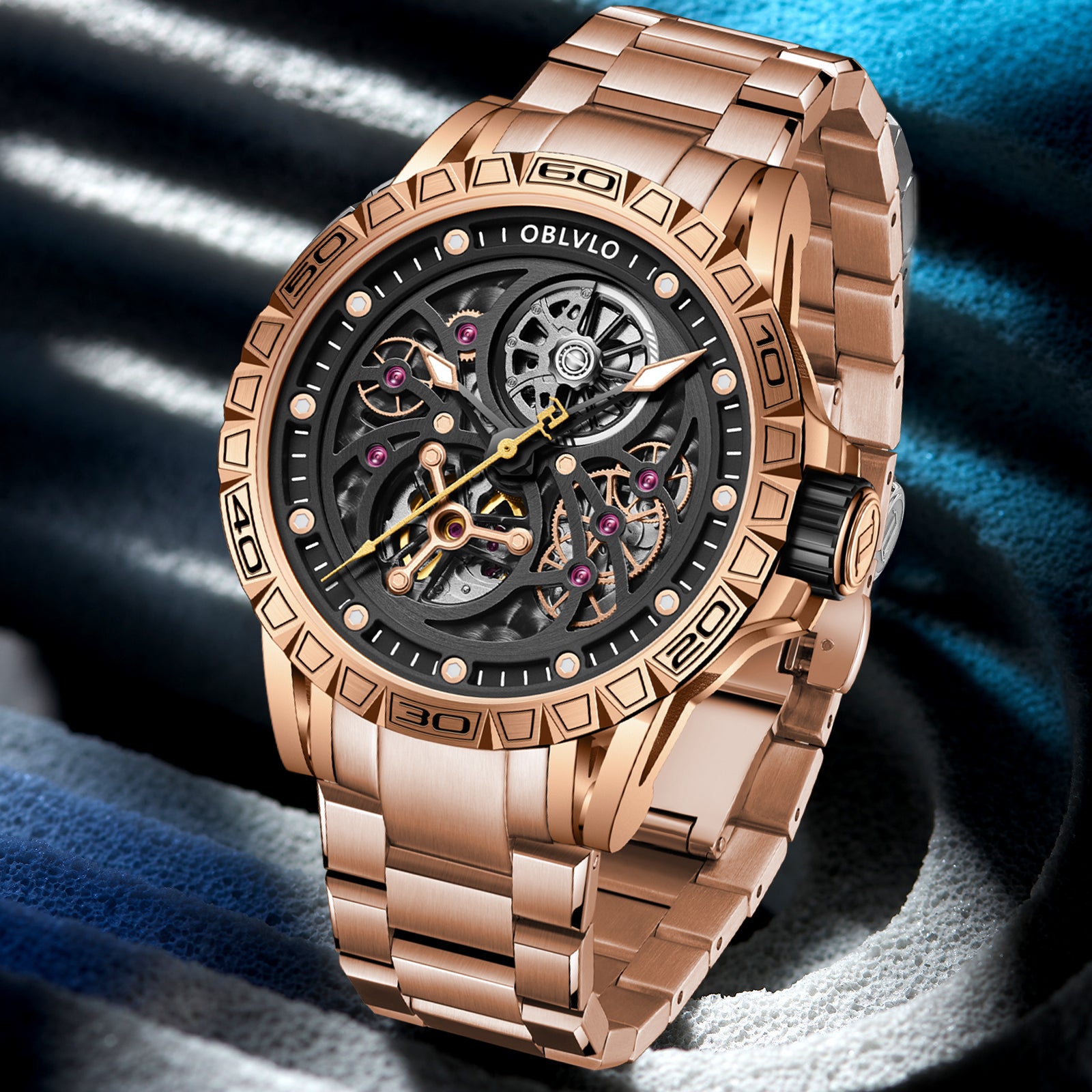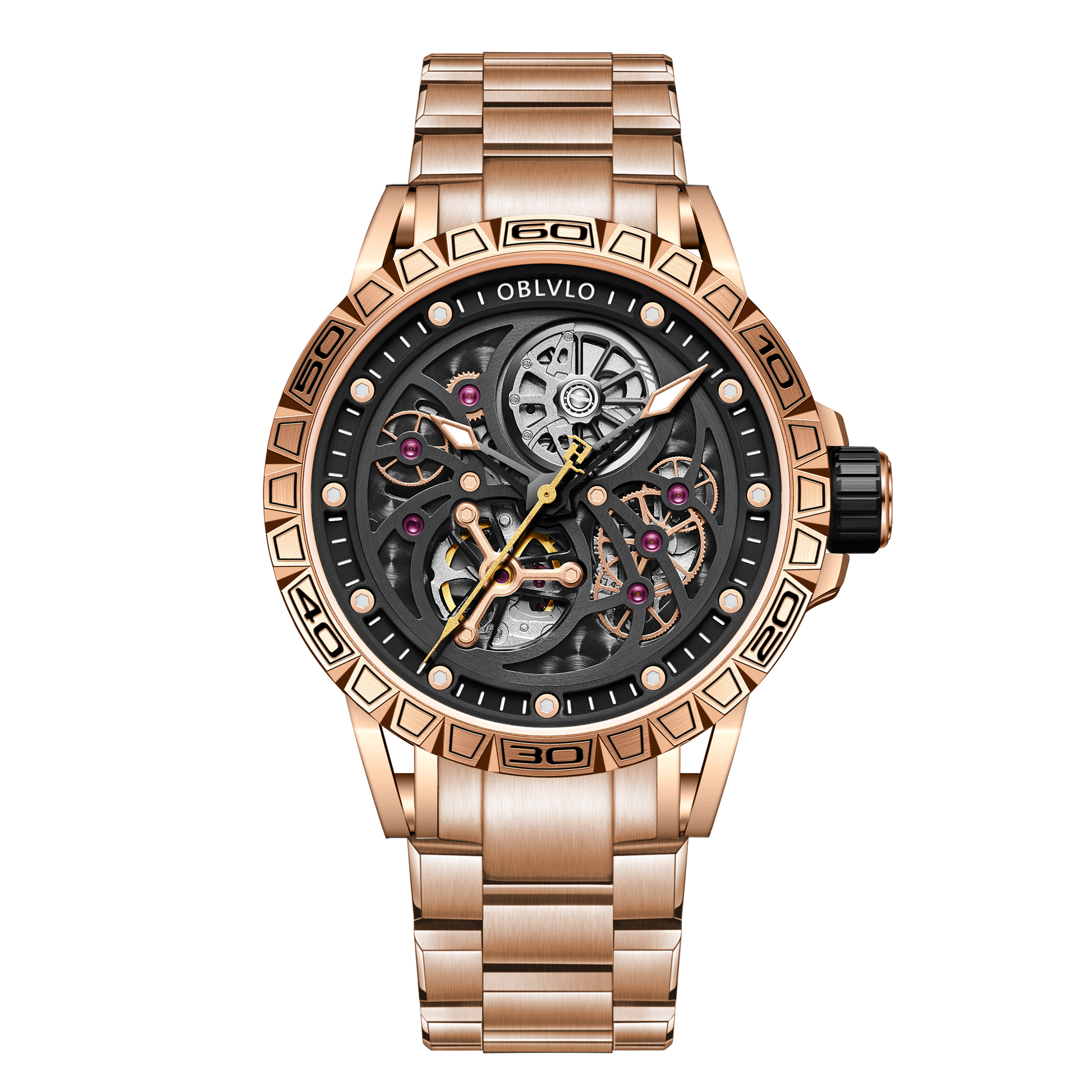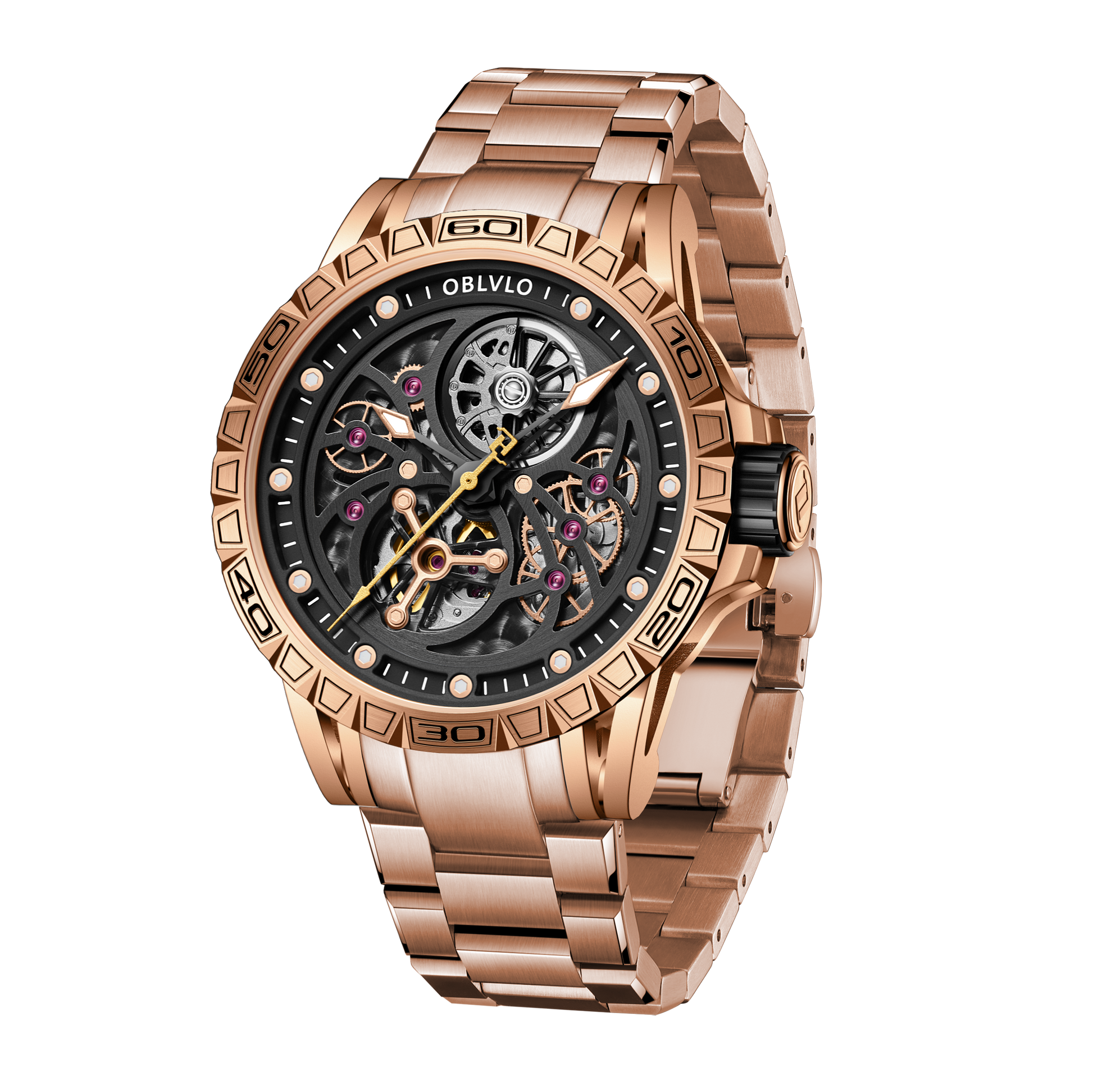 The OBLVLO LMS Series Luxury automatic skeleton rose gold watches for men represent the pinnacle of horological excellence. Their fusion of mens watches, skeleton watches, and automatic movements creates a captivating timepiece that exemplifies style, sophistication, and uncompromising quality.
