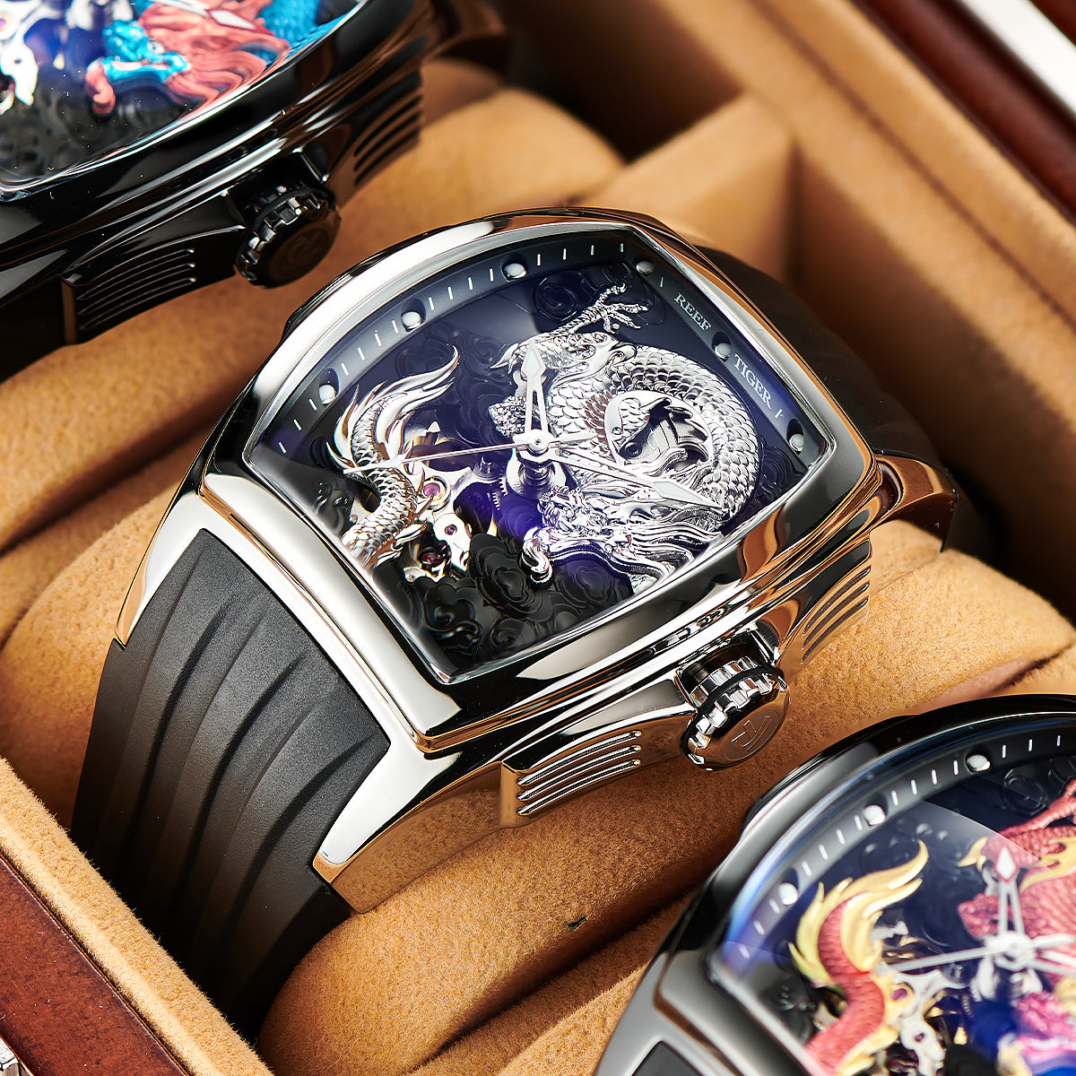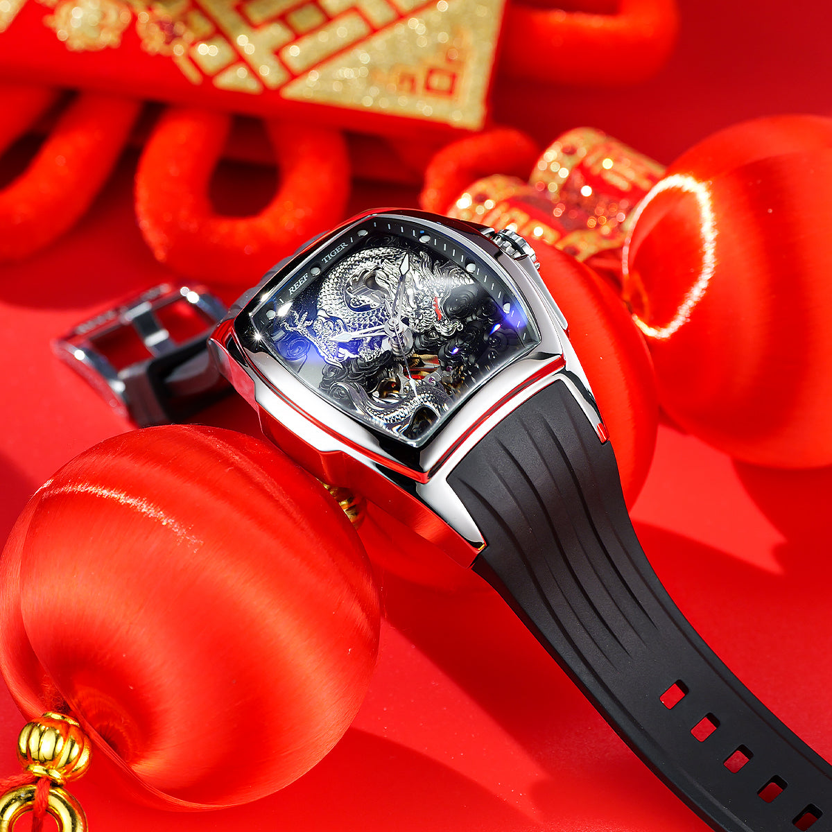 The Reef Tiger Aurora Series Silver China Dragon Skeleton Automatic Watch is a true fusion of style and substance. Perfect for those who appreciate unique watches that make a statement, this timepiece is a must-have for any automatic watch enthusiast looking to elevate their collection.