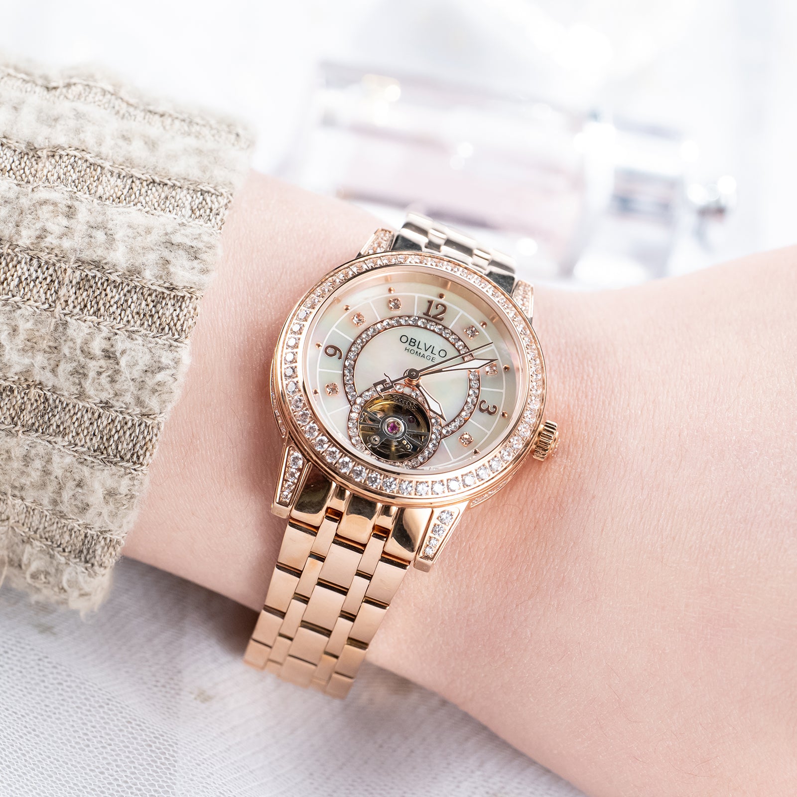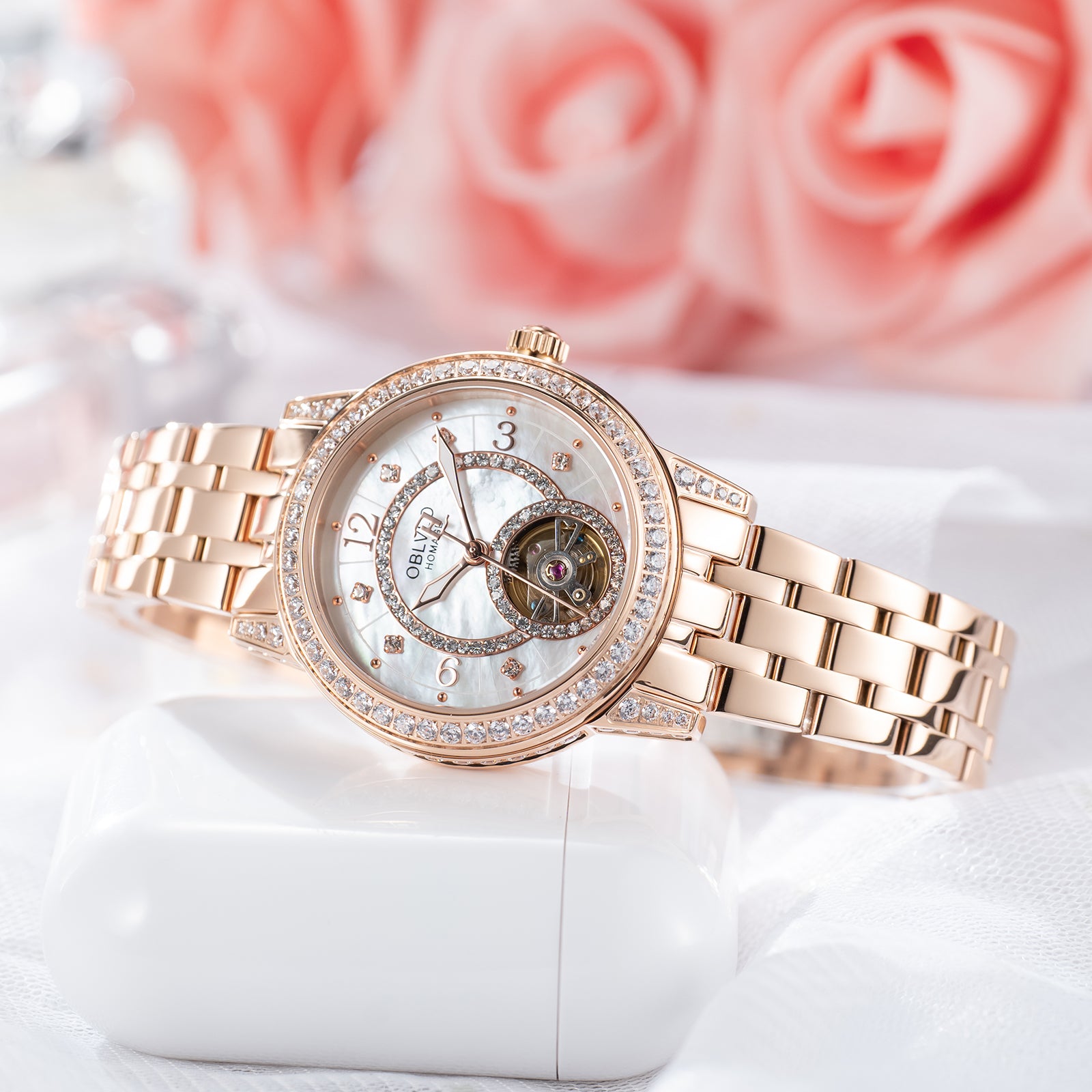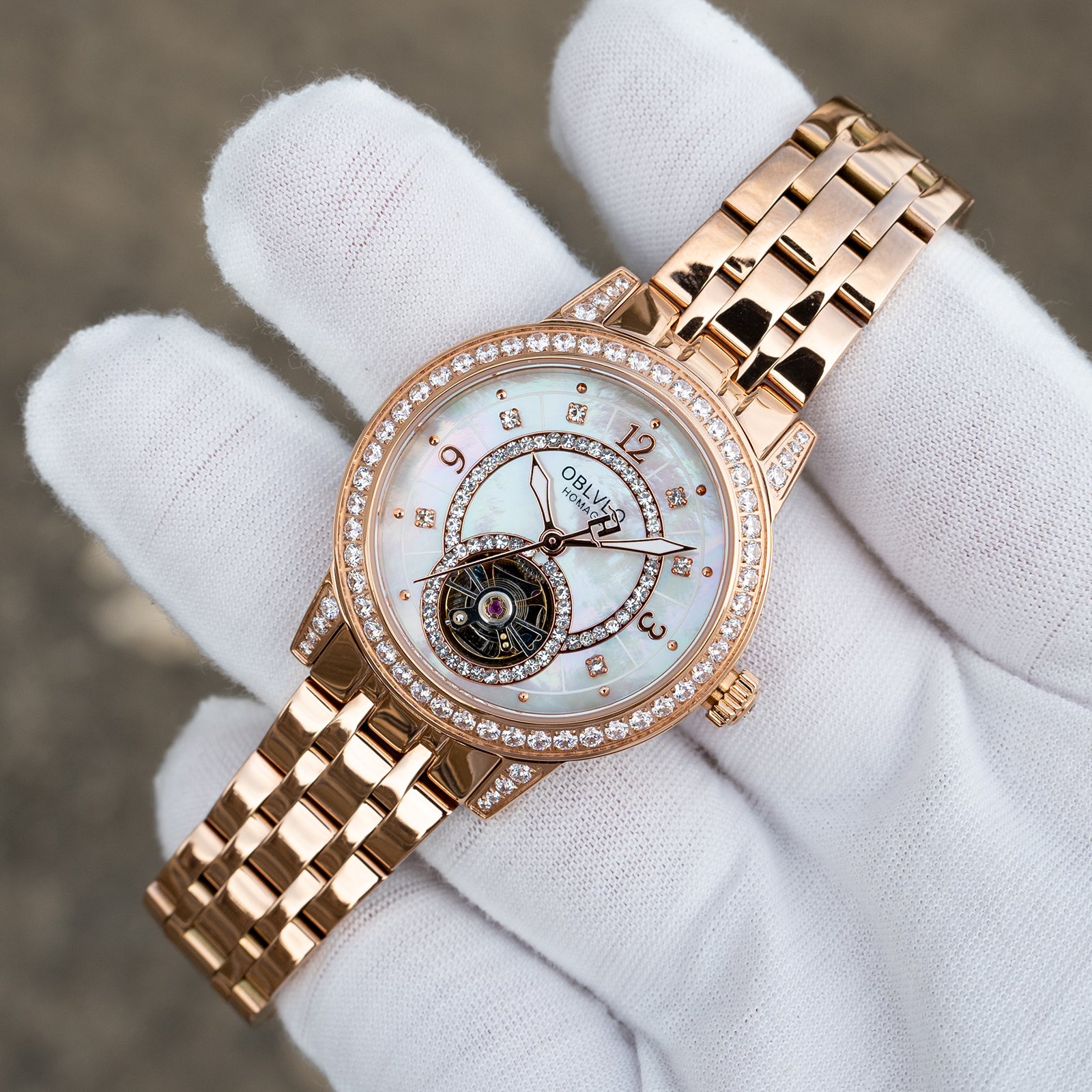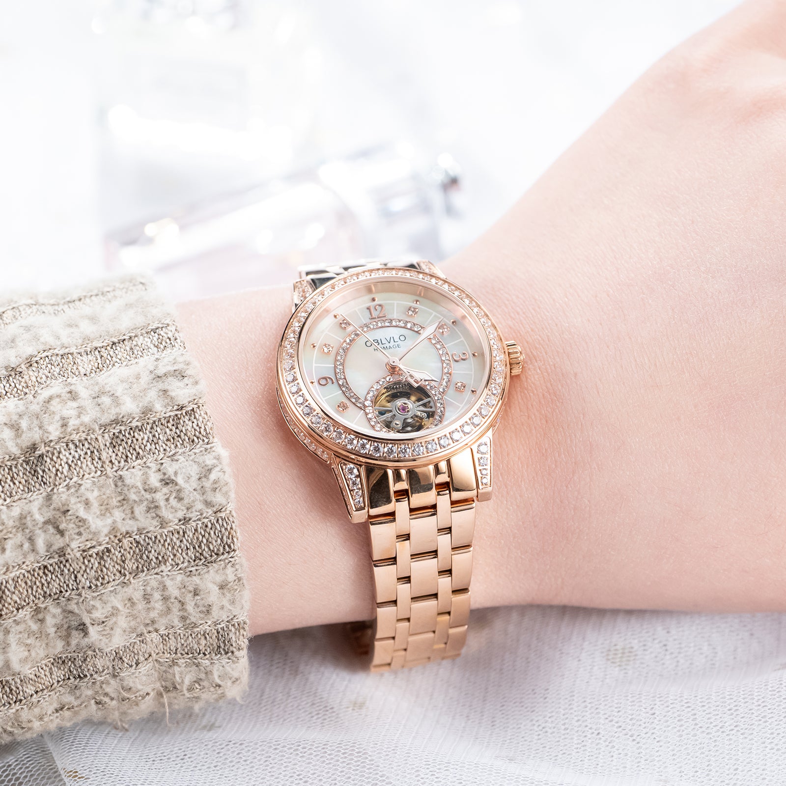 Dial Design: Creative Unique Tourbillon Style Dial: The whole watch bezel is inlaid with bright diamonds, fashion and luxury. The diamond-set dial paired with a minimalist shell shape exudes elegance.