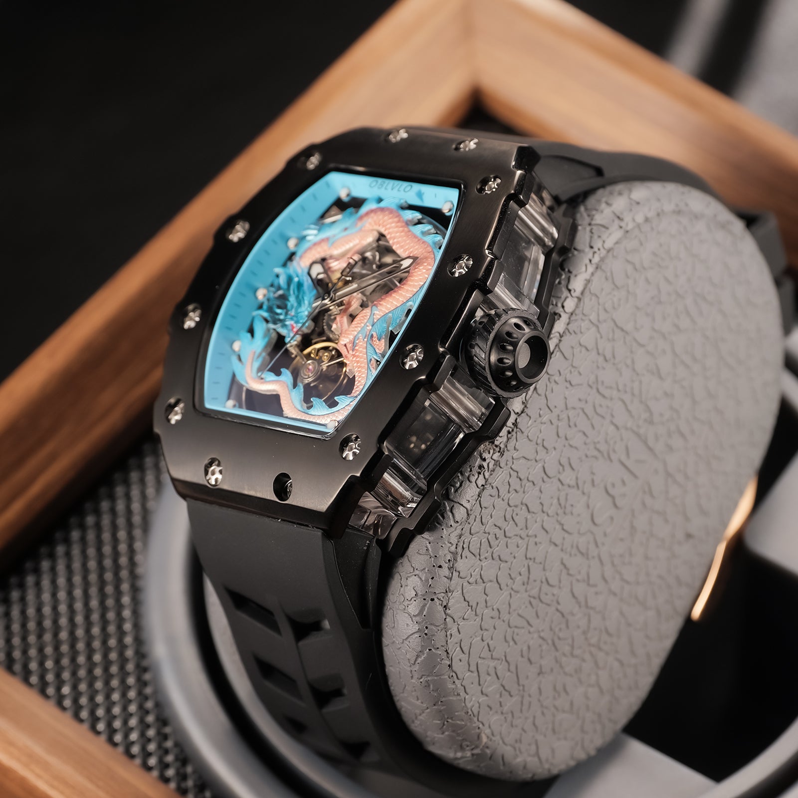 One of the most distinctive features of this watch is its skeleton dial adorned with a unique blue Chinese dragon design. This intricate detailing adds a touch of mystique and artistry to the timepiece, making it truly one-of-a-kind.