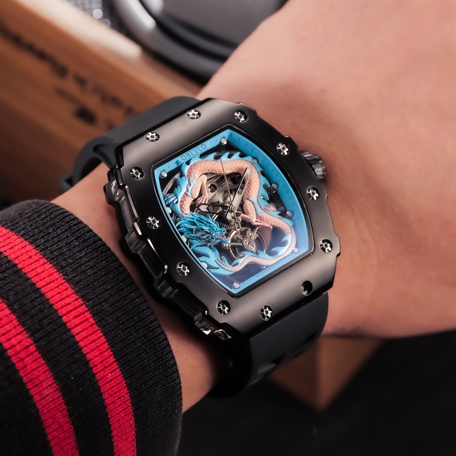 When it comes to men's watches, there is a timepiece that stands out from the rest - the Cool Unique Black PVD Case & Blue Chinese Dragon Skeleton Watch from the OBLVLO DRAGON Series. This striking watch boasts a tonneau case shape made of 316 stainless steel plated with black PVD, giving it a sleek and sophisticated look.
