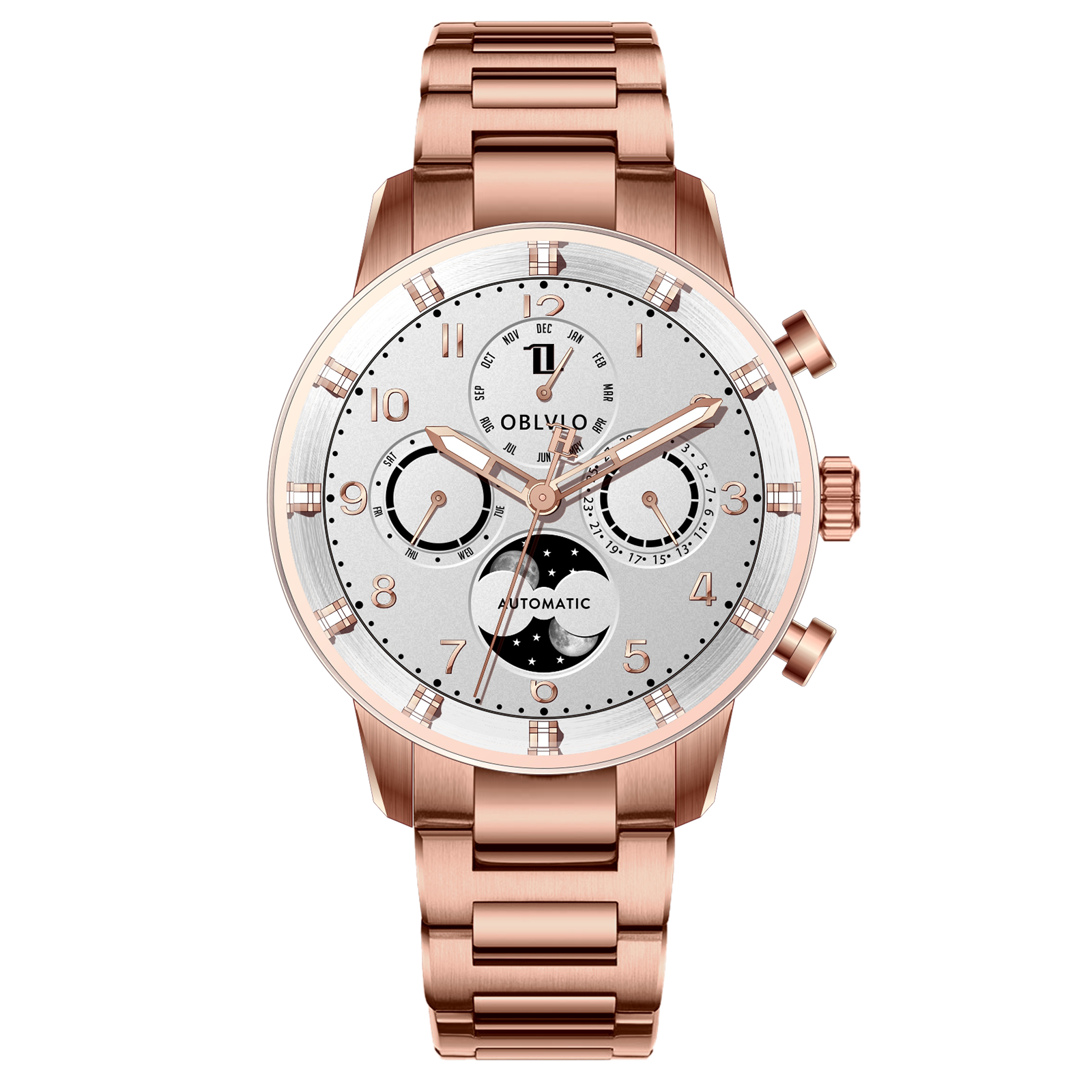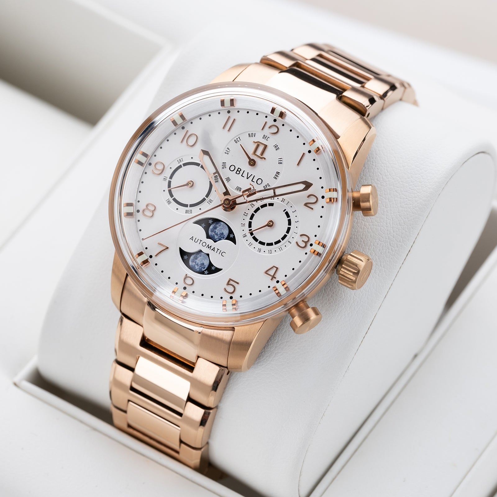 The OBLVLO IM MUT-MP Rose Gold Moonphase Automatic Watch stands out as a true masterpiece. This luxury watches features a round case made of 316 stainless steel plated with rose gold, giving it a luxurious and sophisticated look. The dial is adorned with a stunning white dial and moon phases, with hands and indices that have luminous features for easy readability in any lighting conditions.