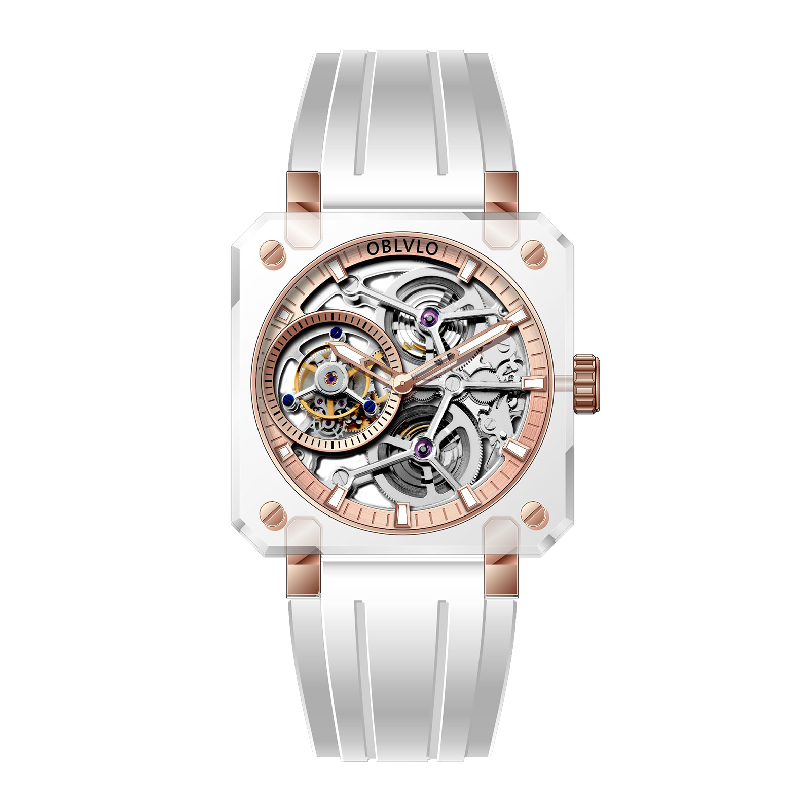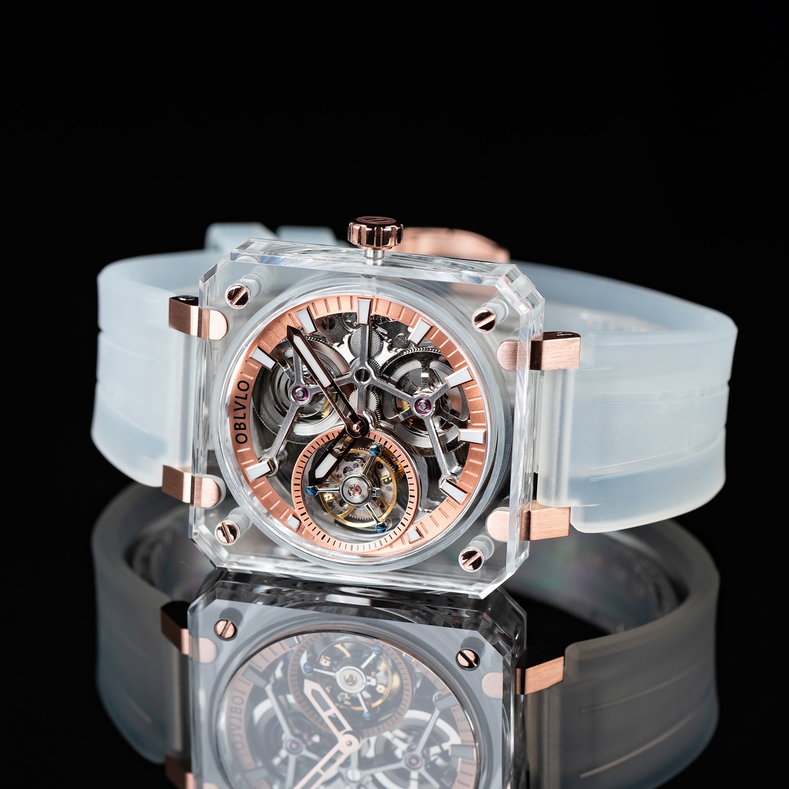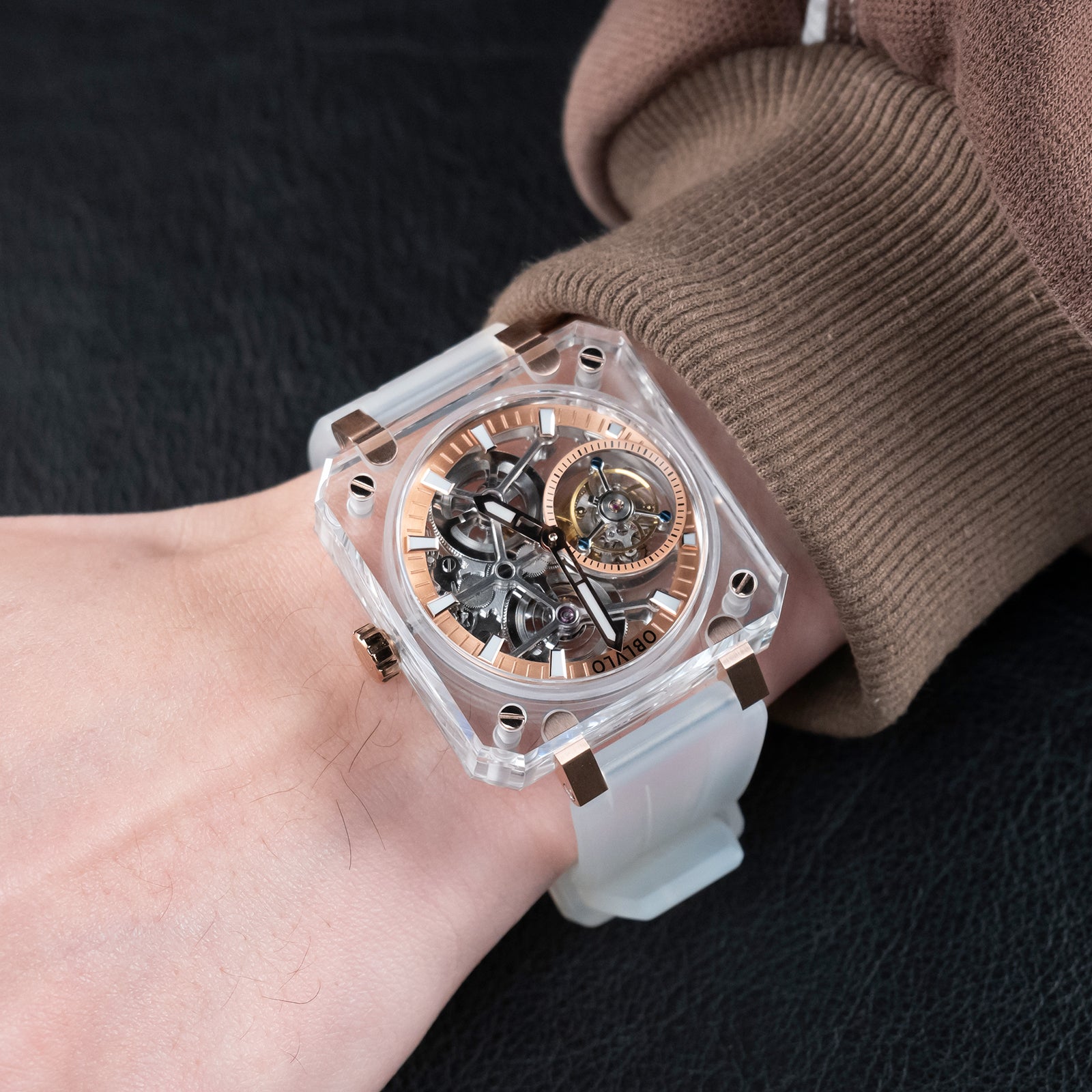 Dial Design: Rose Gold Dial & The square crystal case is paired with a hollow dial design, Fully transparent sapphire case offers a 360-degree view of the escapement, revealing the movement's breathtaking skeletonization. Considering the practicality of night use, the watch hands are made of Swiss Super-LumiNova® super luminous paint.