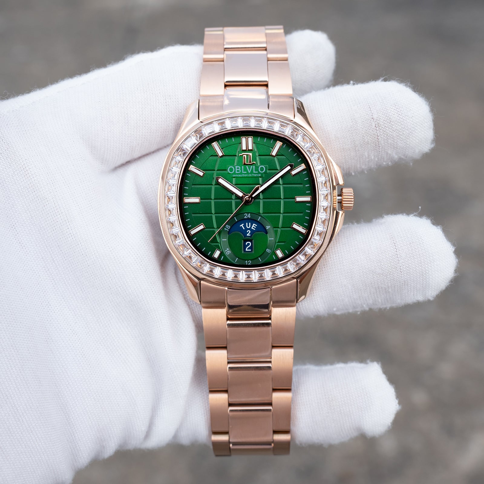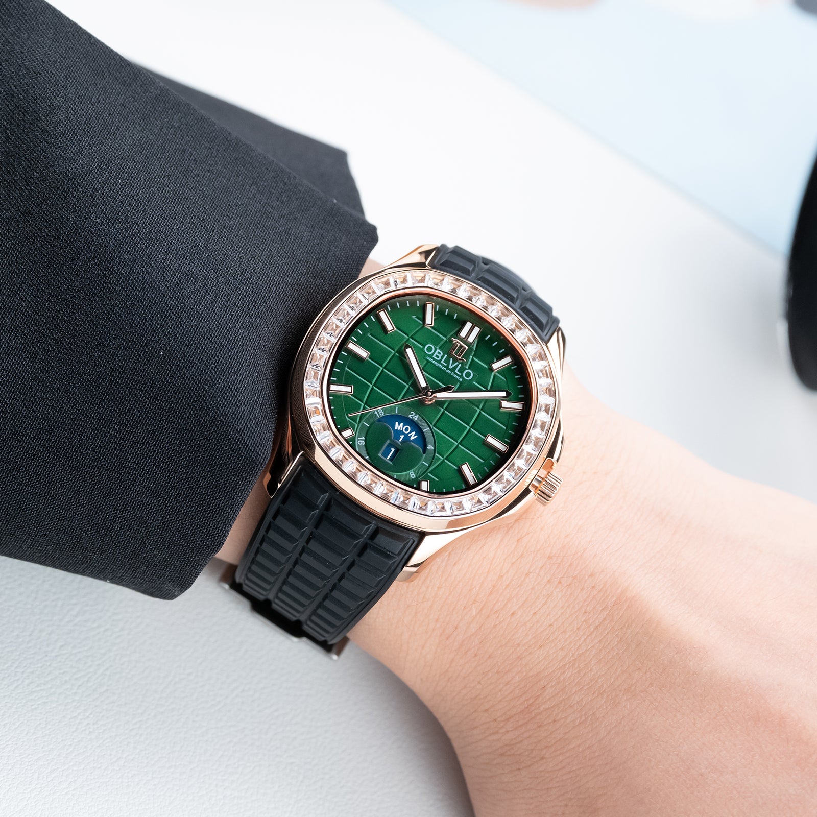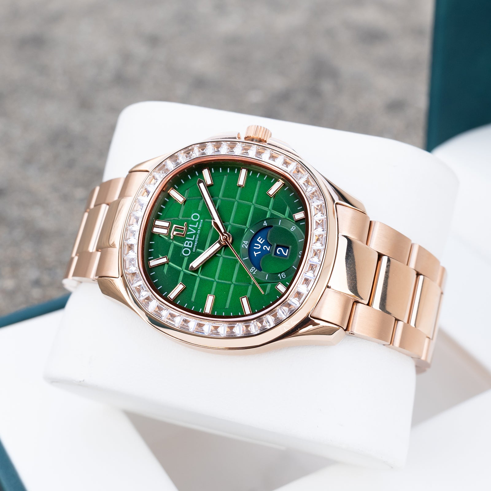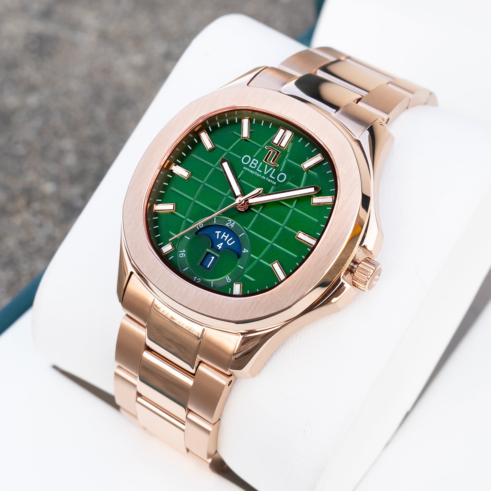 Dial Design: Green dial featuring a grid pattern texture. A striking blue date and day display window is located at 6 o'clock. The classic three-hand display, combined with the date display, makes this watch suitable for both formal and casual occasions.