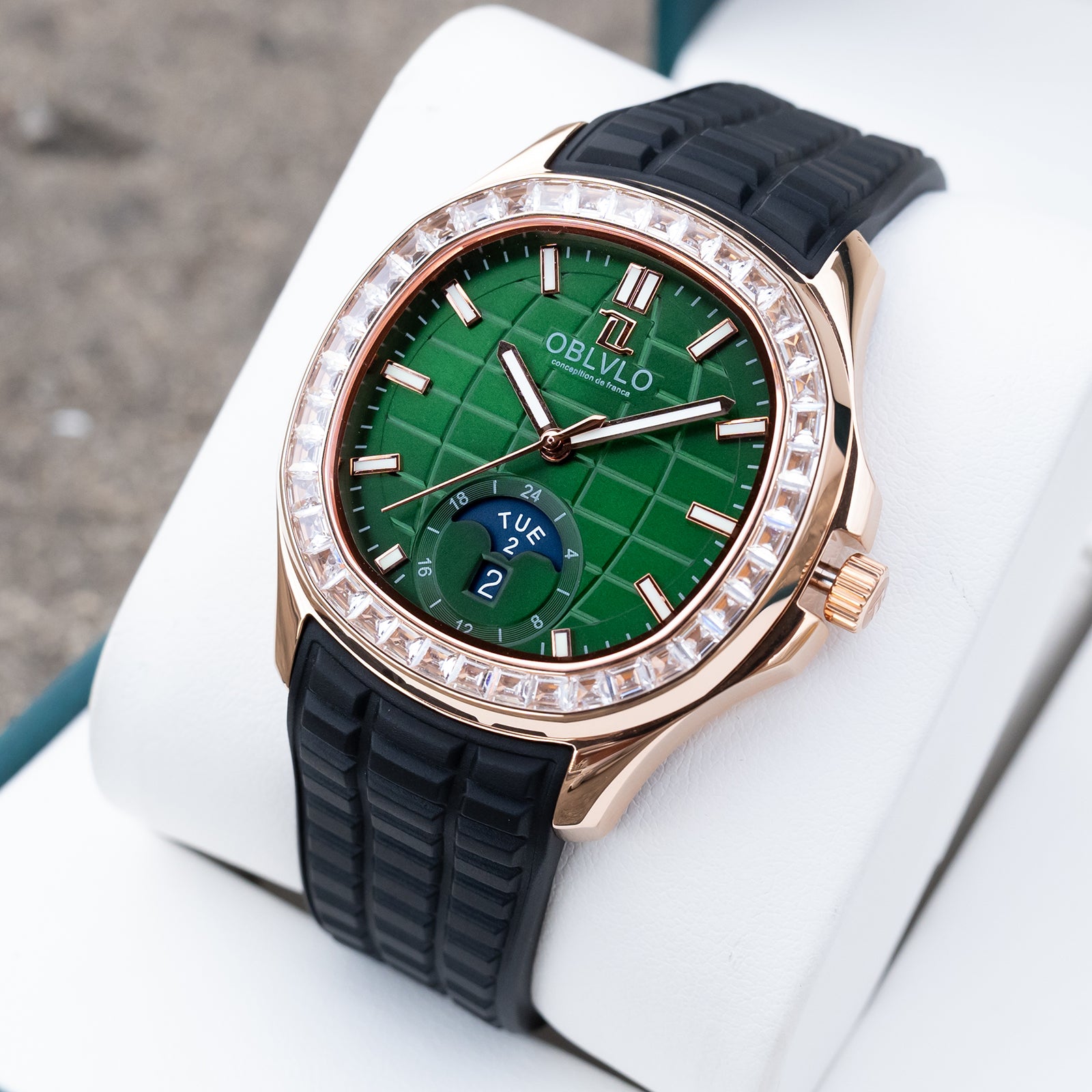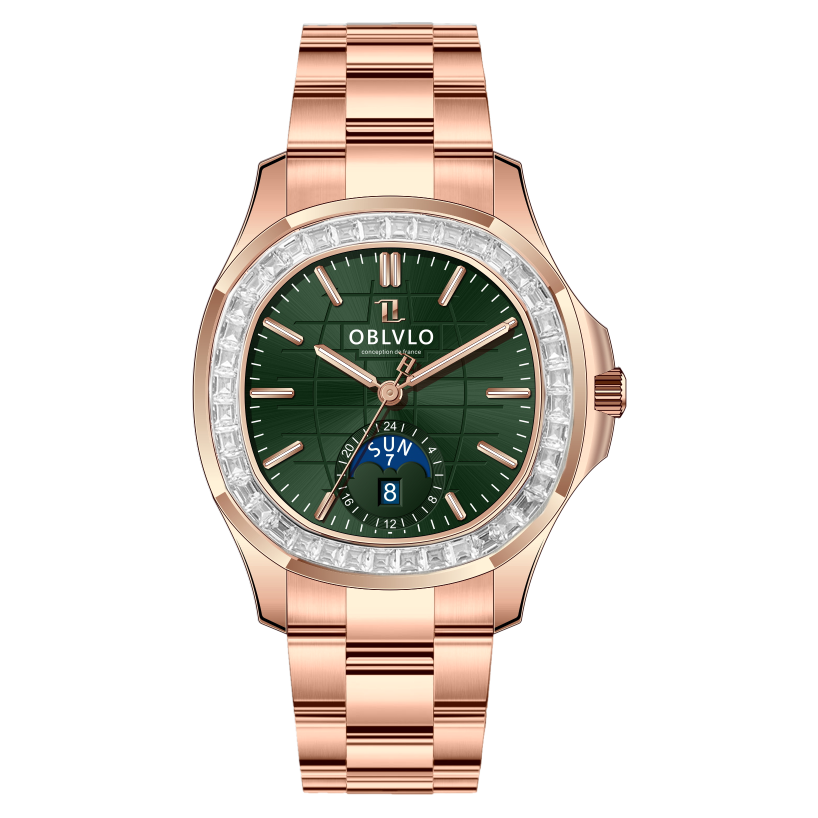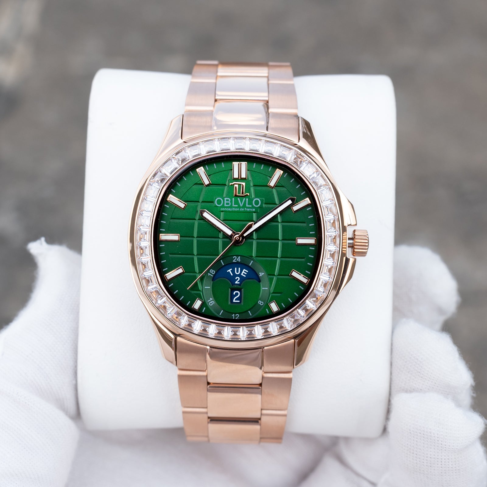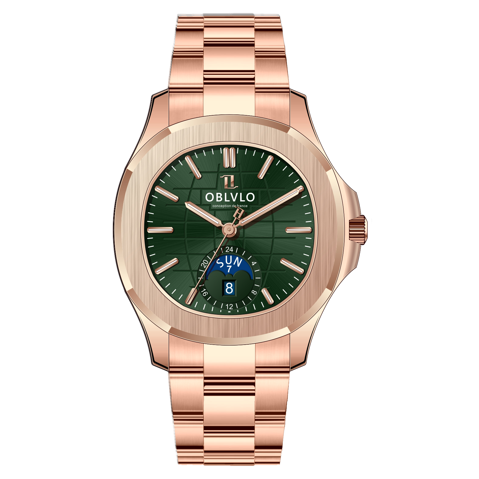 Dial Design: Green dial featuring a grid pattern texture. A striking blue date and day display window is located at 6 o'clock. The classic three-hand display, combined with the date display, makes this watch suitable for both formal and casual occasions.
