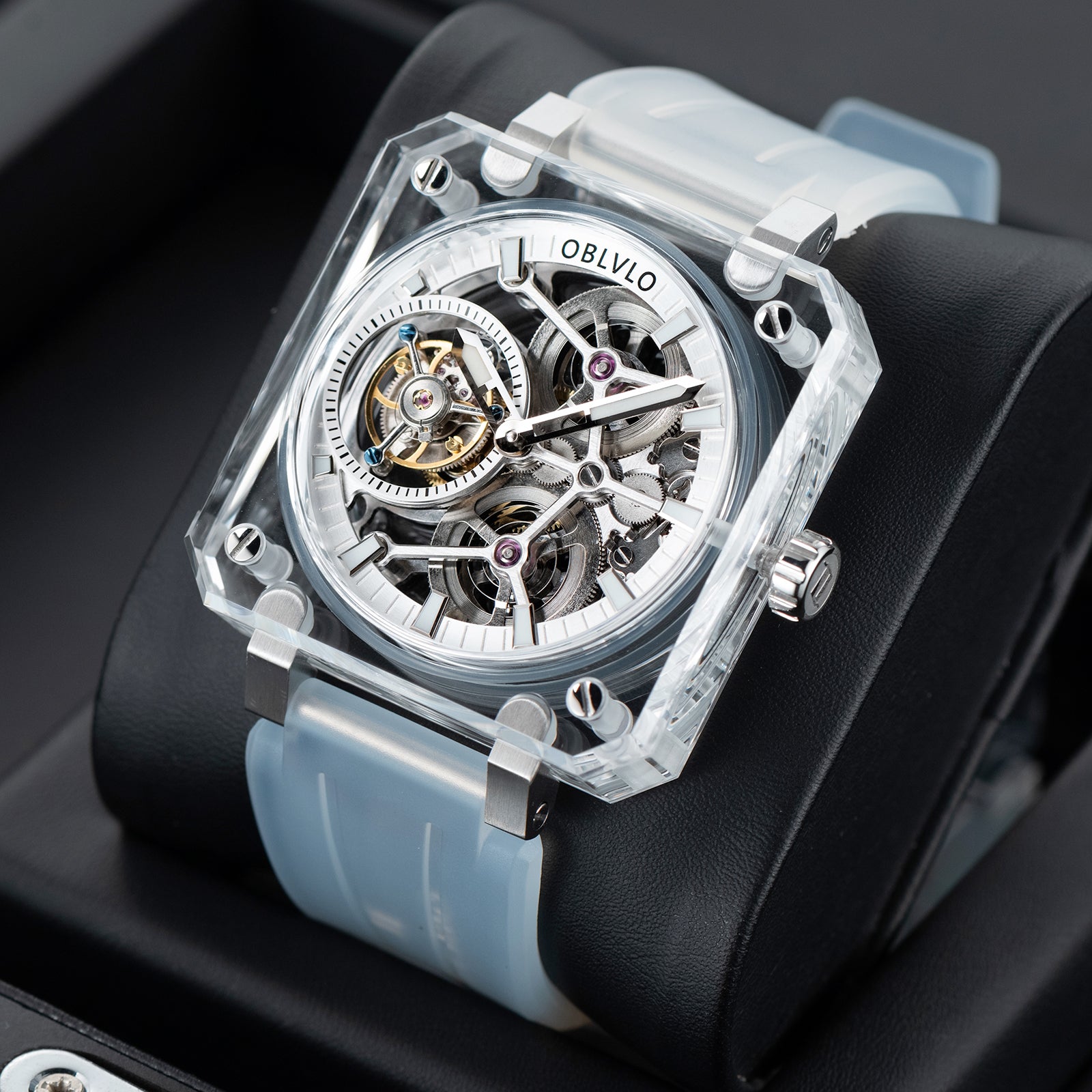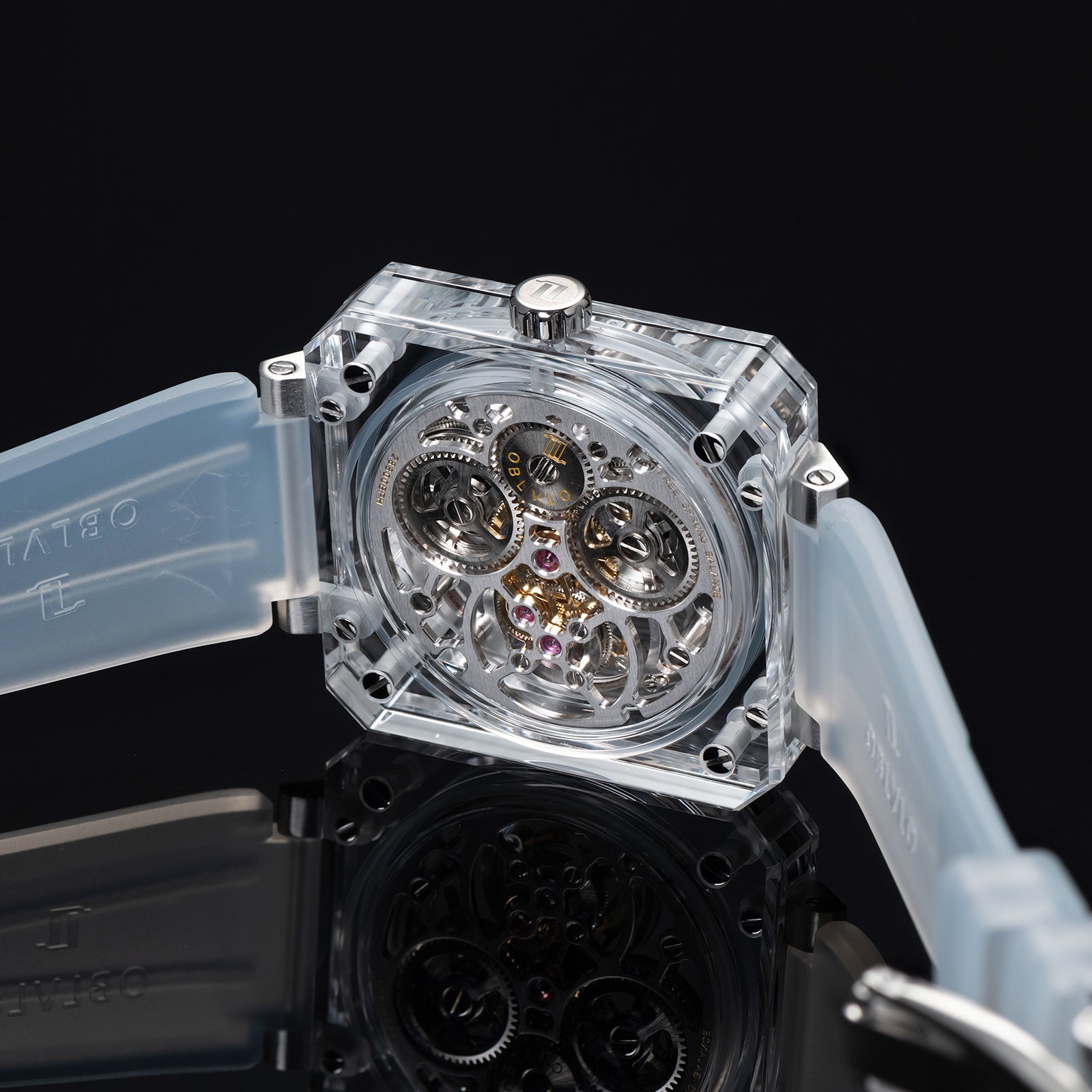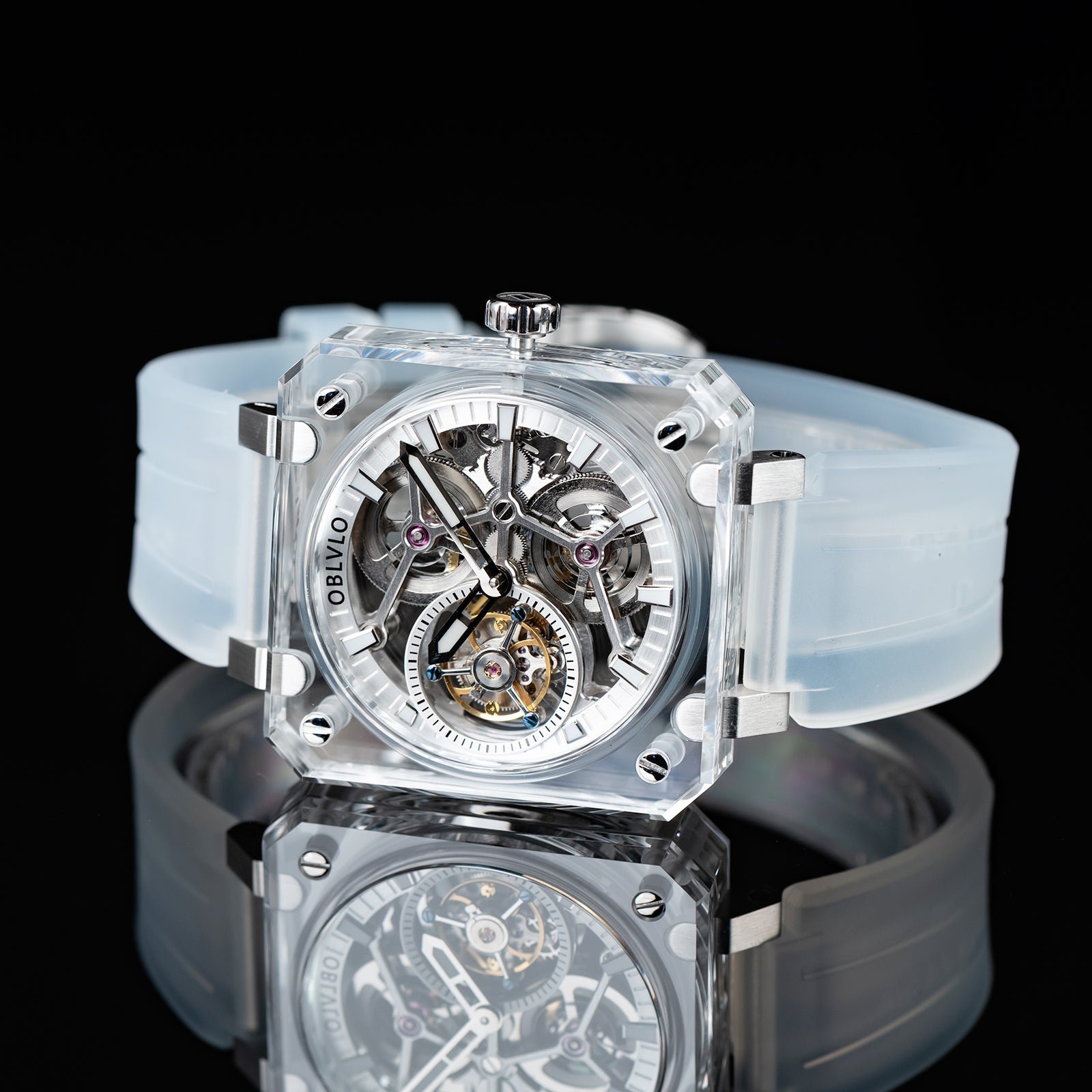 Dial Design: Silver Dial & The square crystal case is paired with a hollow dial design, Fully transparent sapphire case offers a 360-degree view of the escapement, revealing the movement's breathtaking skeletonization. Considering the practicality of night use, the watch hands are made of Swiss Super-LumiNova® super luminous paint.