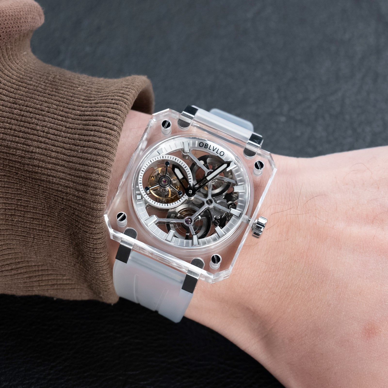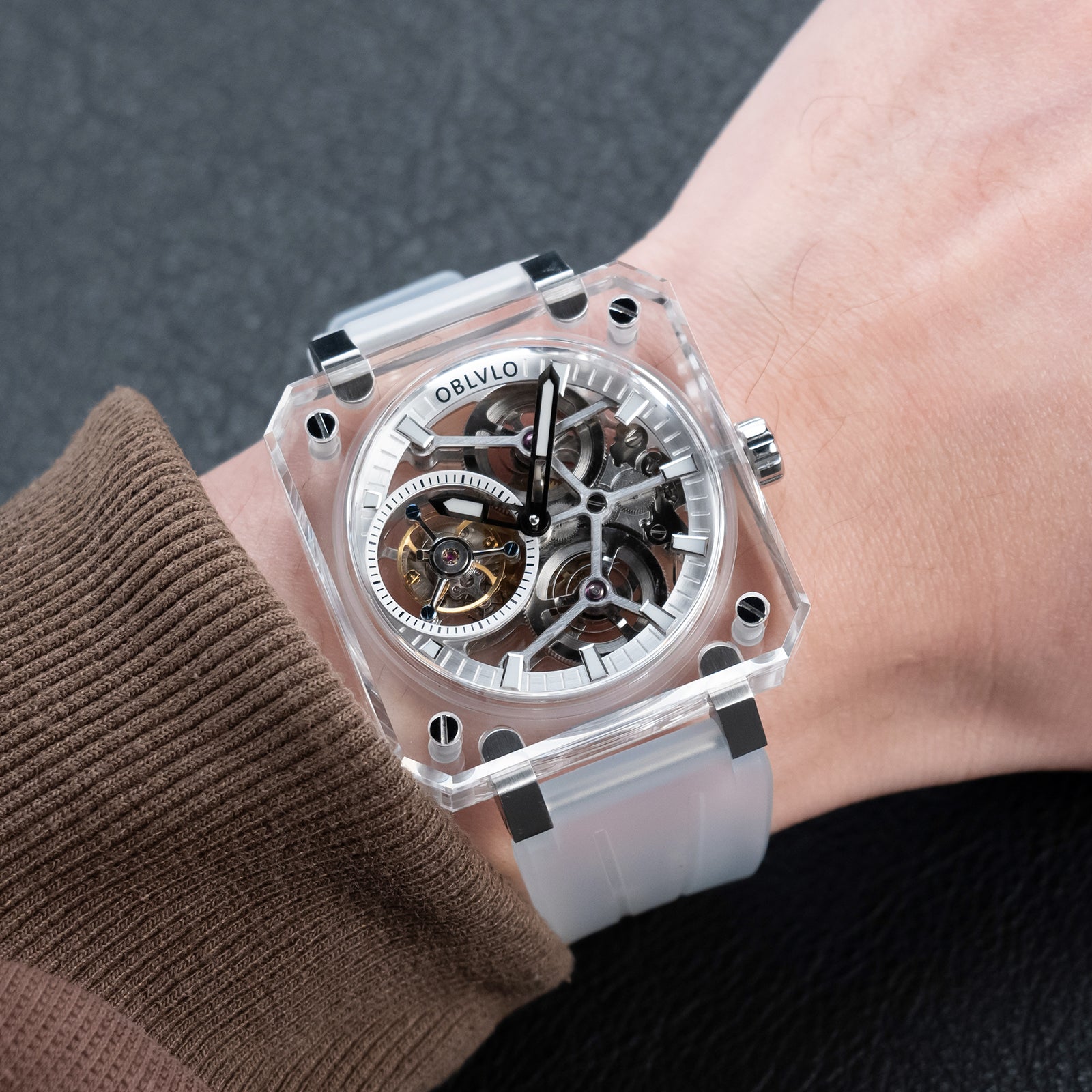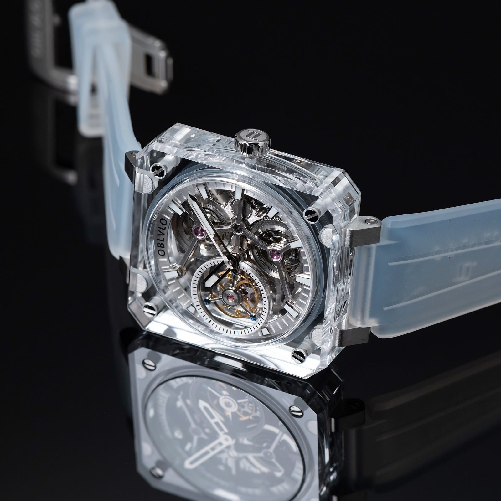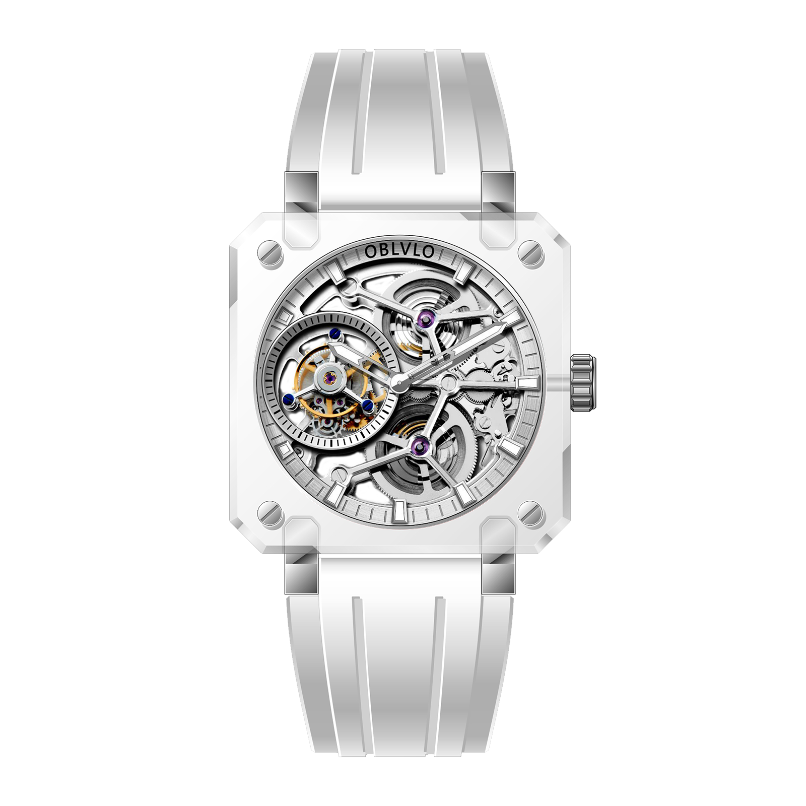 Dial Design: Silver Dial & The square crystal case is paired with a hollow dial design, Fully transparent sapphire case offers a 360-degree view of the escapement, revealing the movement's breathtaking skeletonization. Considering the practicality of night use, the watch hands are made of Swiss Super-LumiNova® super luminous paint.