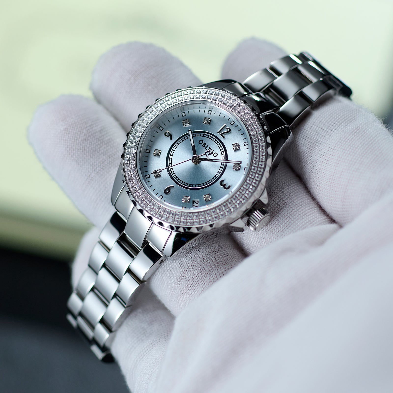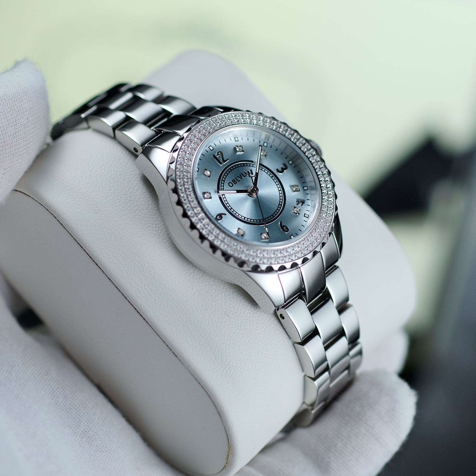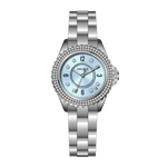 Dial Design: ICE Blue sunburst & diamond-set dial exudes elegance.The whole watch bezel is inlaid with bright diamonds, fashion and luxury.