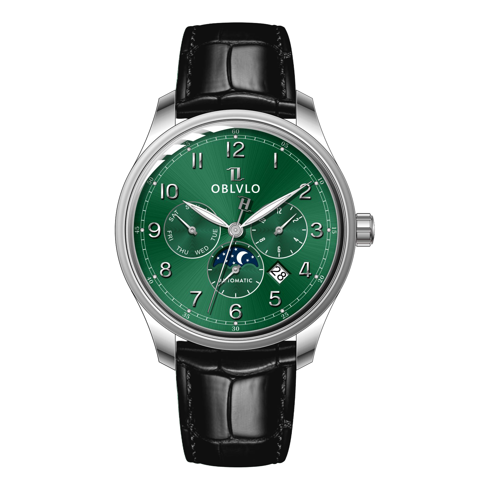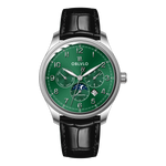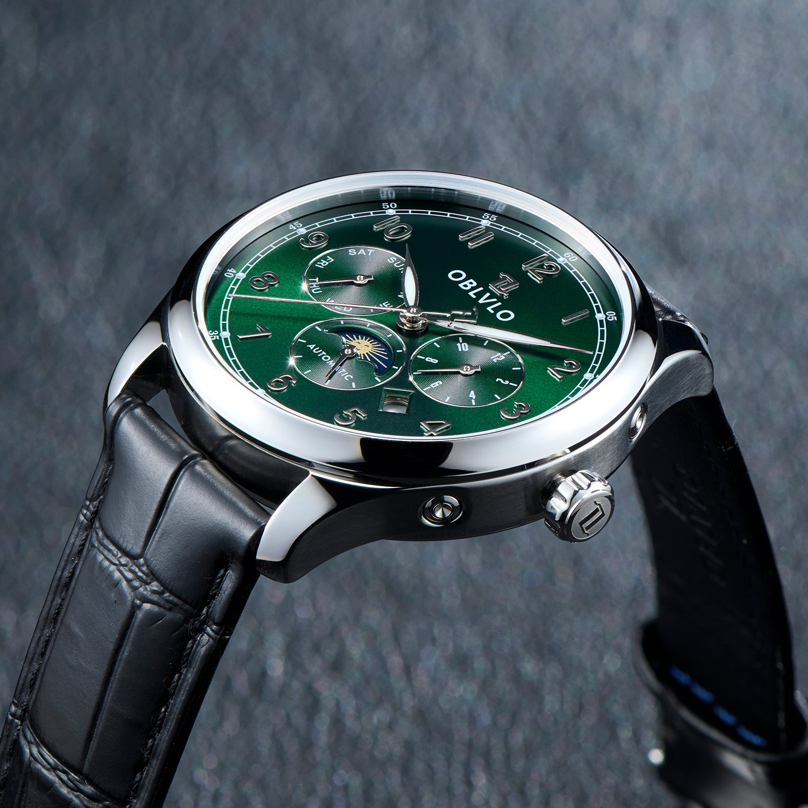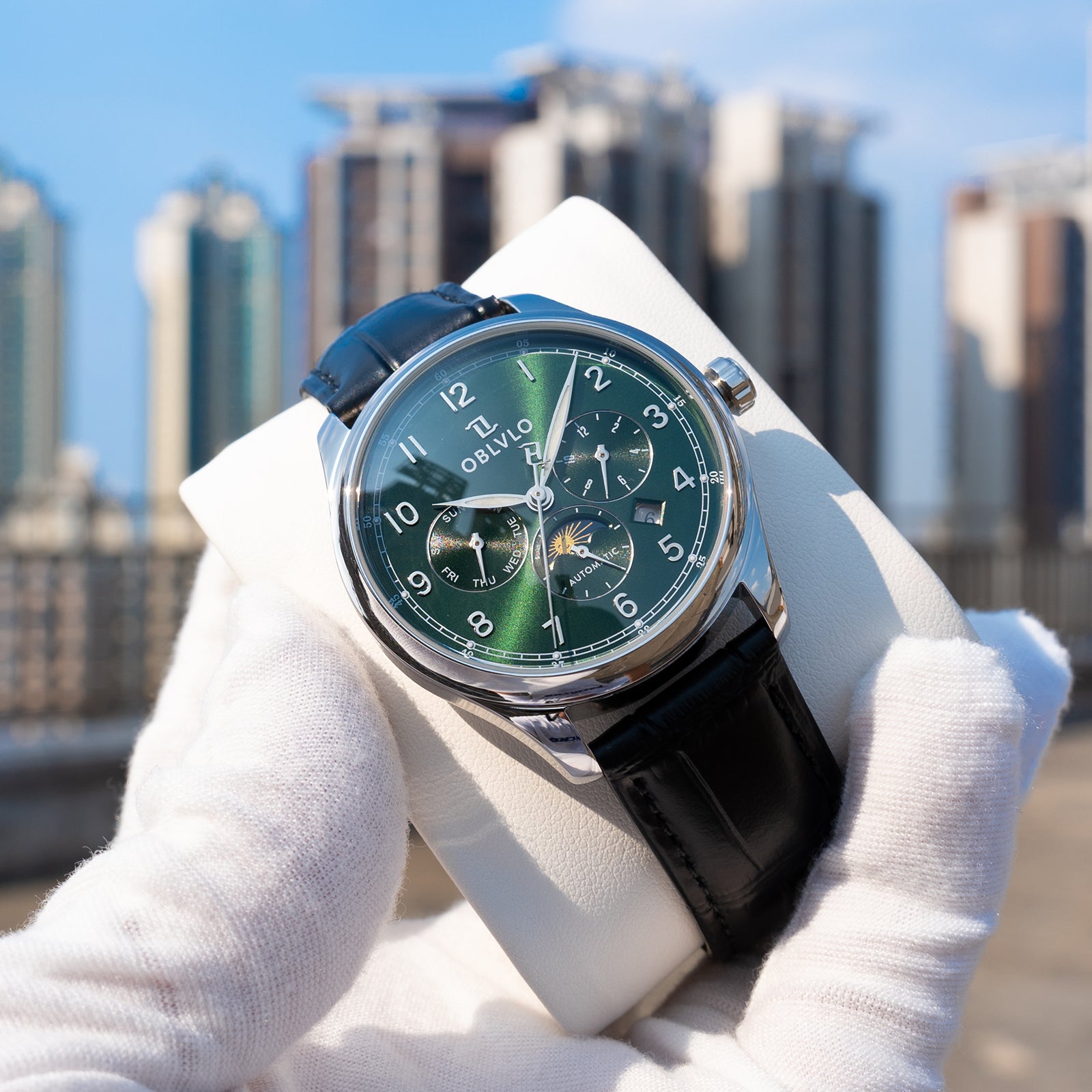 Dial Design: The Green Multi-function Dial: Features an intricate moon and sun phase indicator at 6 o'clock position, adding both functionality and visual appeal. With classic and simple as the keynote, this watch showcases nature and leisure, polished by age, exuding a unique temperament of chic without losing texture.
