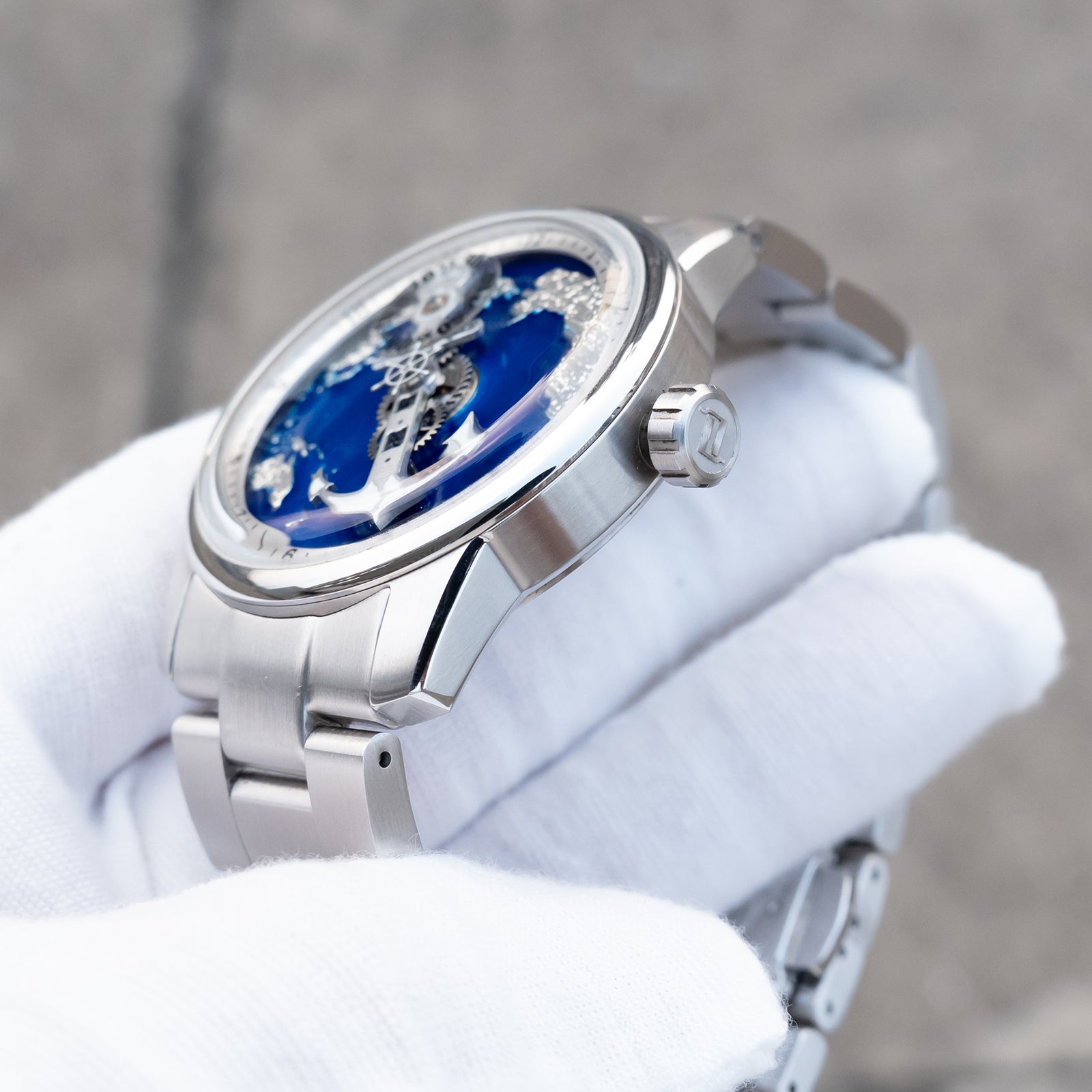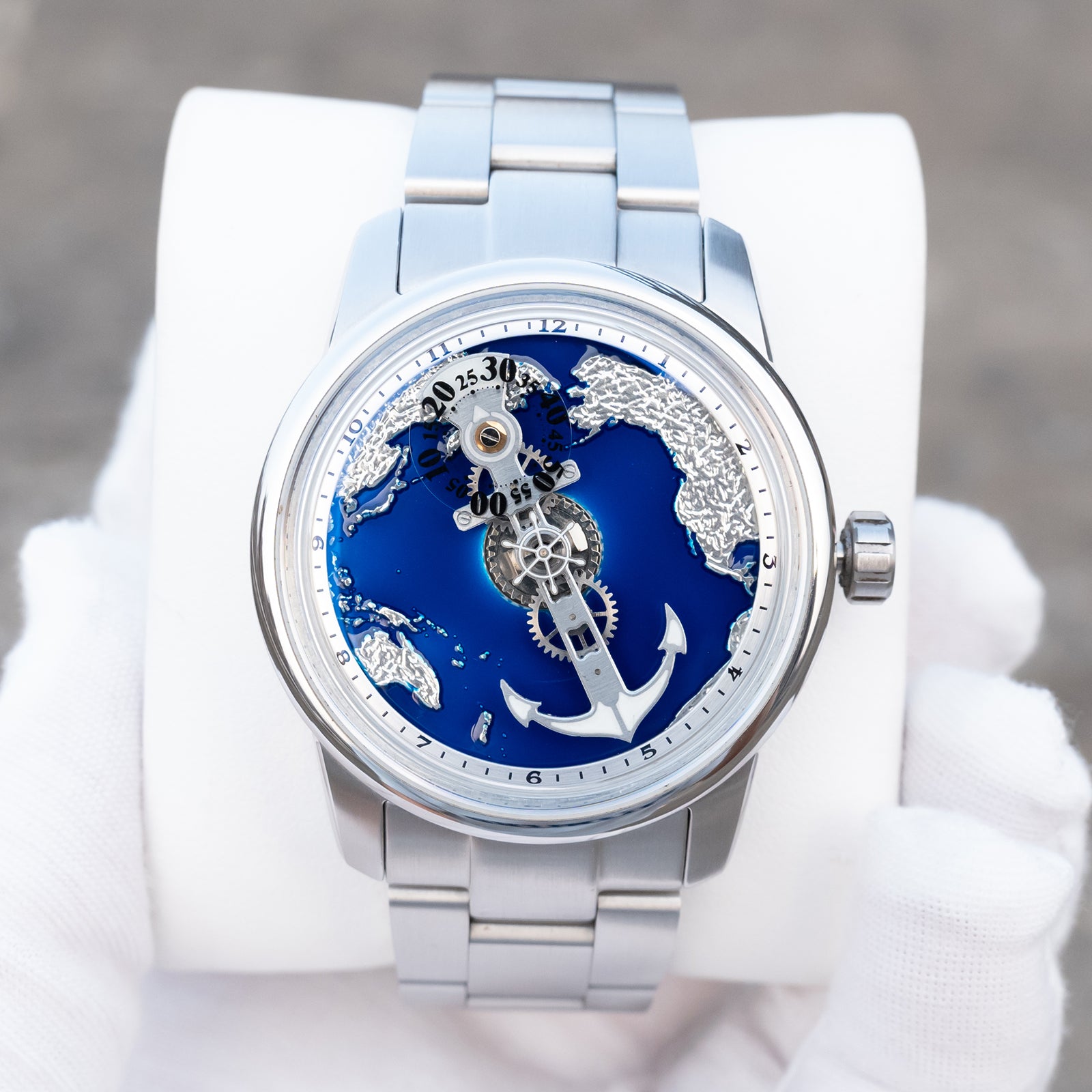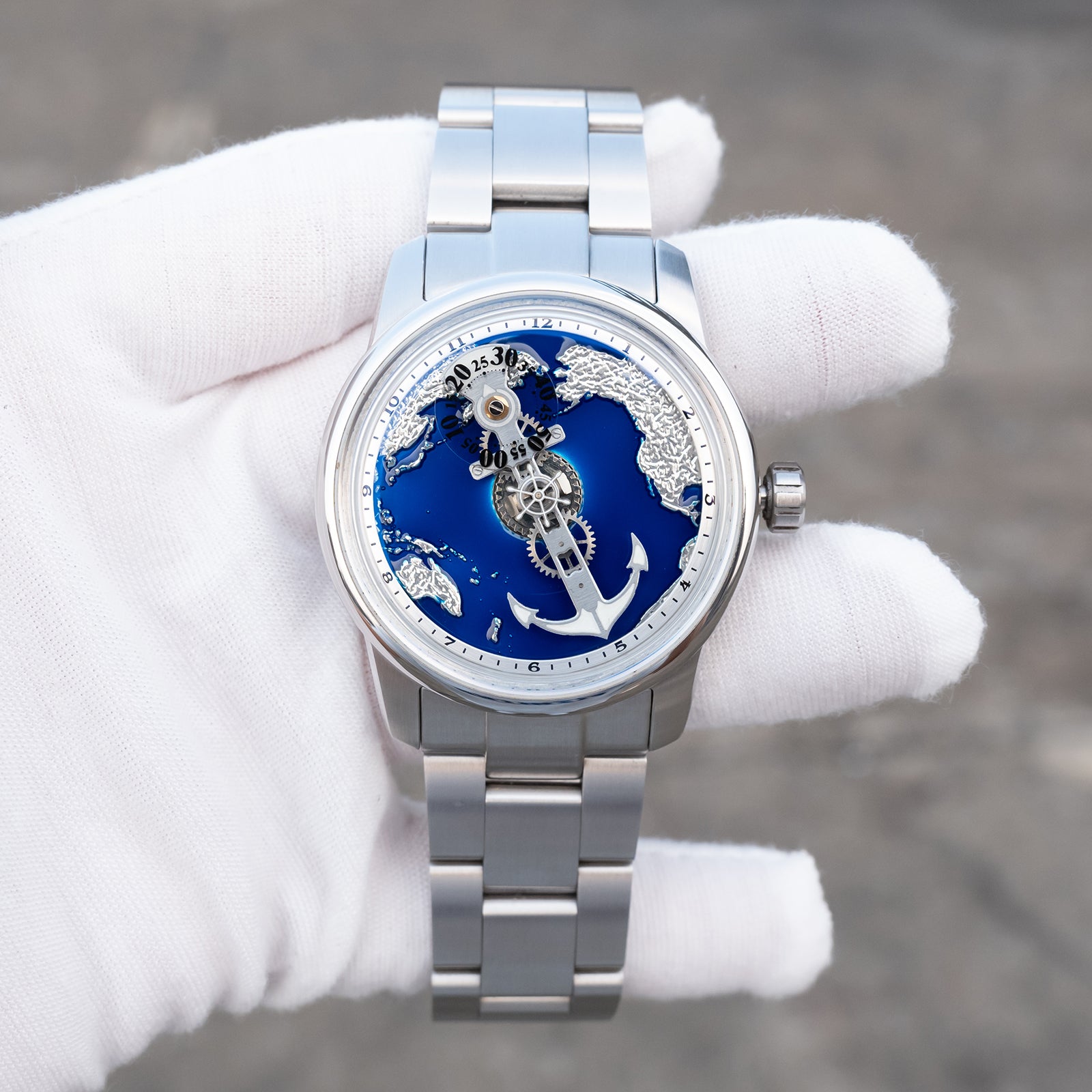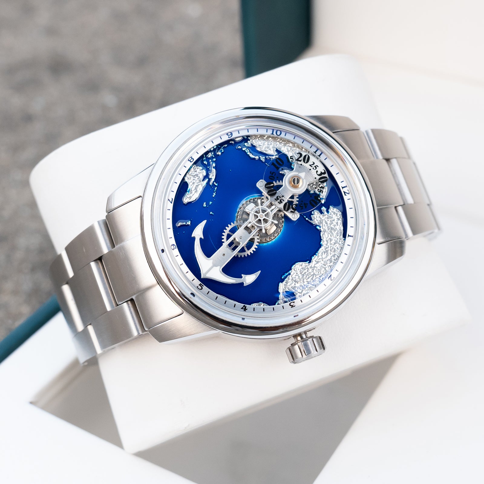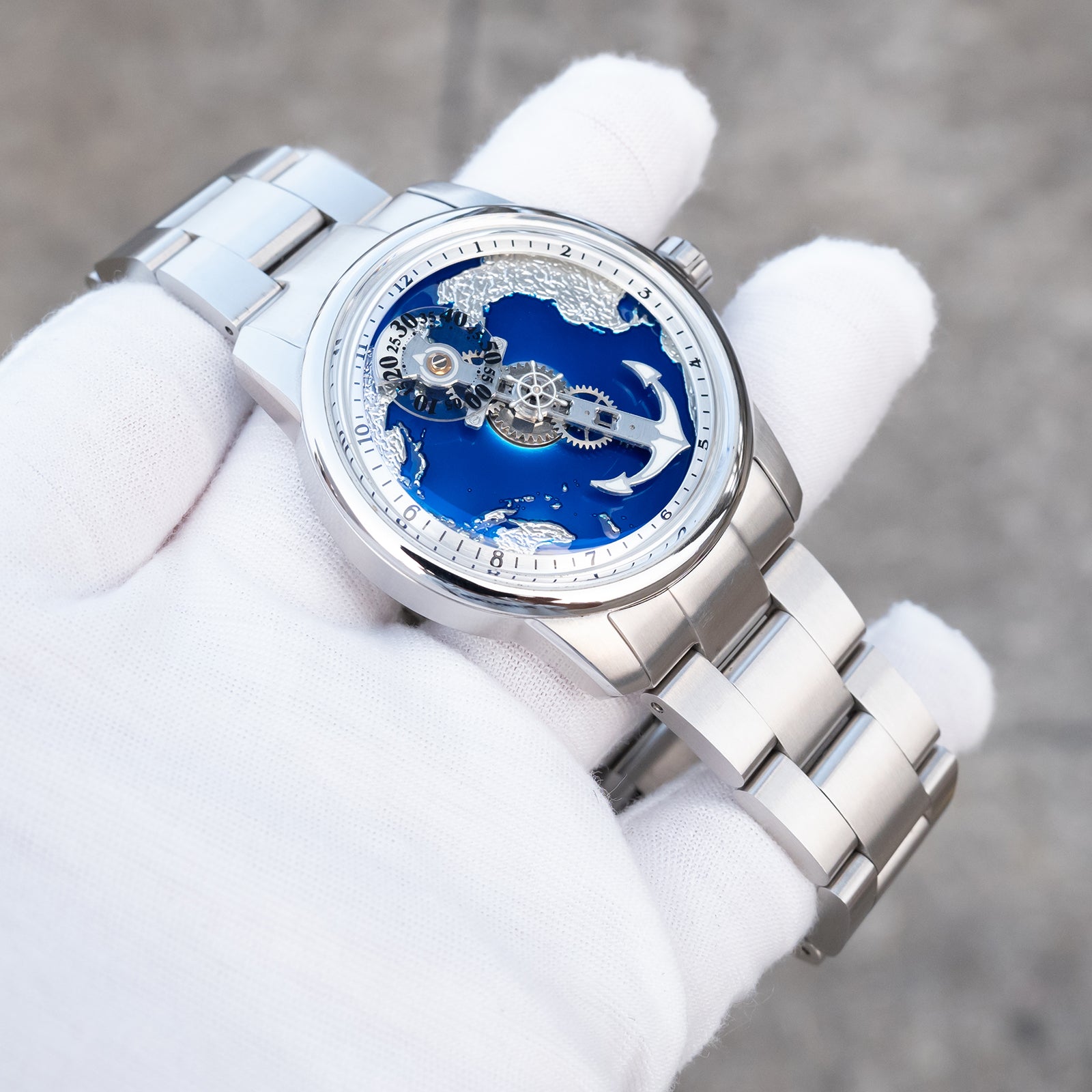 Dial: Use high-grade Blue Cold Enamel Dial, Unique Nautical steering wheel and anchor watch hands and super luminous