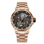 The Automatic Skeleton Rose Gold Watch, with its warm and luxurious hue, has become increasingly popular in men's watches. Its unique blend of gold, copper, and silver creates a distinctive and sophisticated appearance. Rose gold watches are versatile, complementing a wide array of outfits and occasions. When combined with the intricacy of skeleton dials and the precision of automatic movements, rose gold creates a harmonious synergy that elevates the luxurious appeal of the timepiece.