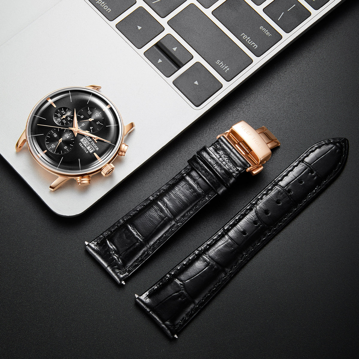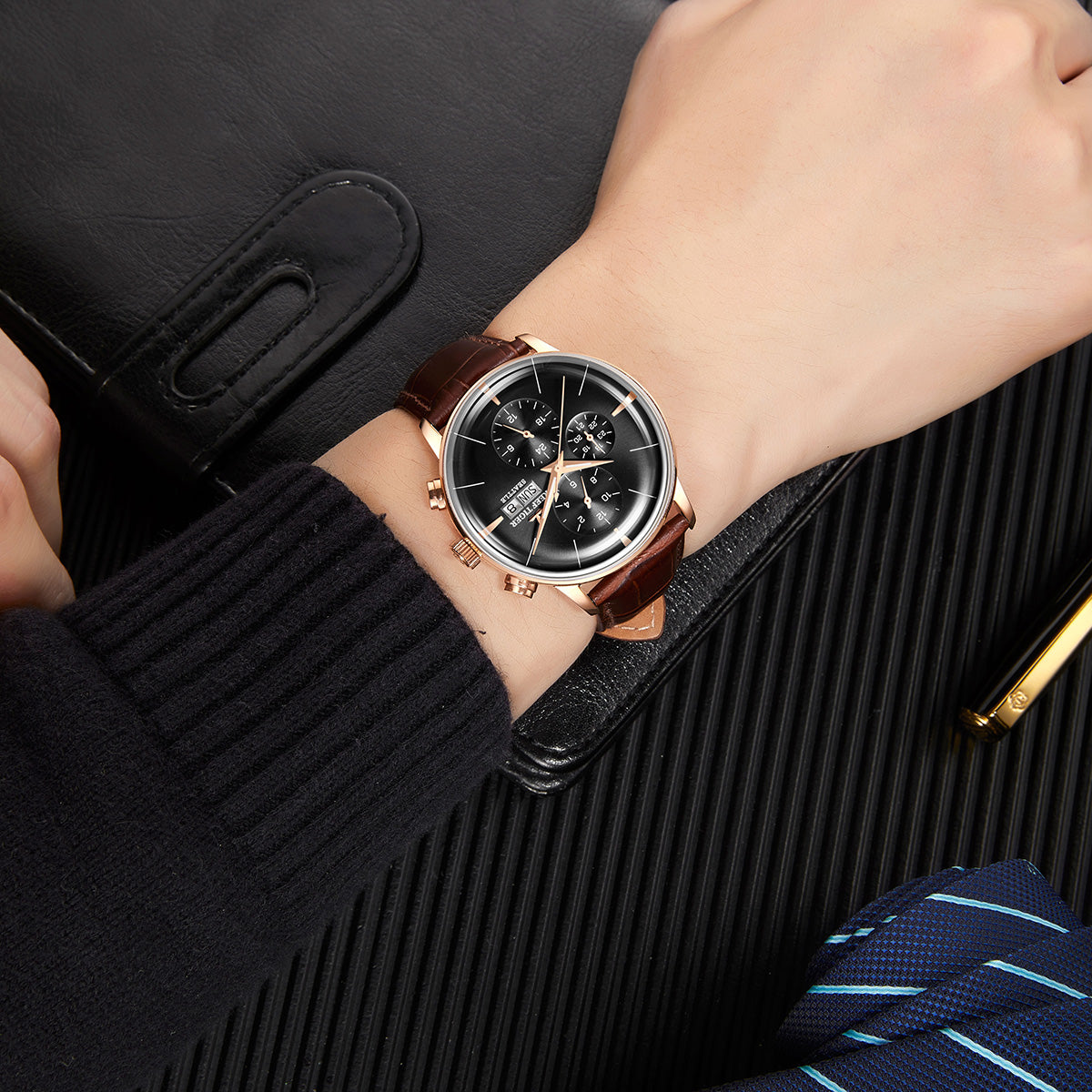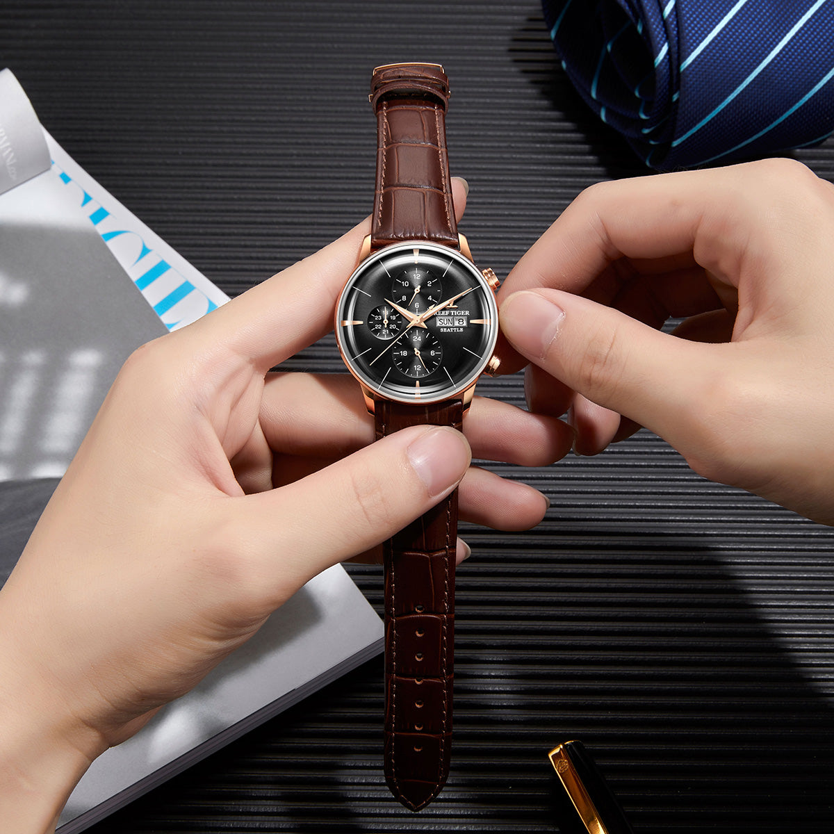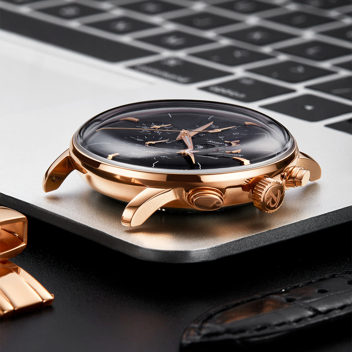 The dress watches features a classic round case made of 316 stainless steel plated with luxurious rose gold. The black dial adds a touch of sophistication, making it suitable for both formal and casual occasions. The timepiece is powered by a reliable Hangzhou 2350 movement, ensuring accurate timekeeping.