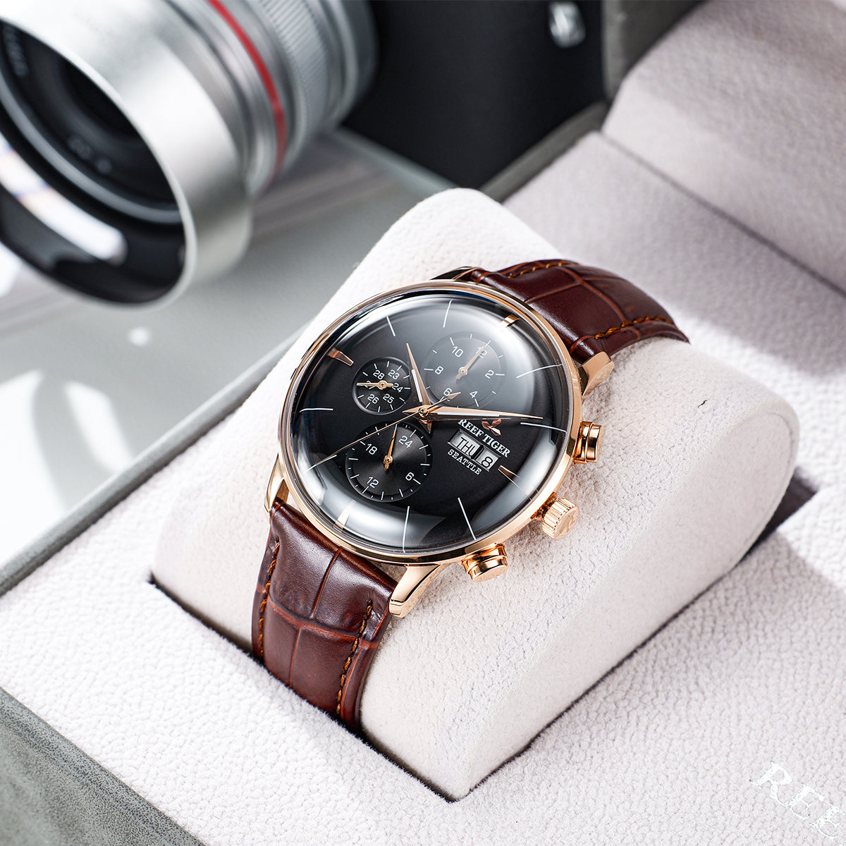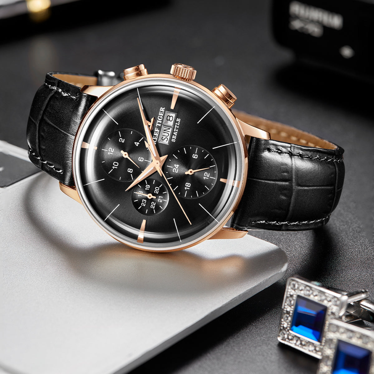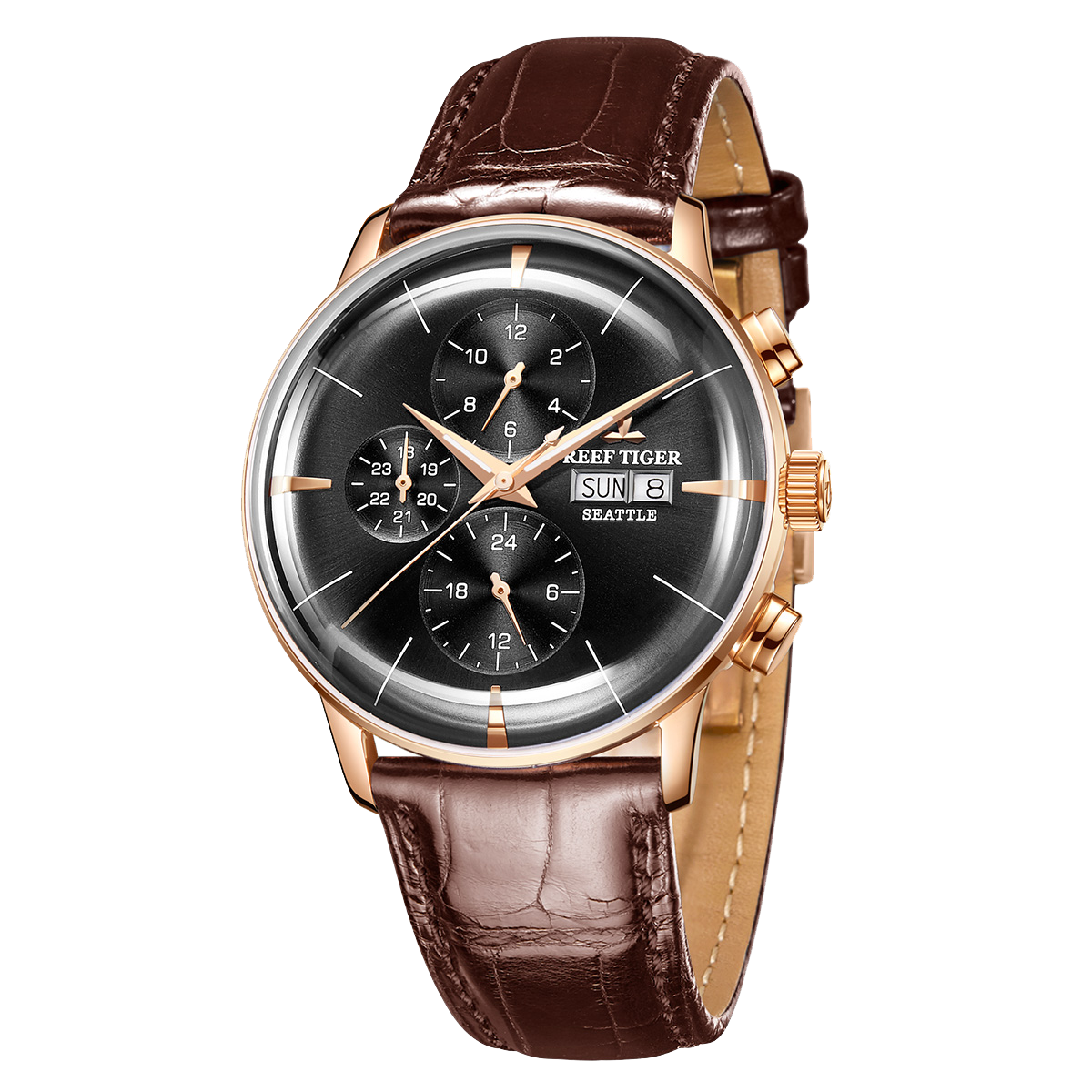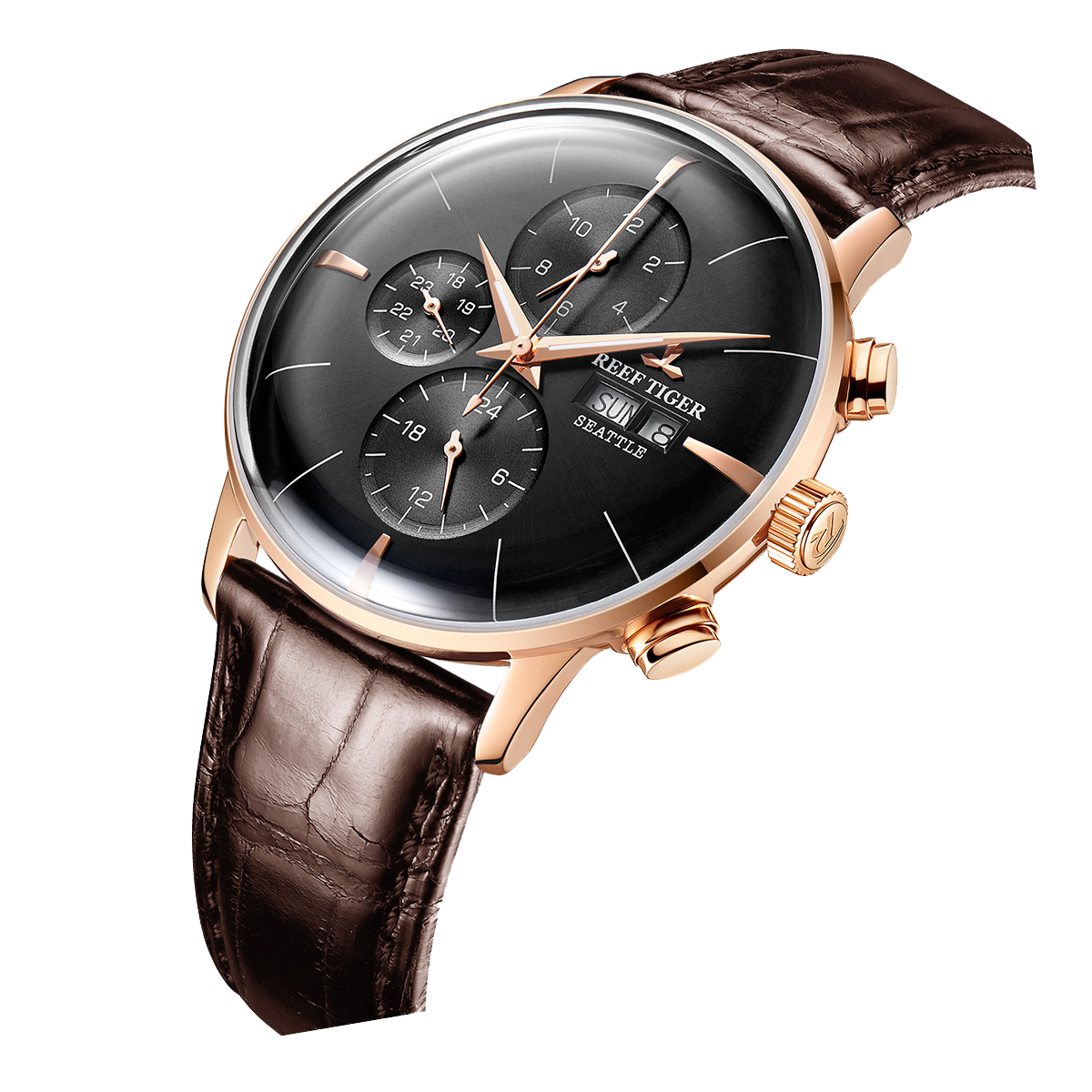 The exquisite Luxury Rose Gold Automatic Dress Chronograph Watch from Reef Tiger Seattle Chiefs, the Model No. RGA1699-01. This timepiece combines elegance and functionality with its sophisticated design and advanced features.