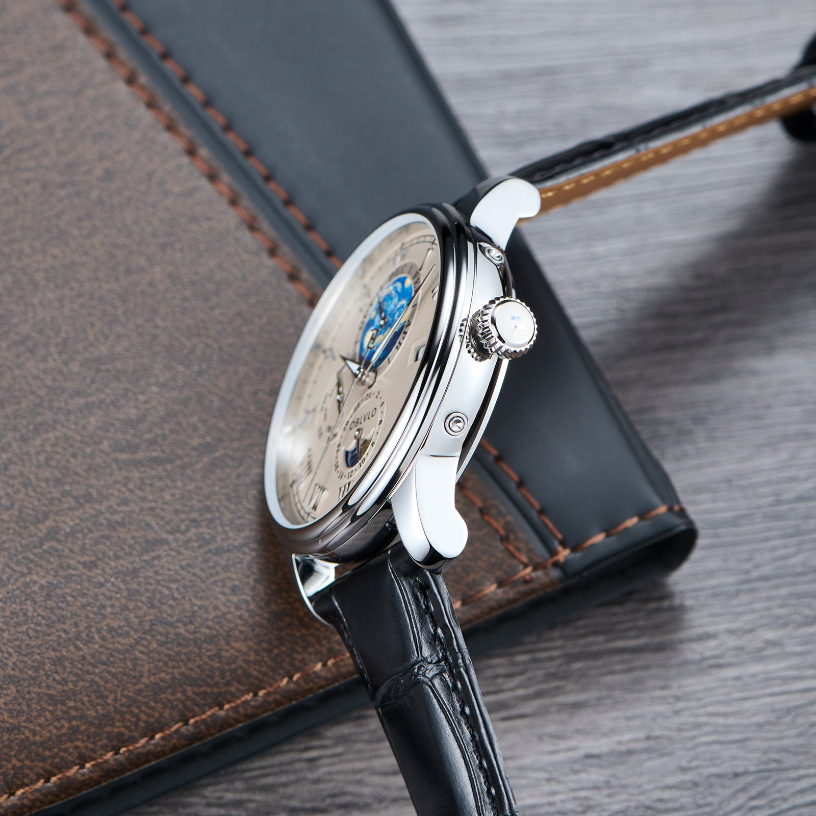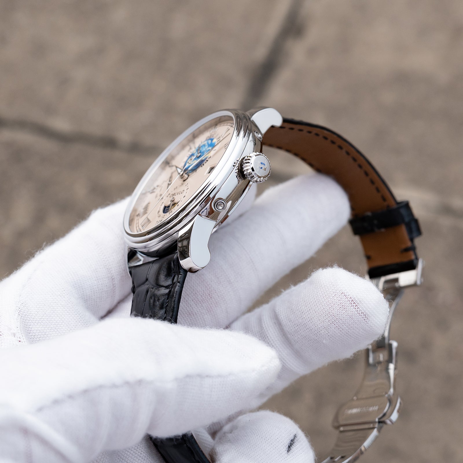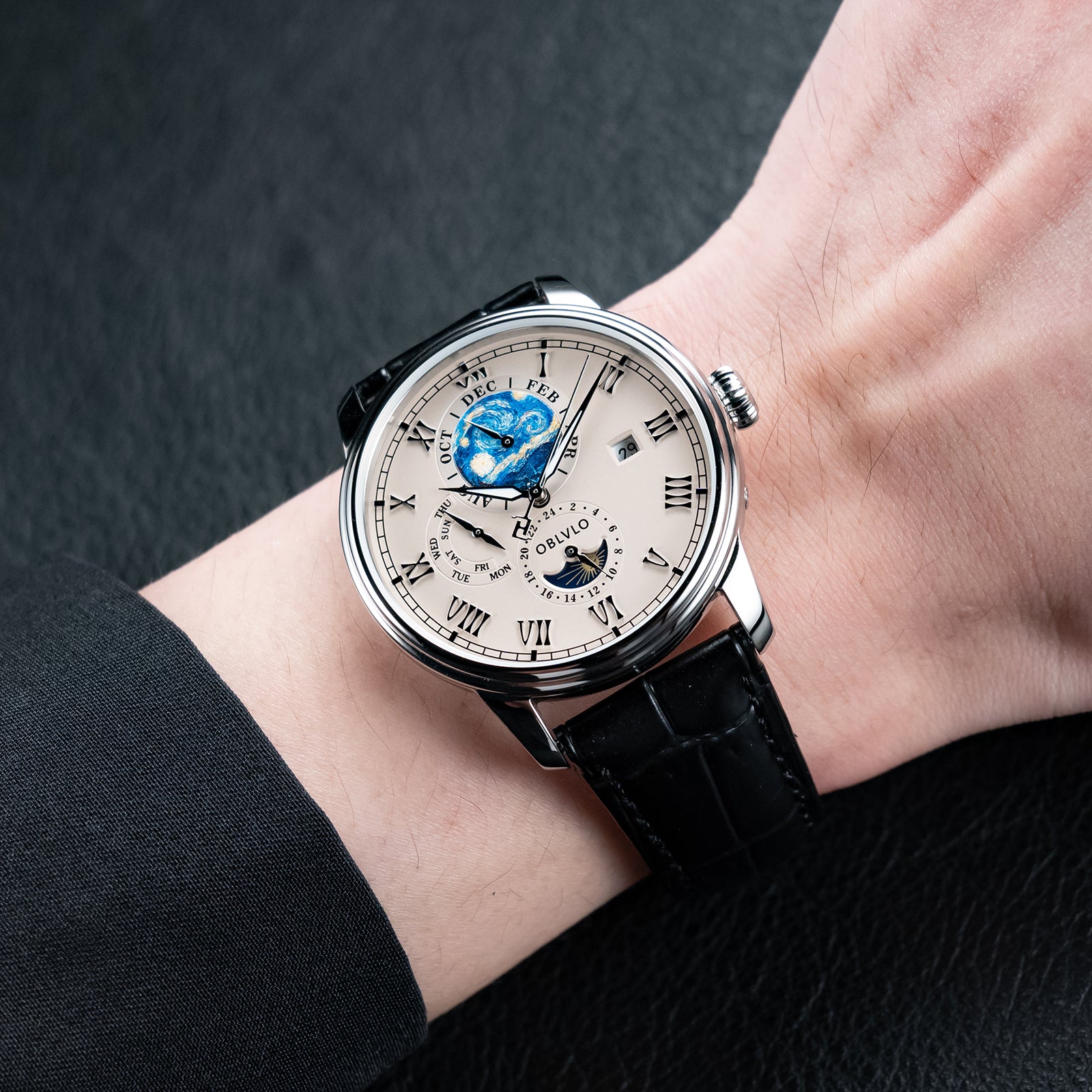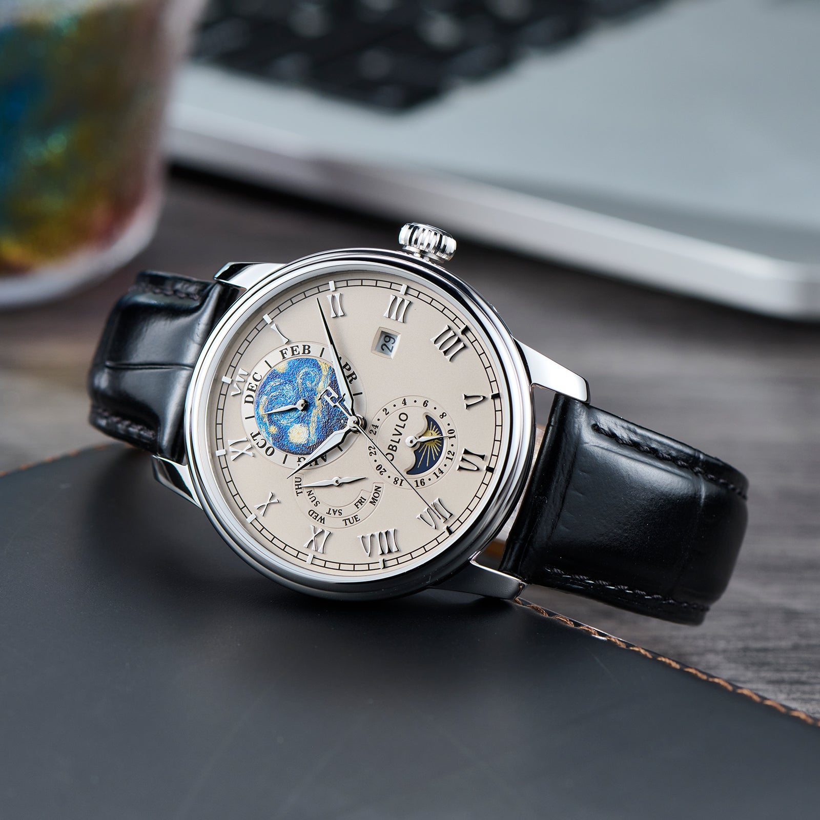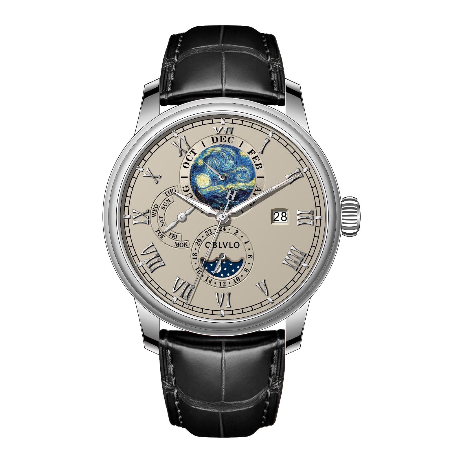 Dial Design: The Cream-colored dial incorporates grid oil pressure technology inherited,The small dials at 6 and 12 o'clock features a stunning Starry Night-inspired design with a Displays date, Roman numeral hour markers and moon phase complications for comprehensive time and calendar tracking!